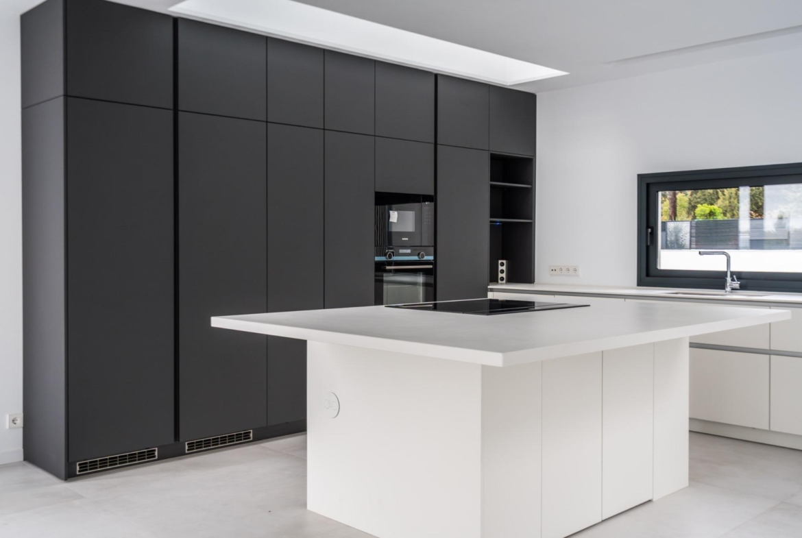 En la planta principal, el diseño moderno se combina con materiales nobles y acabados de lujo, creando un ambiente sofisticado y acogedor. El amplio salón-comedor con chimenea central se abre a través de grandes ventanales de cristal hacia el jardín, las terrazas y la piscina, generando una sensación de continuidad y conexión con el exterior. La cocina, con un estilo vanguardista y líneas minimalistas, destaca por su isla central y por la abundante luz natural que inunda el espacio gracias a los grandes ventanales. Es un espacio pensado tanto para el disfrute diario como para ocasiones especiales. En esta planta también se ubican un aseo de cortesía y un dormitorio en suite con gran armario empotrado, ideal para invitados o como dormitorio principal en planta.