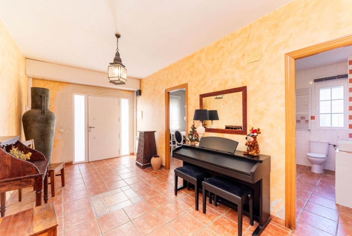 En la planta baja, al acceder a la vivienda, se dispone de un amplio hall de entrada de aproximadamente 15 m² que da paso a un despacho de unos 10 m², un baño de cerca de 9 m², un pasillo distribuidor desde el que se accede a un segundo despacho de unos 16 m², dos dormitorios matrimoniales de aproximadamente 11 m² cada uno, una lavandería de unos 9 m² y la escalera de acceso a la planta superior.