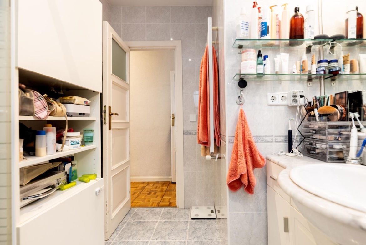 Accediendo al inmueble, el recibidor nos brinda el camino hasta el majestuoso salón, cuadrado, con dos ambientes diferenciados. Además, hace de antesala del resto de la casa para preservar la privacidad de su hogar cuando hay visitas. Atravesándolo, accedemos a la cocina, independiente, reformada y con ventanas que otorgan luz y ventilación. A continuación está el baño, amplio ya que en la reforma se eliminó el aseo existente en origen en pro de un baño y cocina más grandes. La siguiente estancia es una habitación, de tamaño doble y, al final del pasillo, una estancia de paso, que bien puede ser utilizada como despacho o como vestidor, nos ofrece la entrada a las dos habitaciones restantes (una de ellas es la principal) y a la fabulosa terraza, con vistas despejadas.