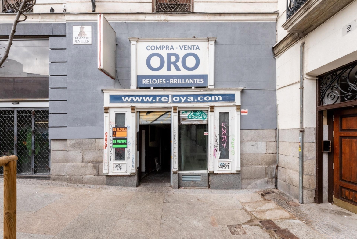 Local comercial en ubicación privilegiada en pleno centro de Madrid, justo detrás del reloj de la Puerta del Sol (Real Casa de Correos). Linda con el Almacén de Pontejos, la mercería más concurrida de Madrid, frente a la cual se forman largas colas a diario. Aunque el local pertenece a la finca de la C/ Marqués Viudo de Pontejos 2, la fachada del local da a la Plaza de Pontejos. La última actividad fue de compra y venta de oro.
