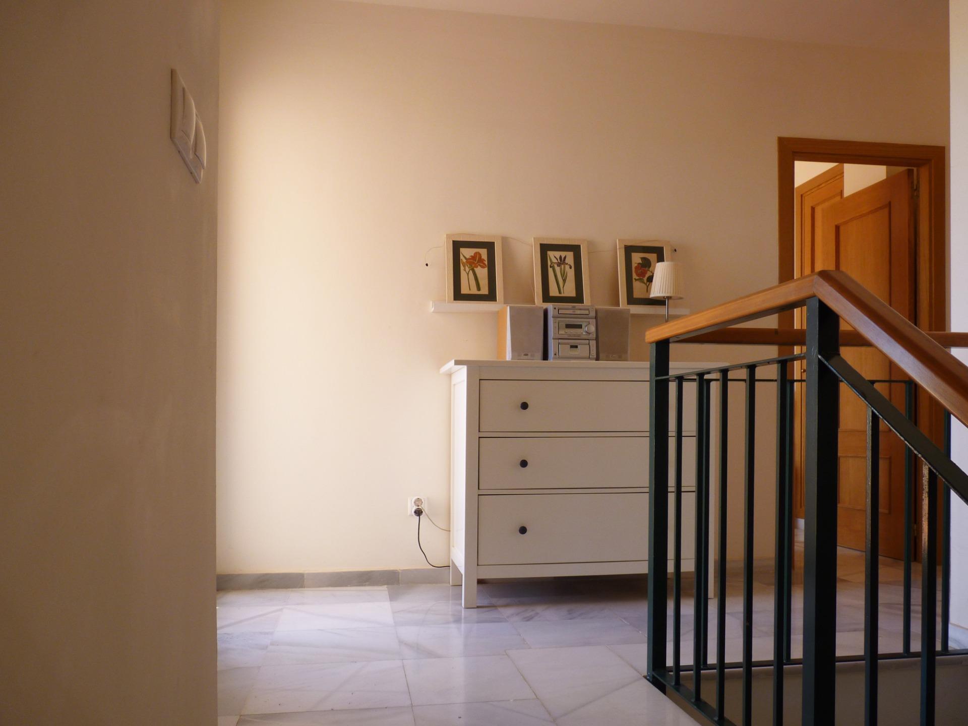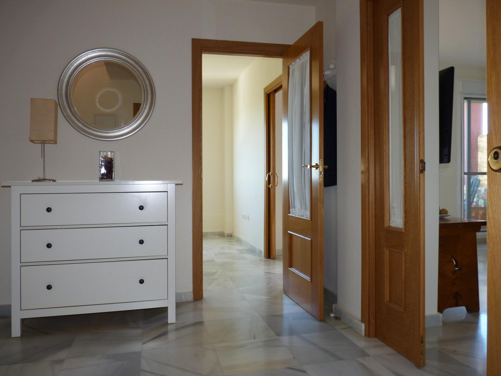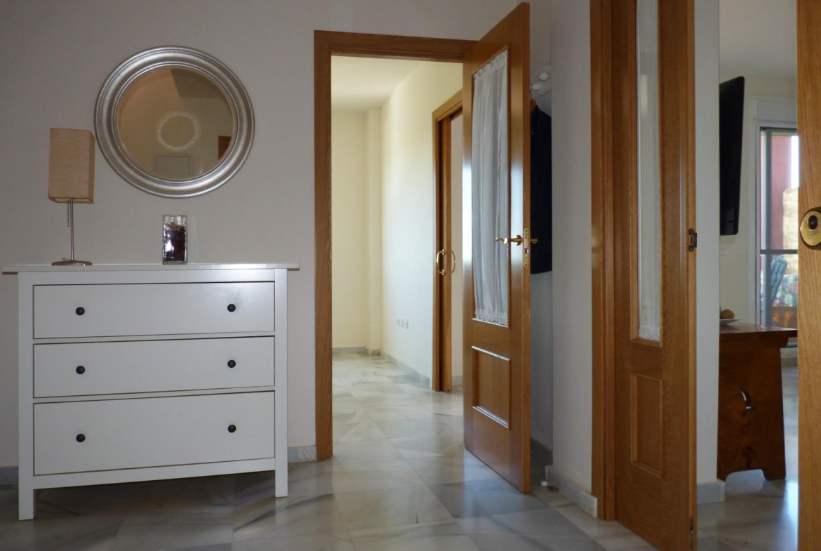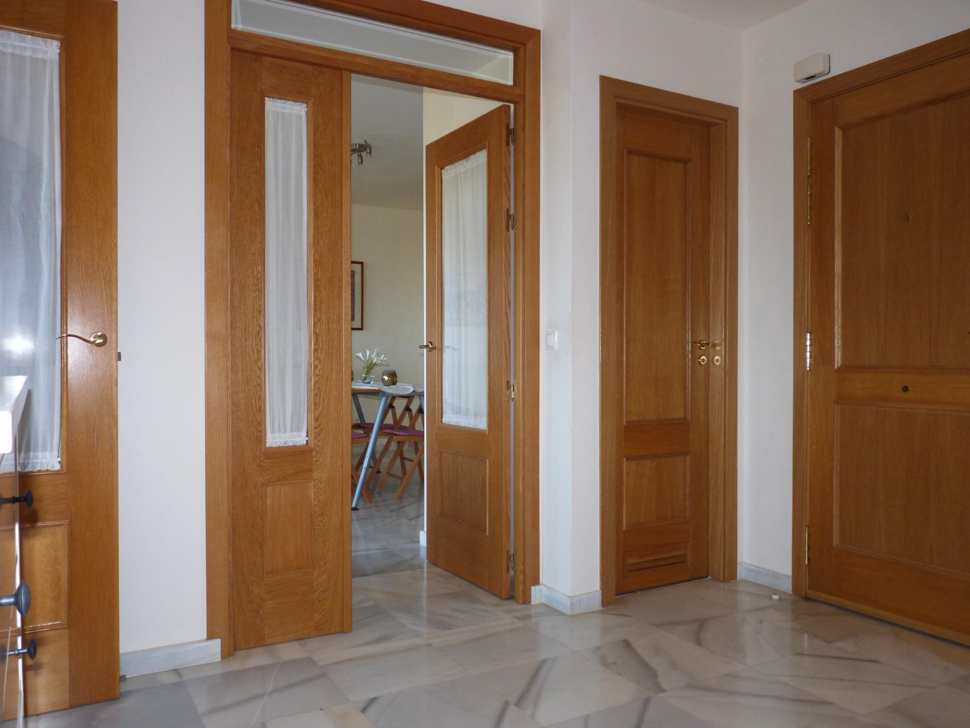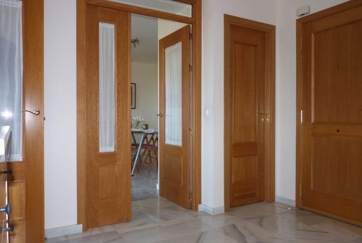 La solería de mármol en la entrada, pasillos, salón y dormitorios y la carpintería interior en roble y barnizada aportan calidez y confort a la vivienda.
