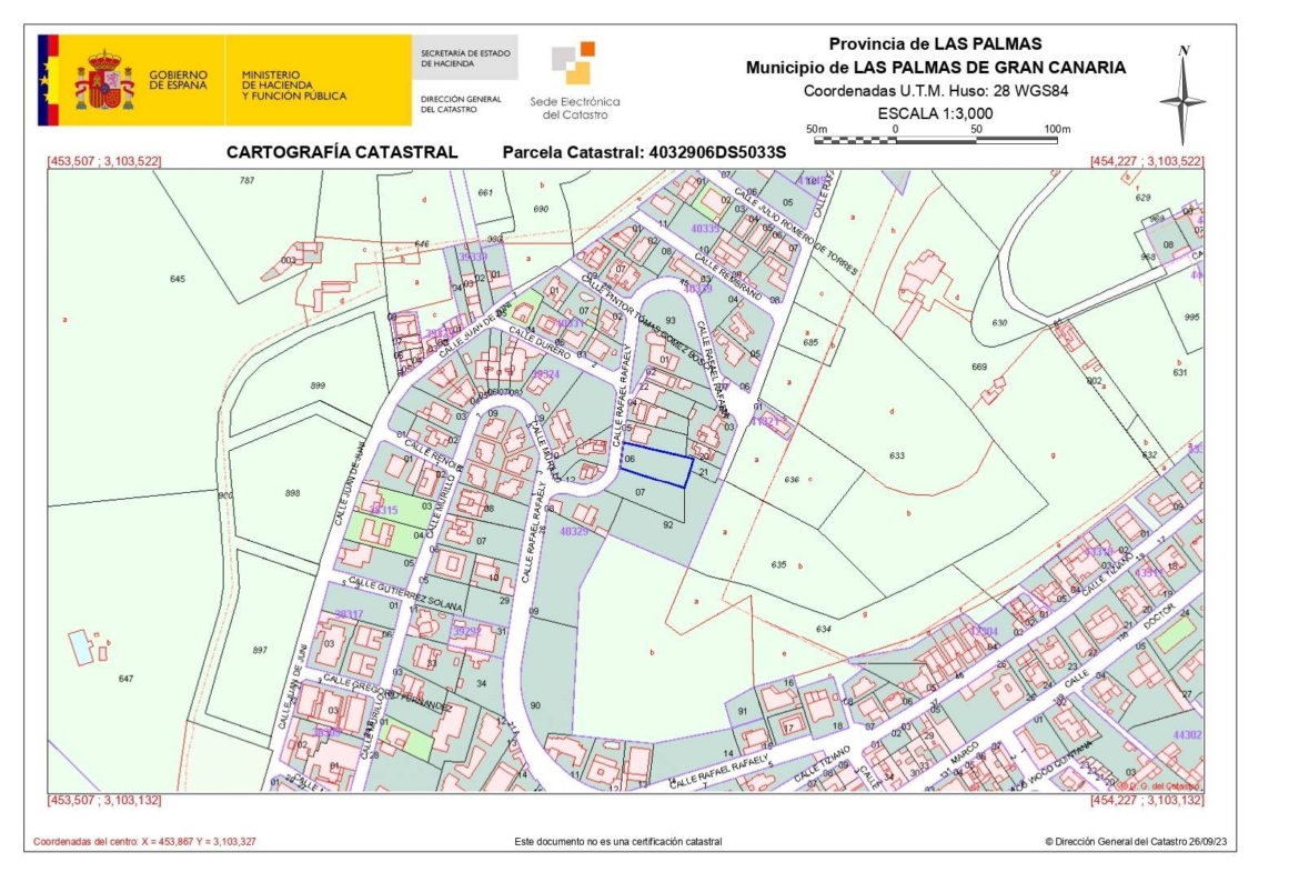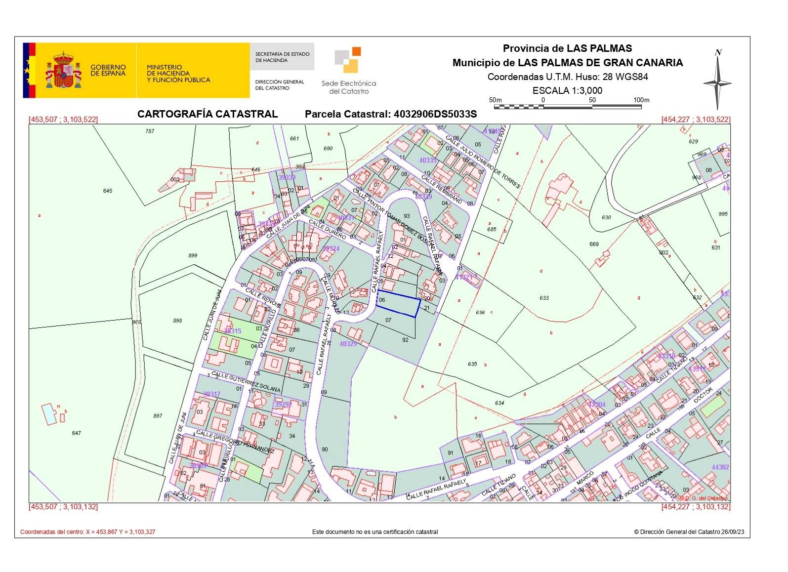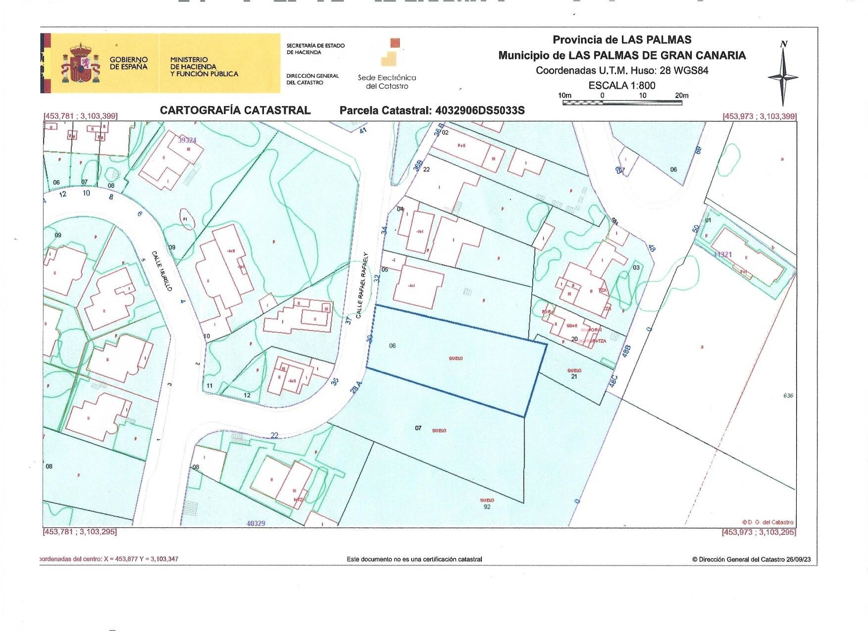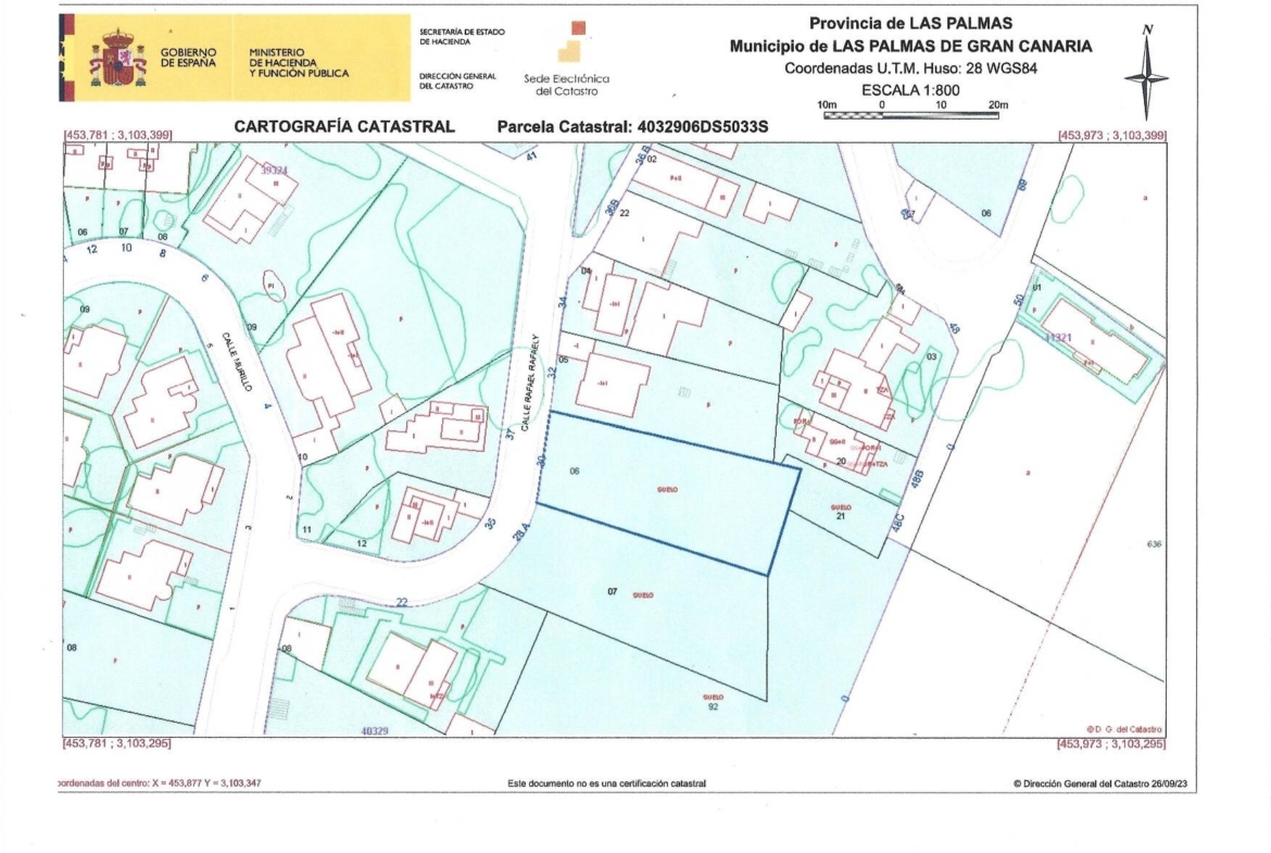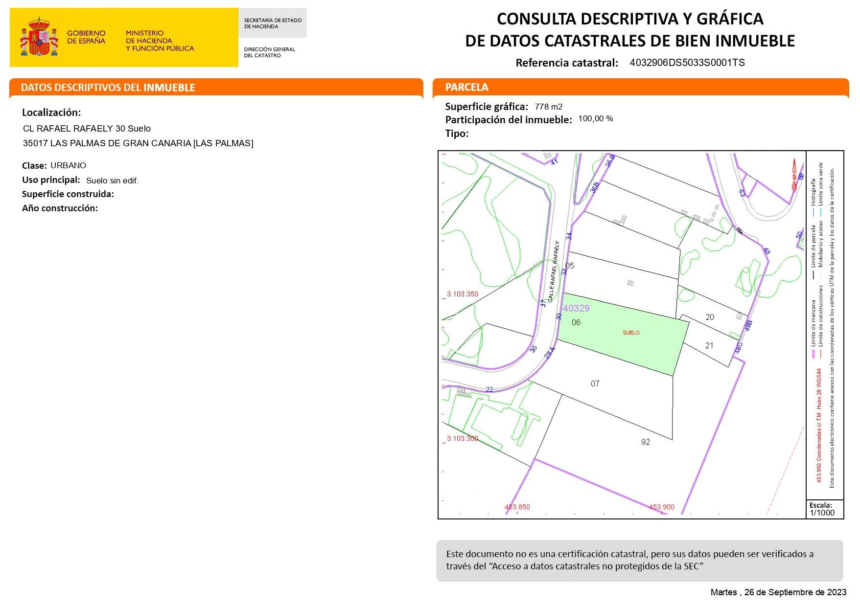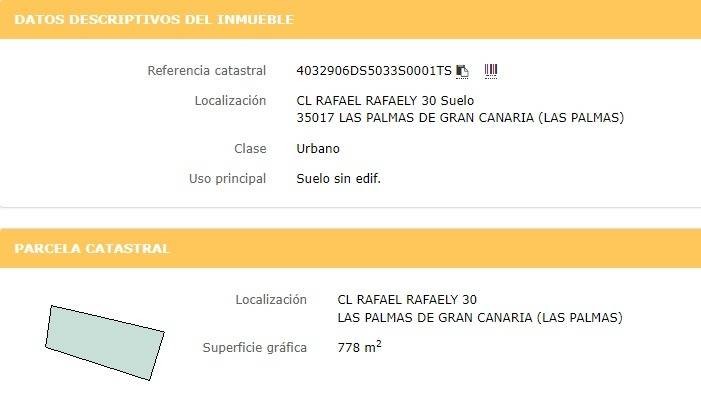 Parcela urbana en venta en Tafira Alta, en la calle Rafael Rafaeli, nº 30, con una superficie de 778 m2. Al Oeste de fachada o frontis 16,70 metros, a izquierda o Norte 40 metros, al Sur o derecha 46 metros, al Este o fondo 19,50 metros.