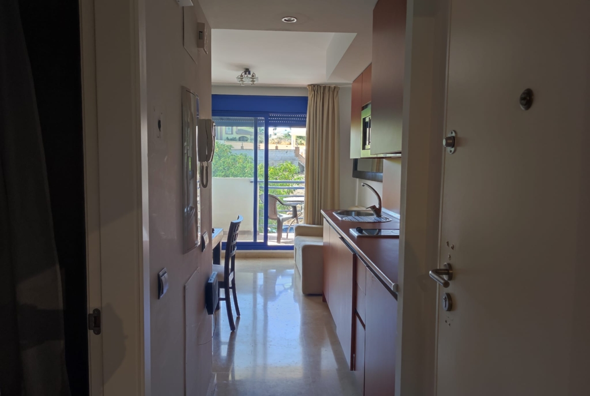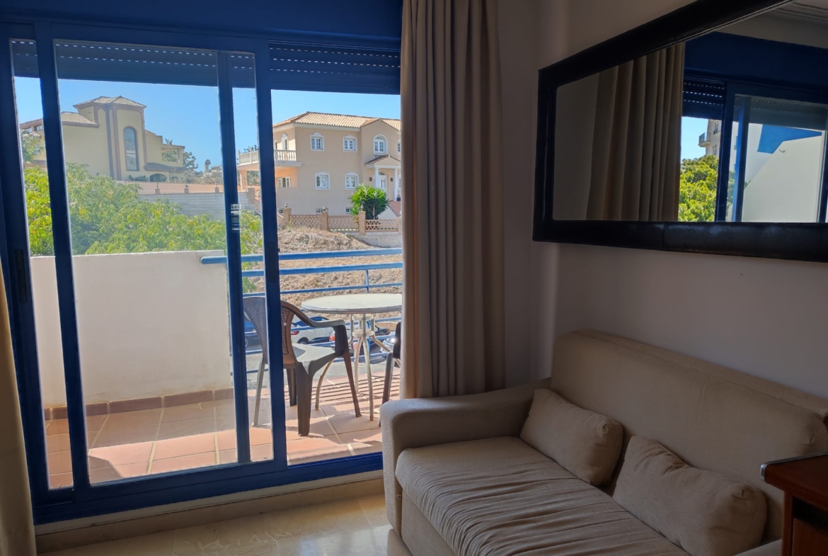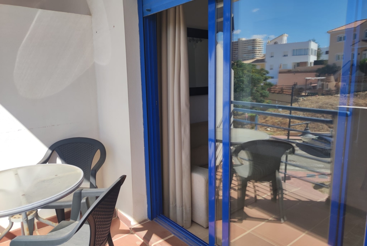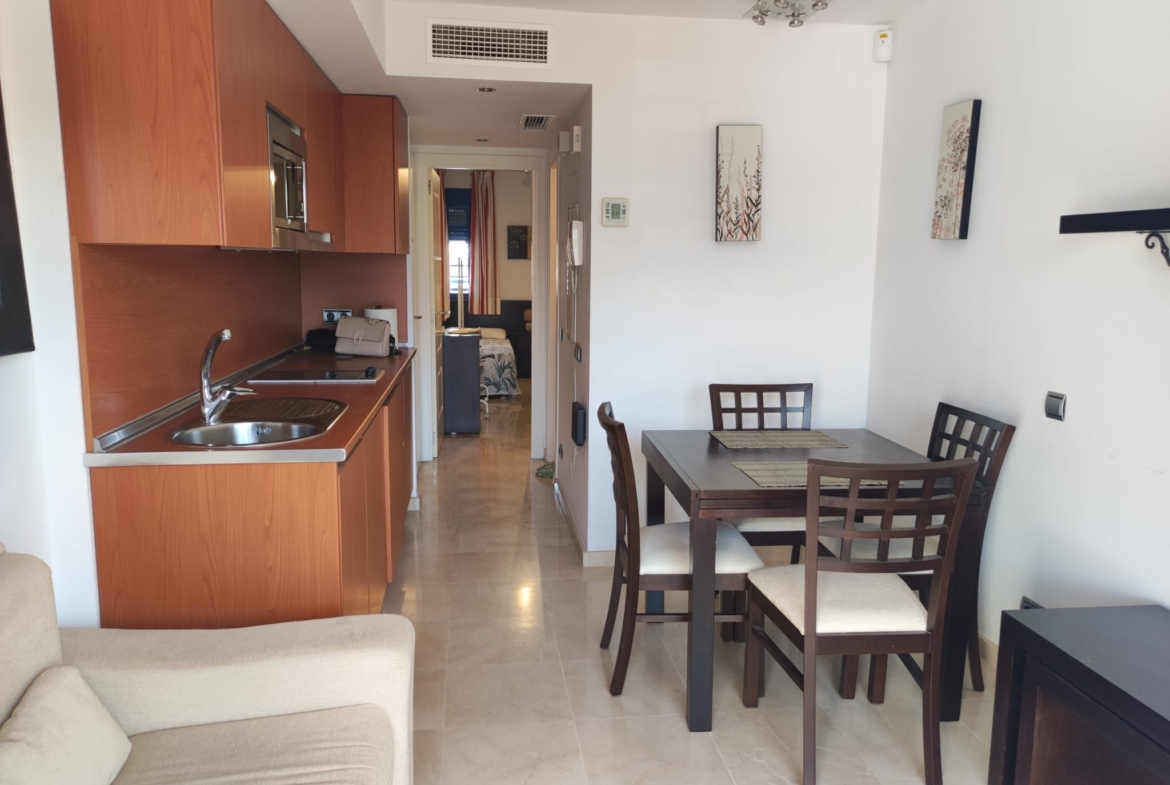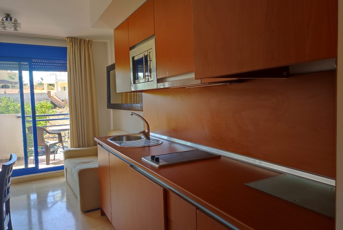 Piso en alquiler Benalmádena Costa. Vivienda de 1 habitación con salón-comedor y cocina incorporada, baño con plato de ducha y terraza.