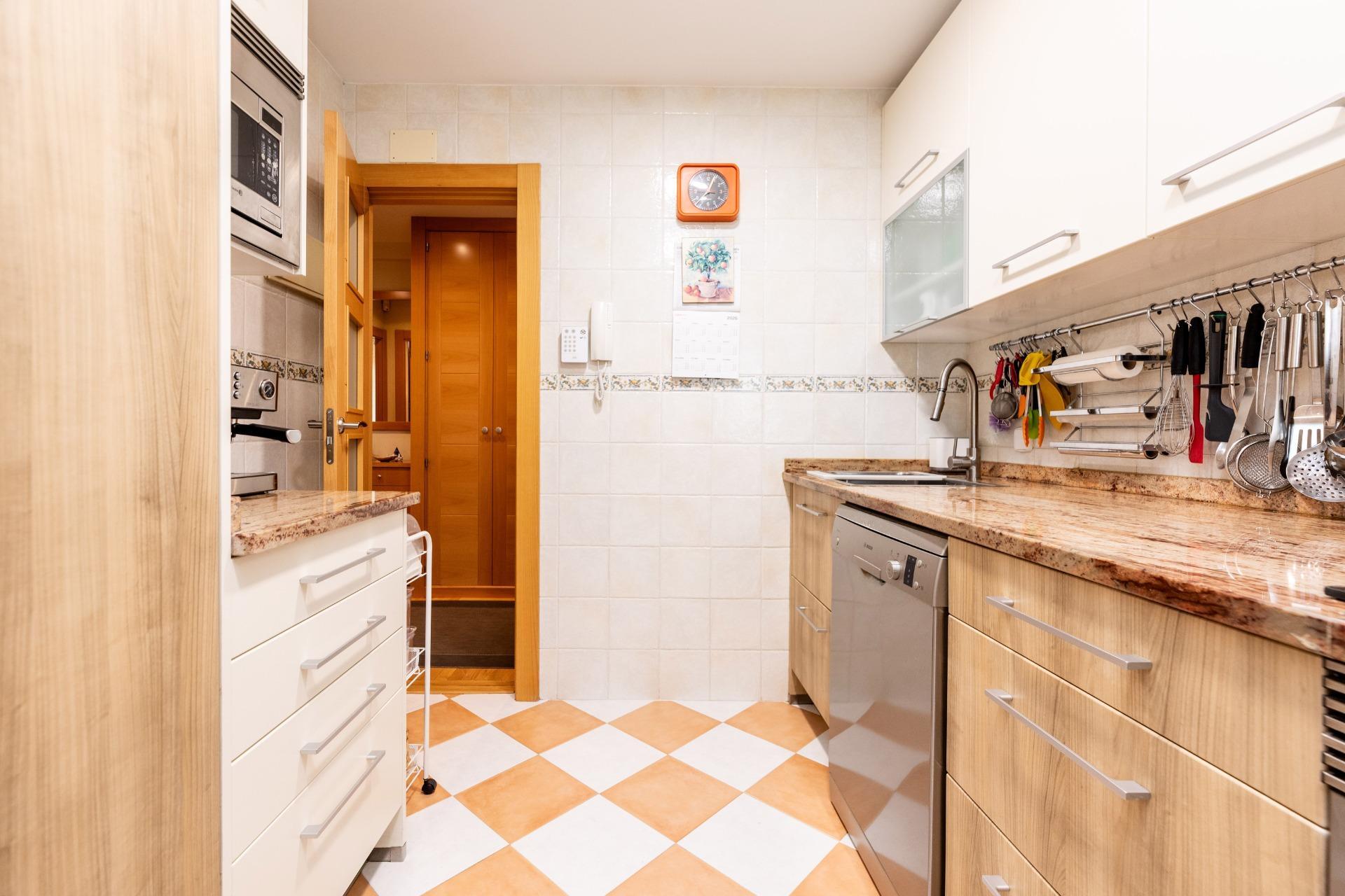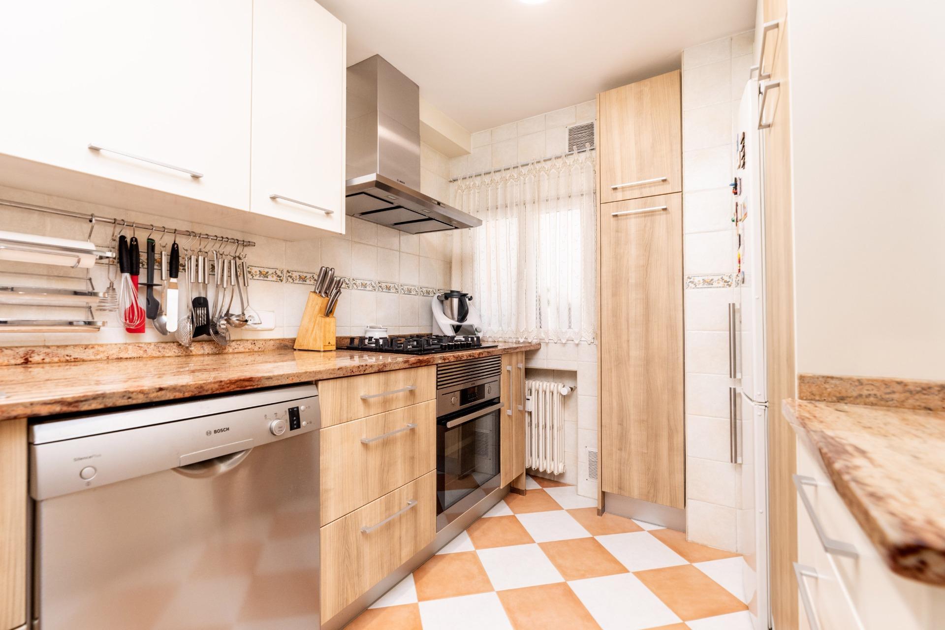 La cocina se entrega totalmente equipada, integrándose perfectamente en el conjunto de la vivienda. Los suelos de tarima, la pintura lisa y la cuidada distribución refuerzan la sensación de amplitud y confort.