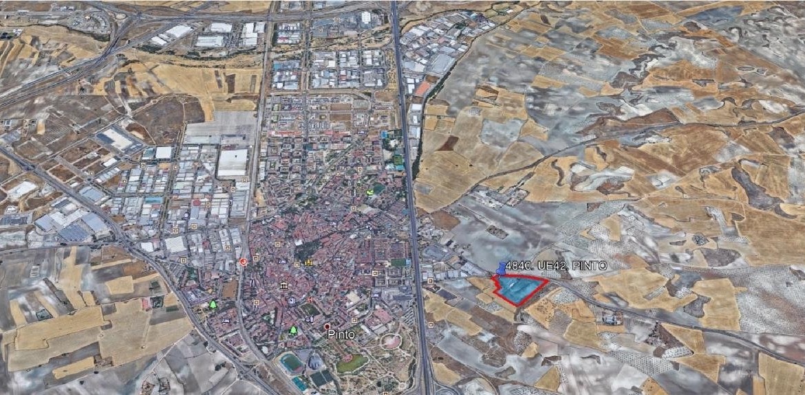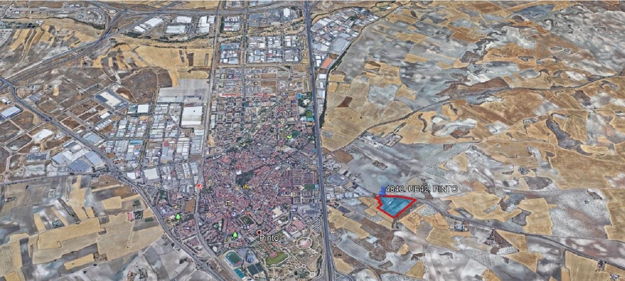 54013 metros de superficie, el 17% de dos parcelas aportadas clasificadas por el Planeamiento General como Suelo Urbano No Consolidado en el sector UE-42 ubicadas en la calle M-841(carretera a San Martin de La Vega) del término municipal de pinto en la provincia de Madrid.