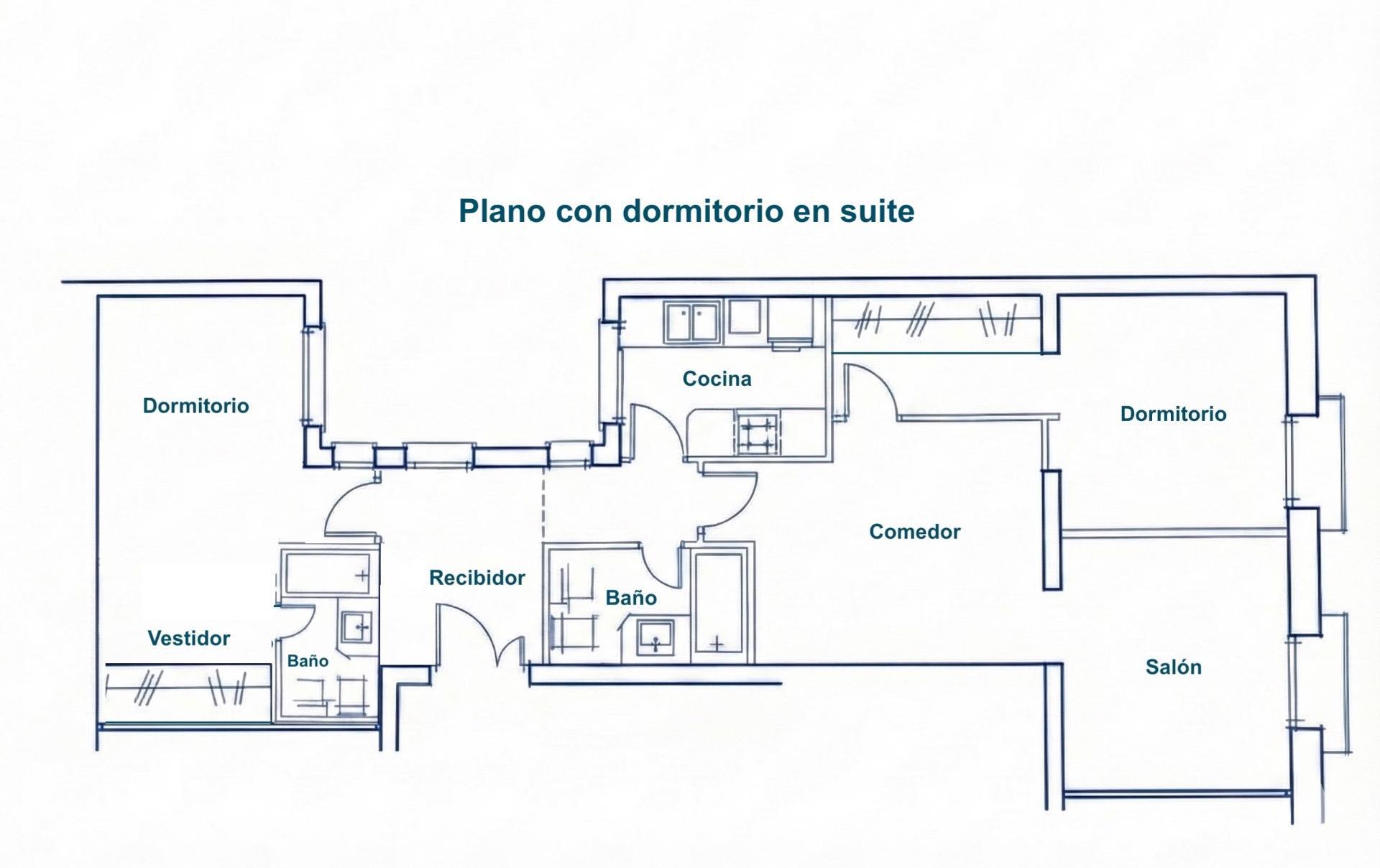 Para quienes buscan personalizar la vivienda, la propiedad ofrece un potencial de redistribución muy interesante, con la posibilidad de configurar dos amplios dormitorios y dos baños, uno de ellos en suite. Esta alternativa se puede visualizar en el plano orientativo incluido en la publicación.