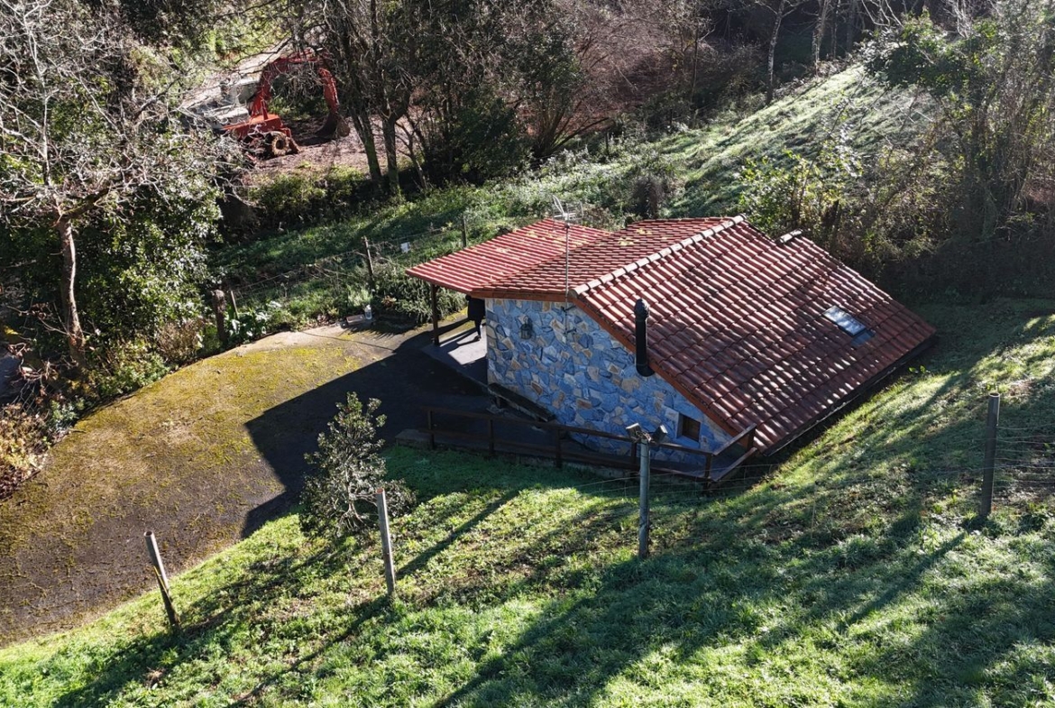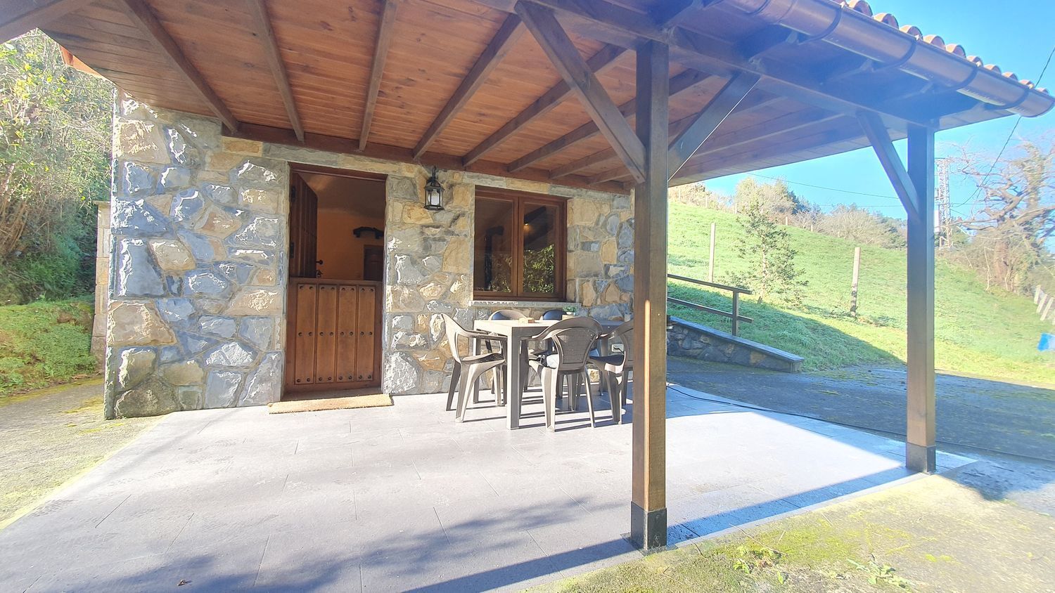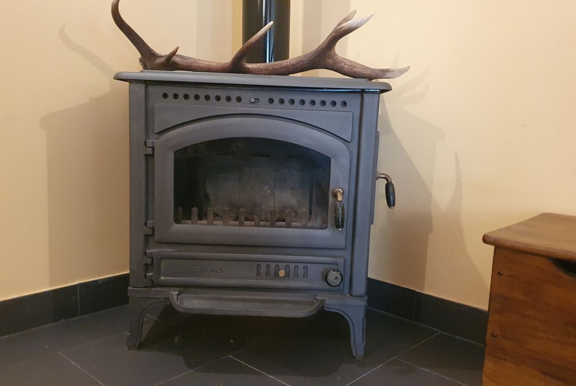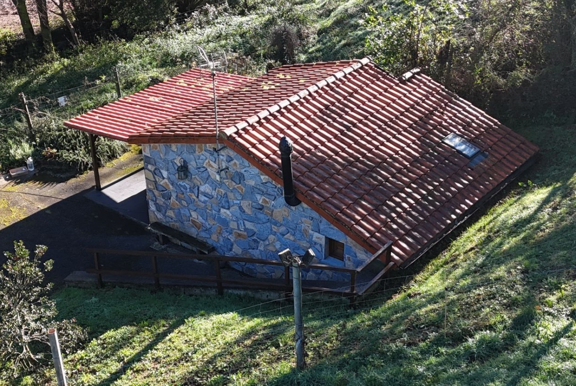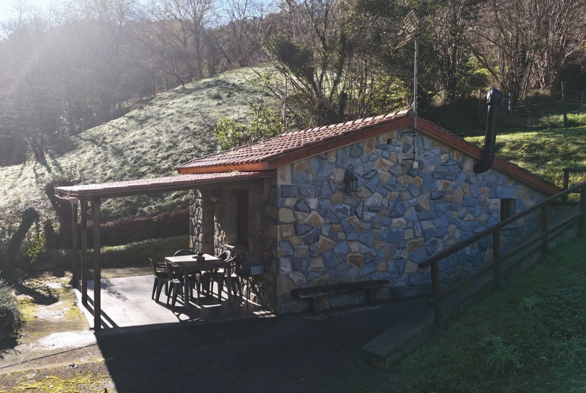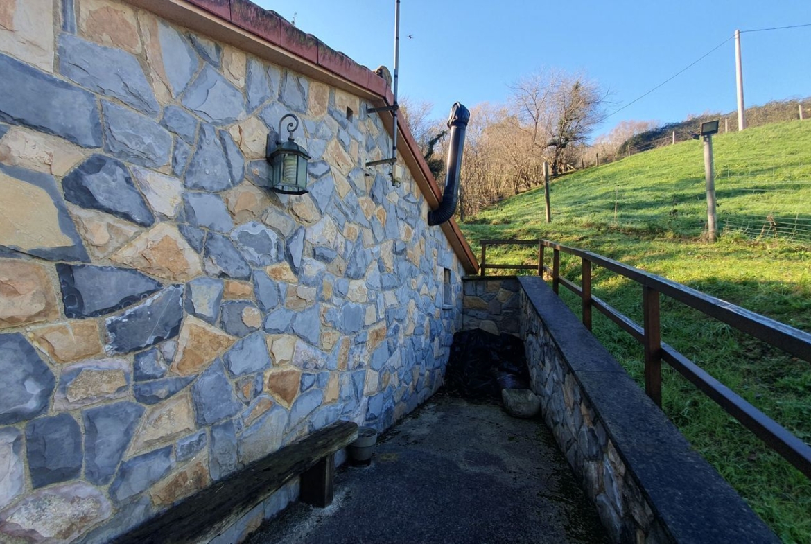 Las paredes de la vivienda son de hormigón con un buen asilamiento, ventanas y puerta de entrada de madera, dispone de una chimenea de hierro fundido.