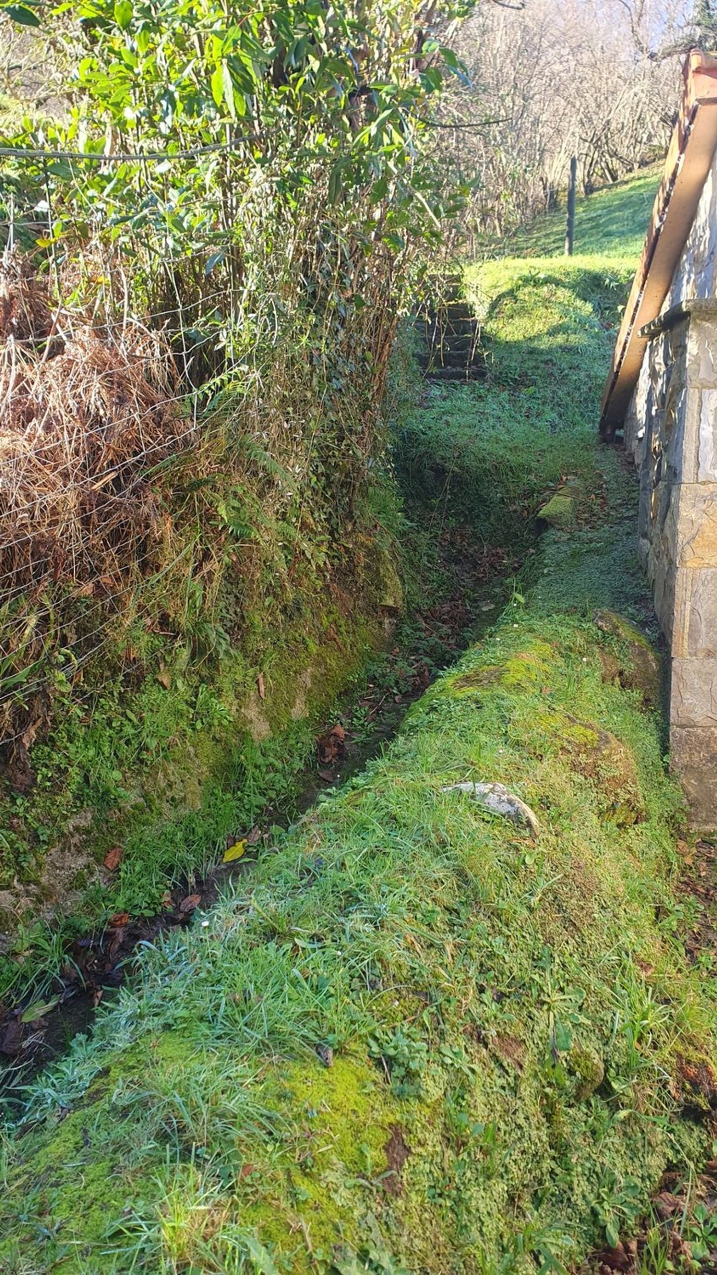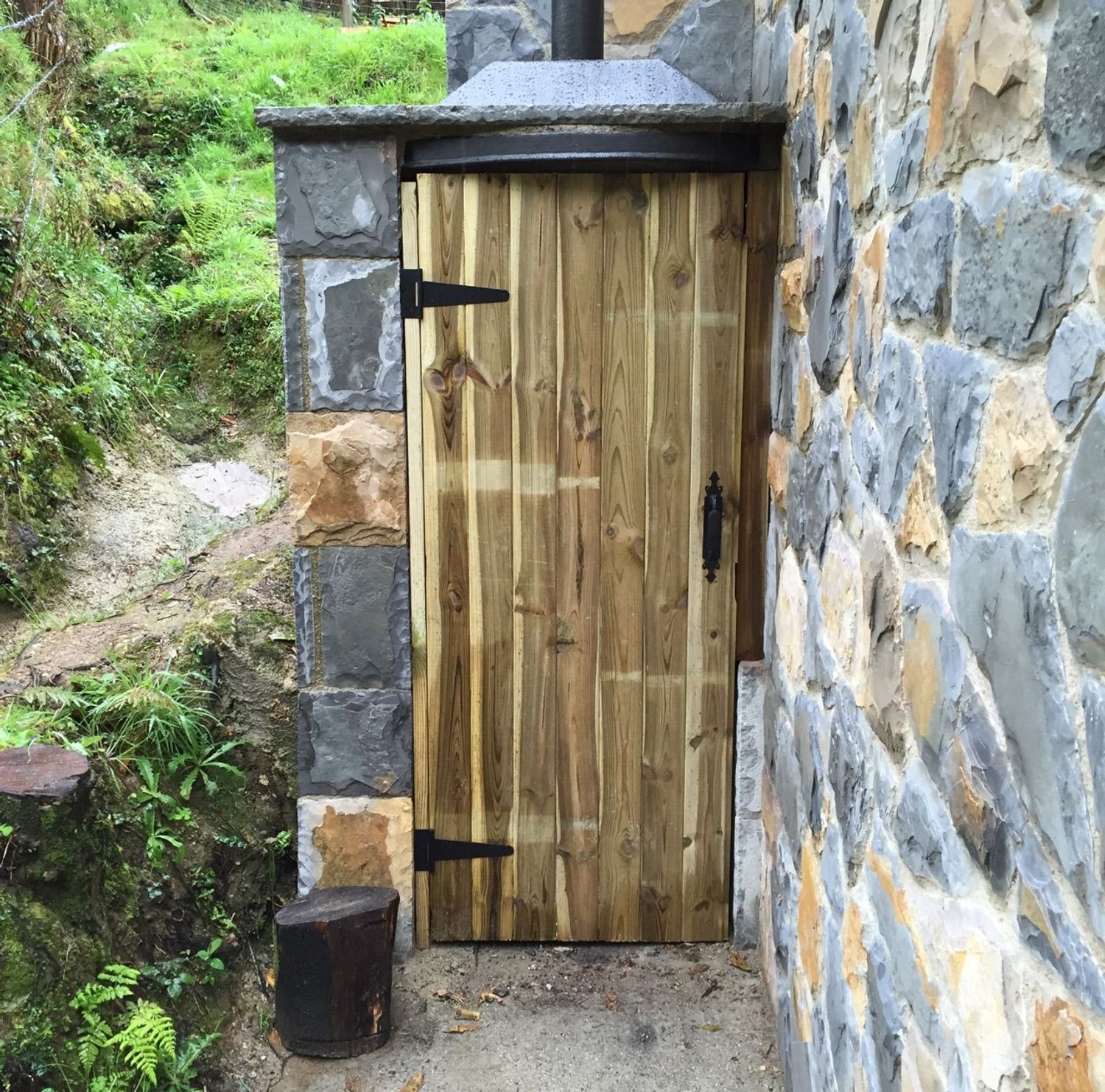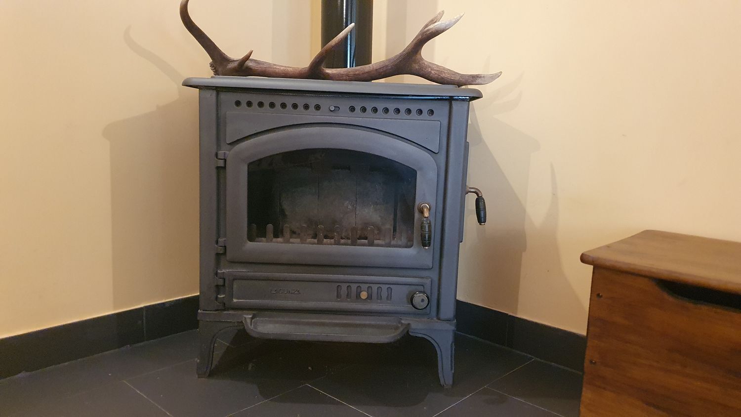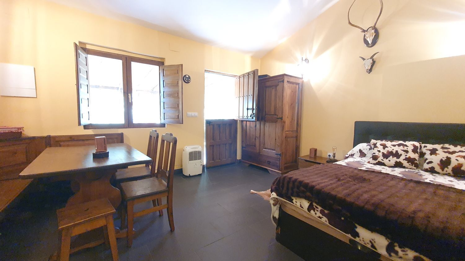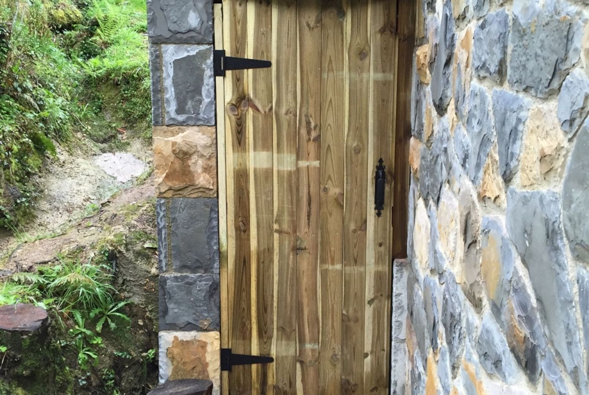 Las paredes de la vivienda son de hormigón con un buen asilamiento, ventanas y puerta de entrada de madera, dispone de una chimenea de hierro fundido.