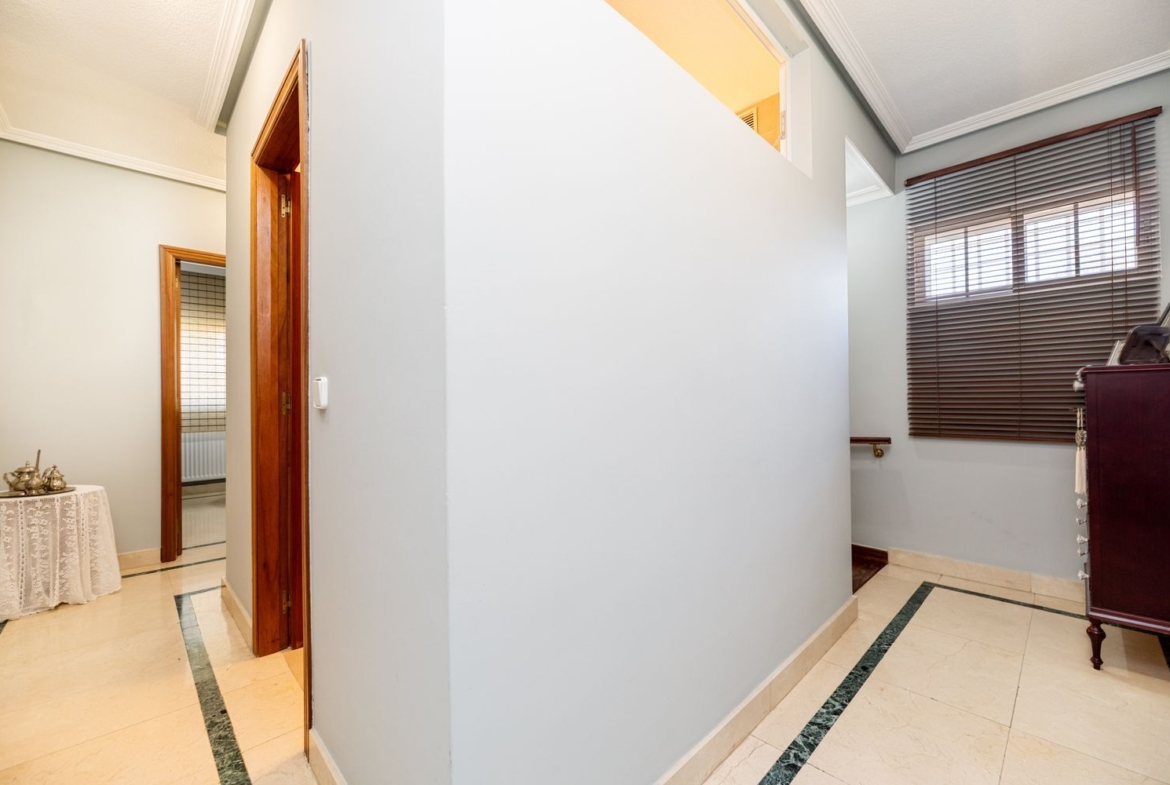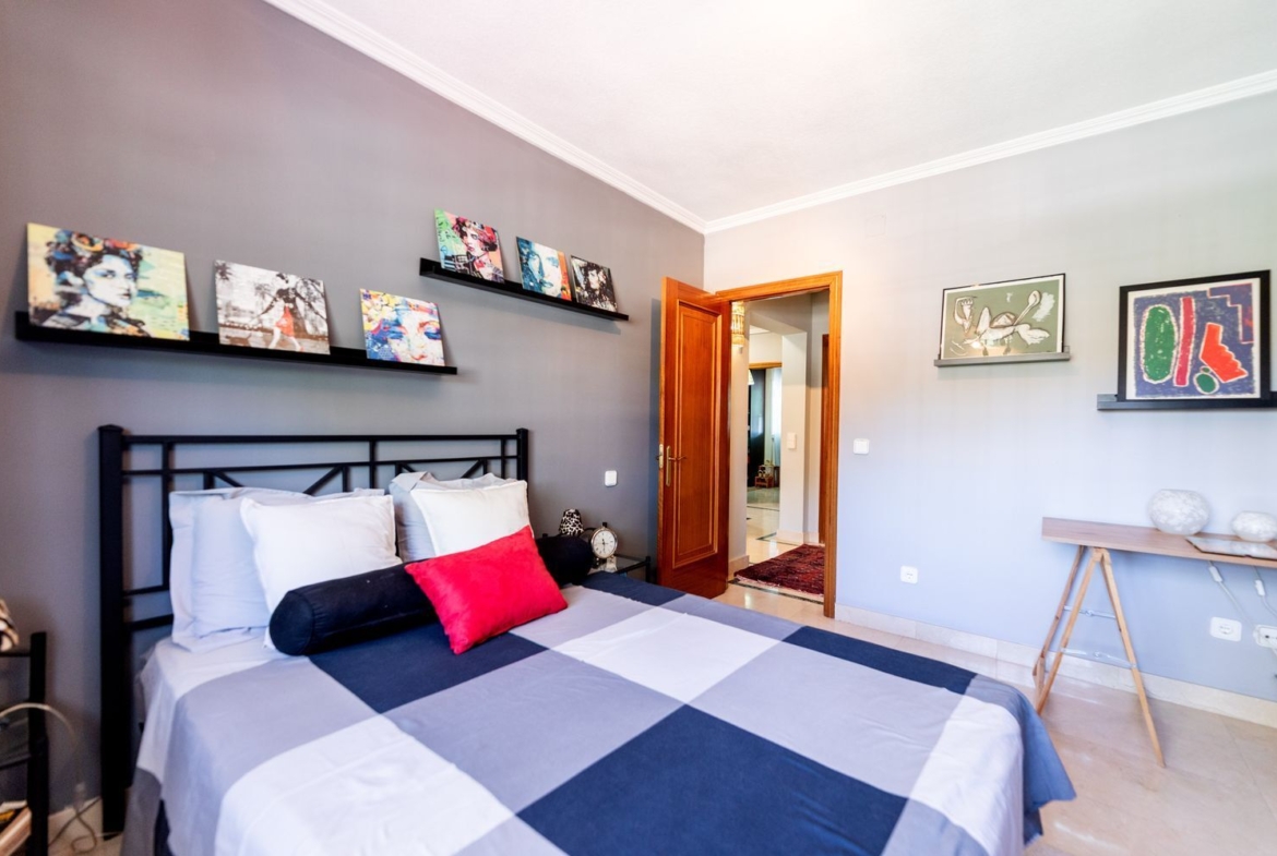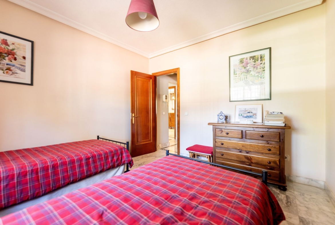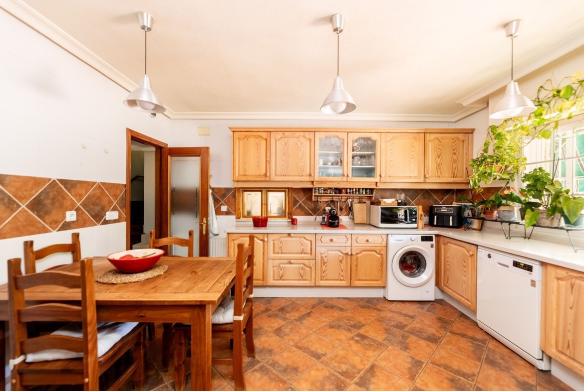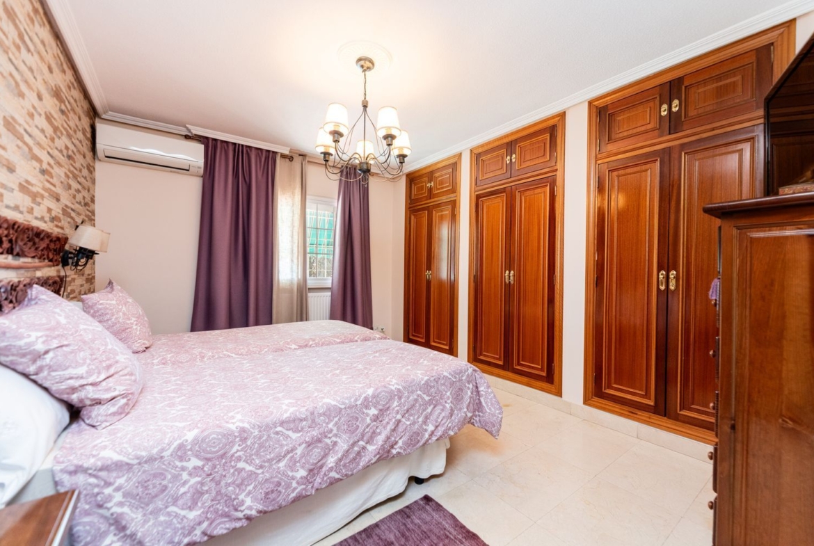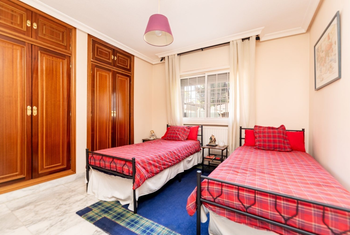 La vivienda cuenta con cinco dormitorios, incluyendo una suite con baño privado en la primera planta y un dormitorio con baño completo en la planta baja, ideal para visitas o familiares. Además, hay tres dormitorios adicionales que comparten un baño completo, armarios empotrados en cada habitación. La casita auxiliar de aproximadamente 50 m² con terraza solárium añade un valor extra a la propiedad, siendo perfecta como espacio de invitados o estudio.