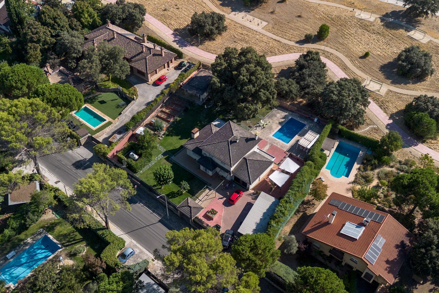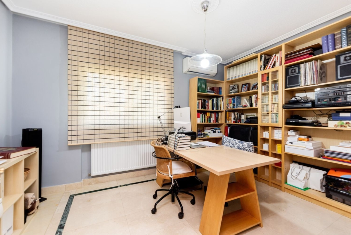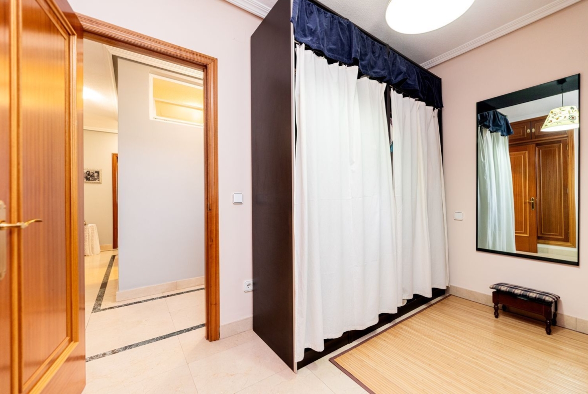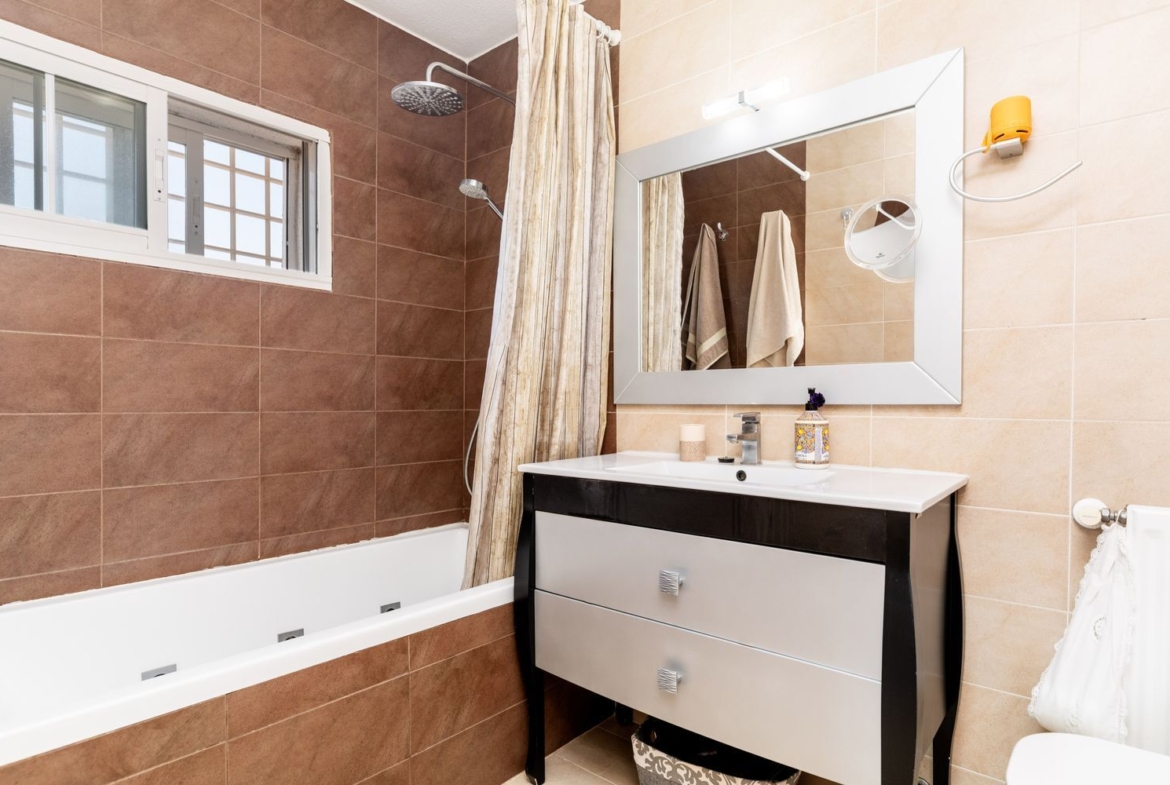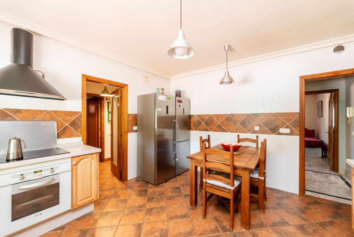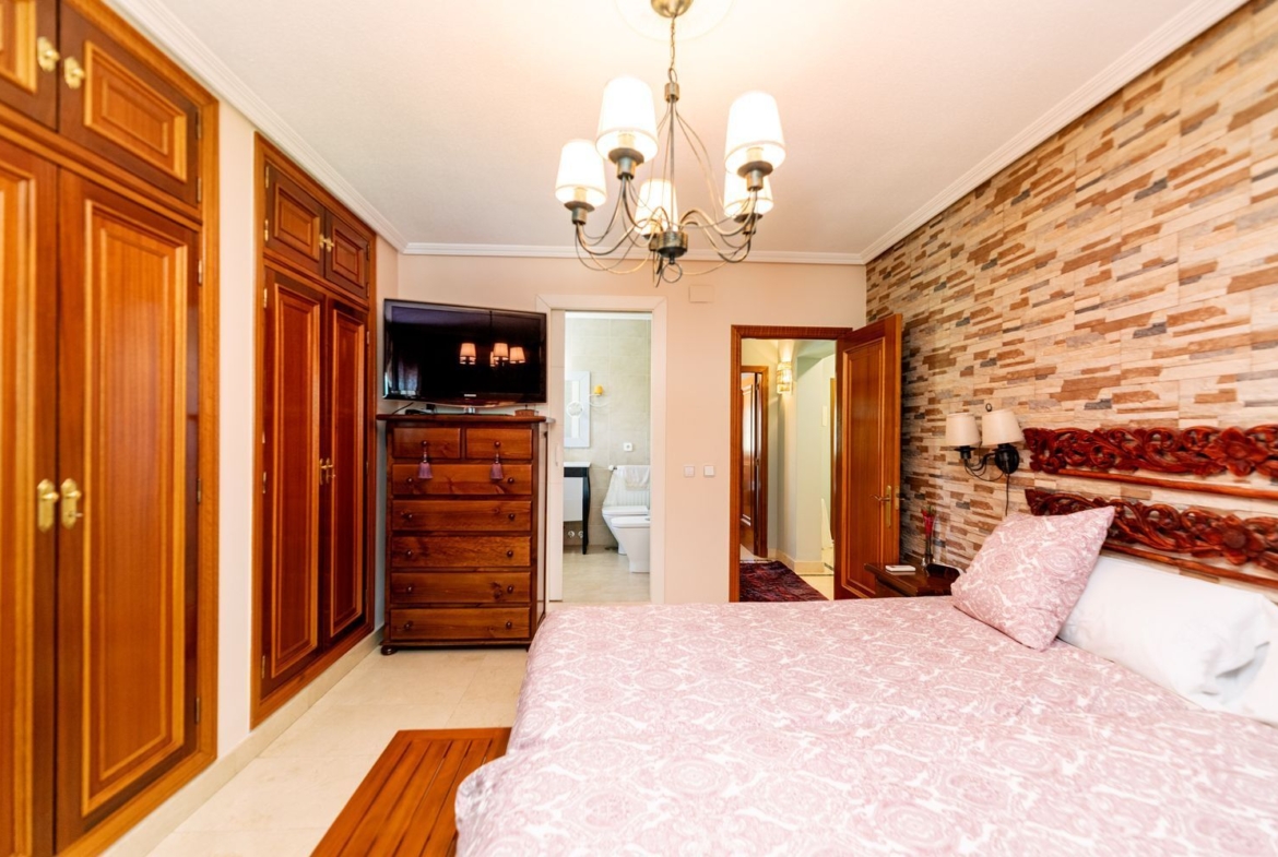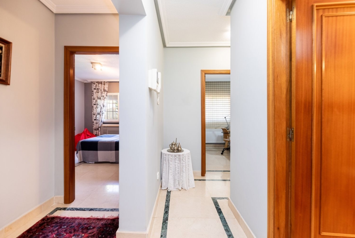 La vivienda cuenta con cinco dormitorios, incluyendo una suite con baño privado en la primera planta y un dormitorio con baño completo en la planta baja, ideal para visitas o familiares. Además, hay tres dormitorios adicionales que comparten un baño completo, armarios empotrados en cada habitación. La casita auxiliar de aproximadamente 50 m² con terraza solárium añade un valor extra a la propiedad, siendo perfecta como espacio de invitados o estudio.