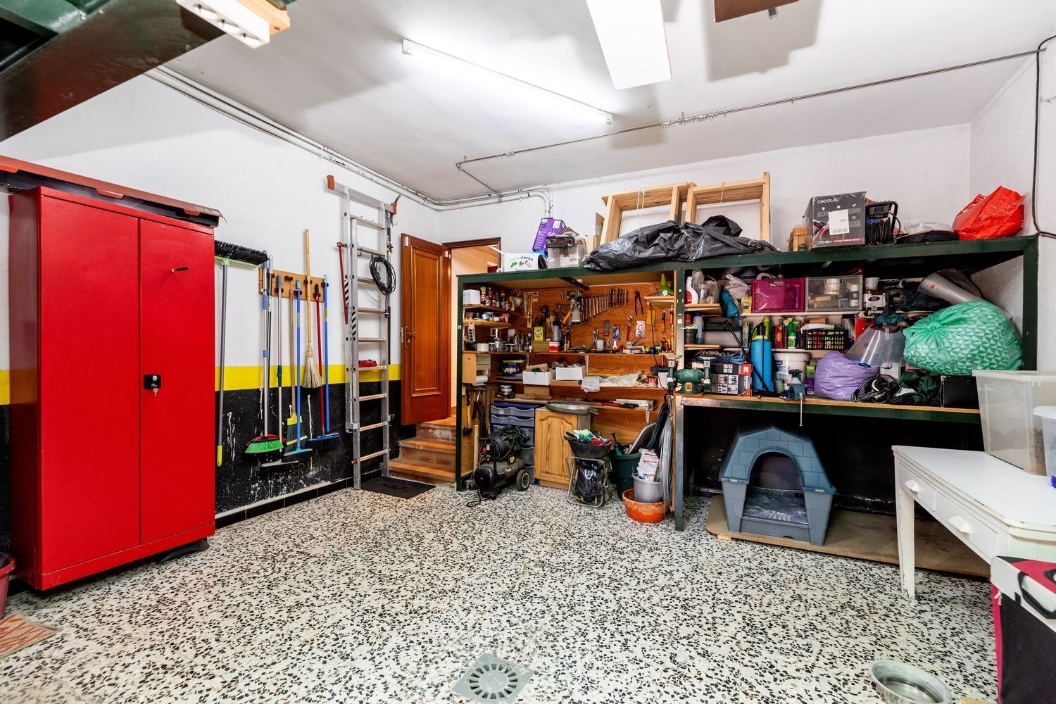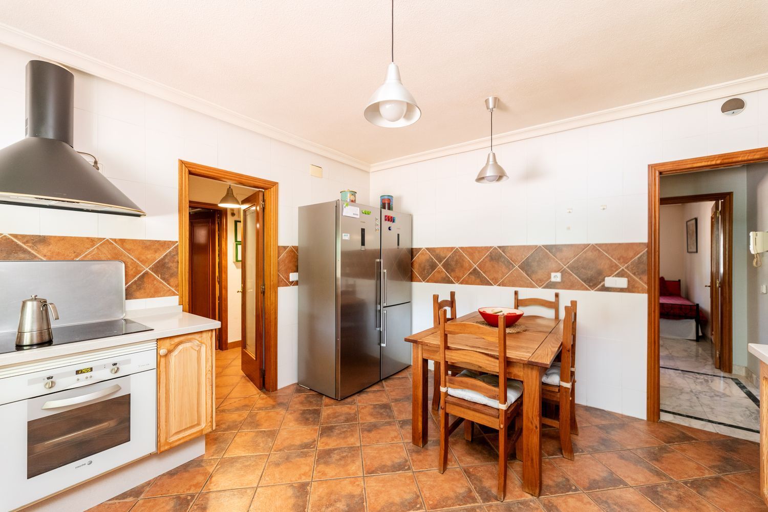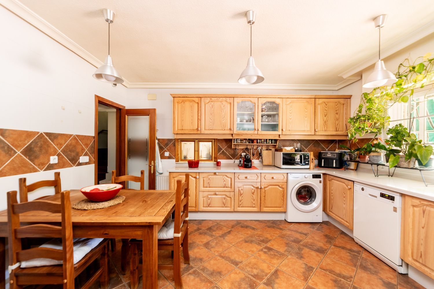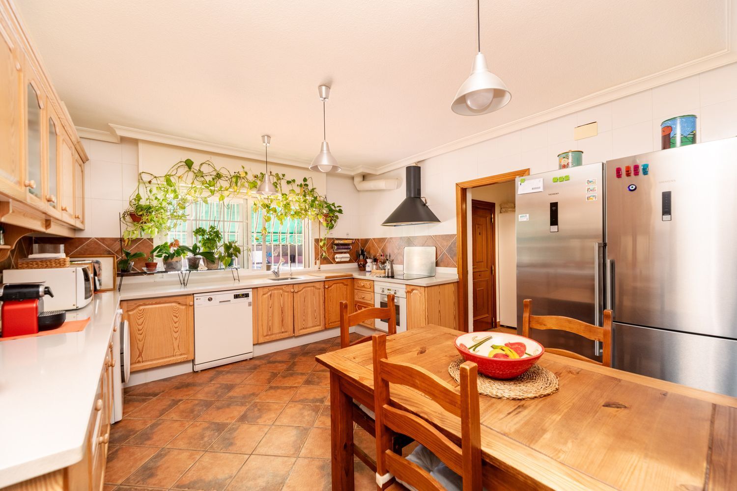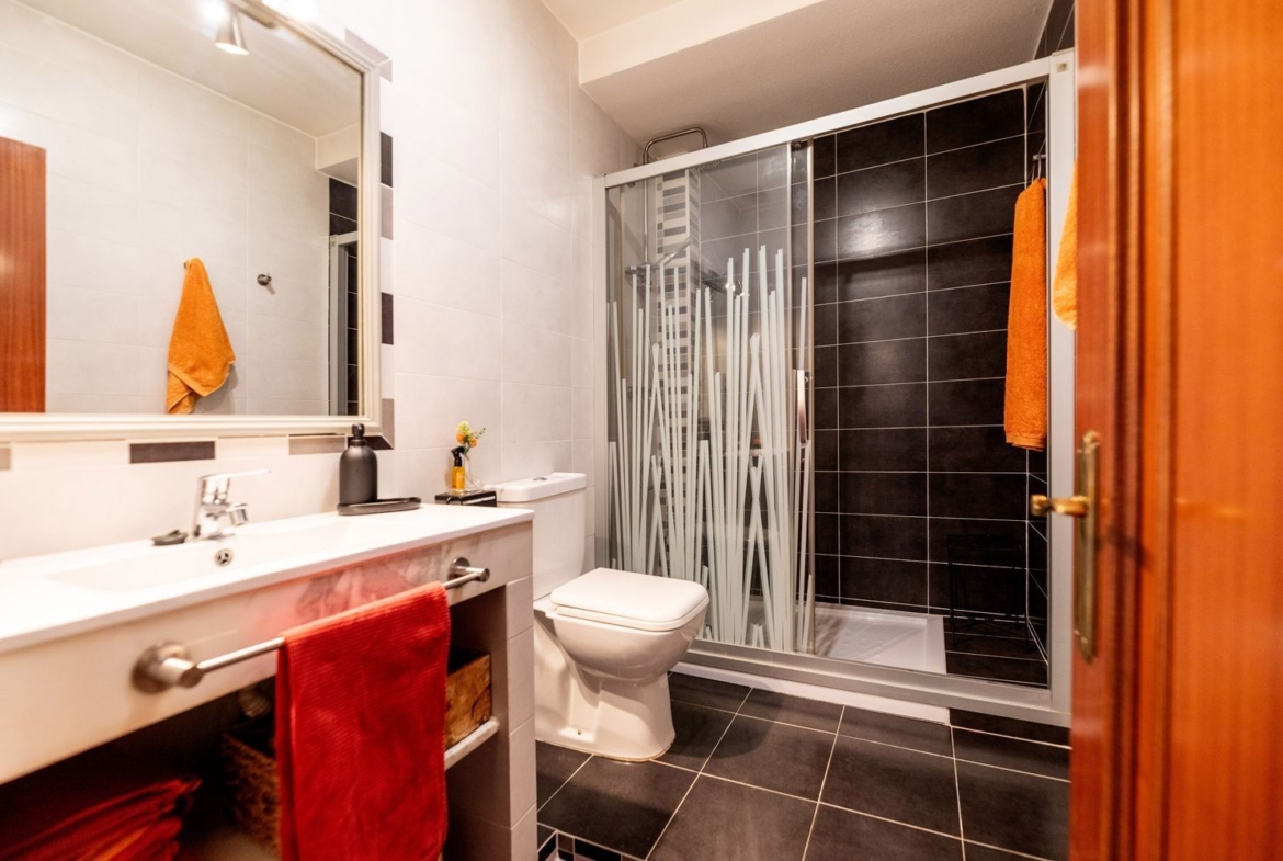 La vivienda cuenta con cinco dormitorios, incluyendo una suite con baño privado en la primera planta y un dormitorio con baño completo en la planta baja, ideal para visitas o familiares. Además, hay tres dormitorios adicionales que comparten un baño completo, armarios empotrados en cada habitación. La casita auxiliar de aproximadamente 50 m² con terraza solárium añade un valor extra a la propiedad, siendo perfecta como espacio de invitados o estudio.