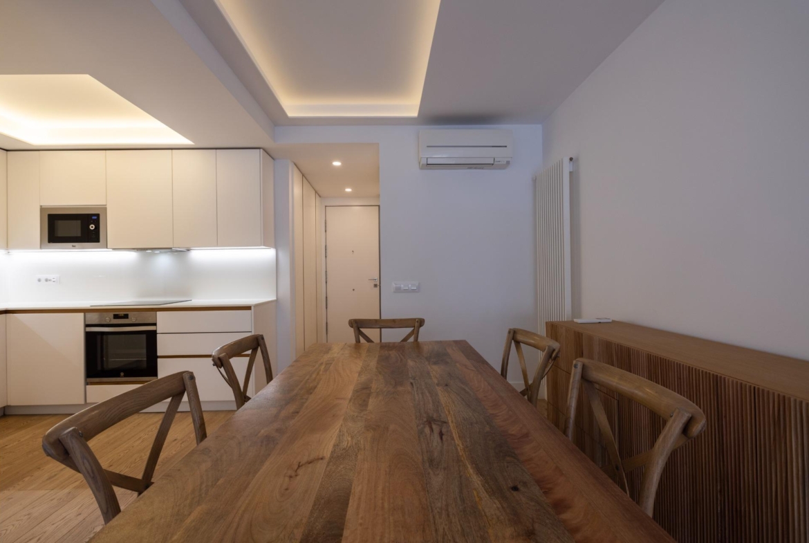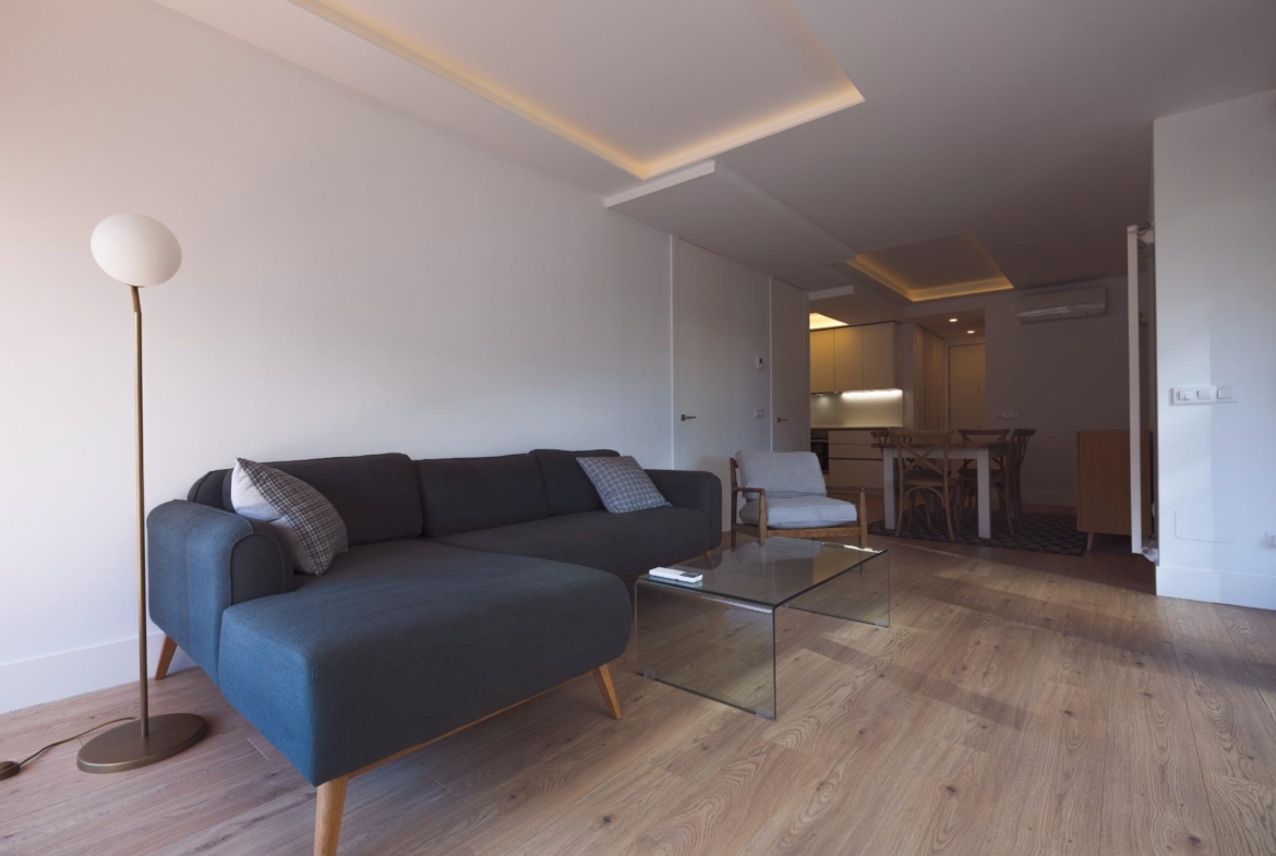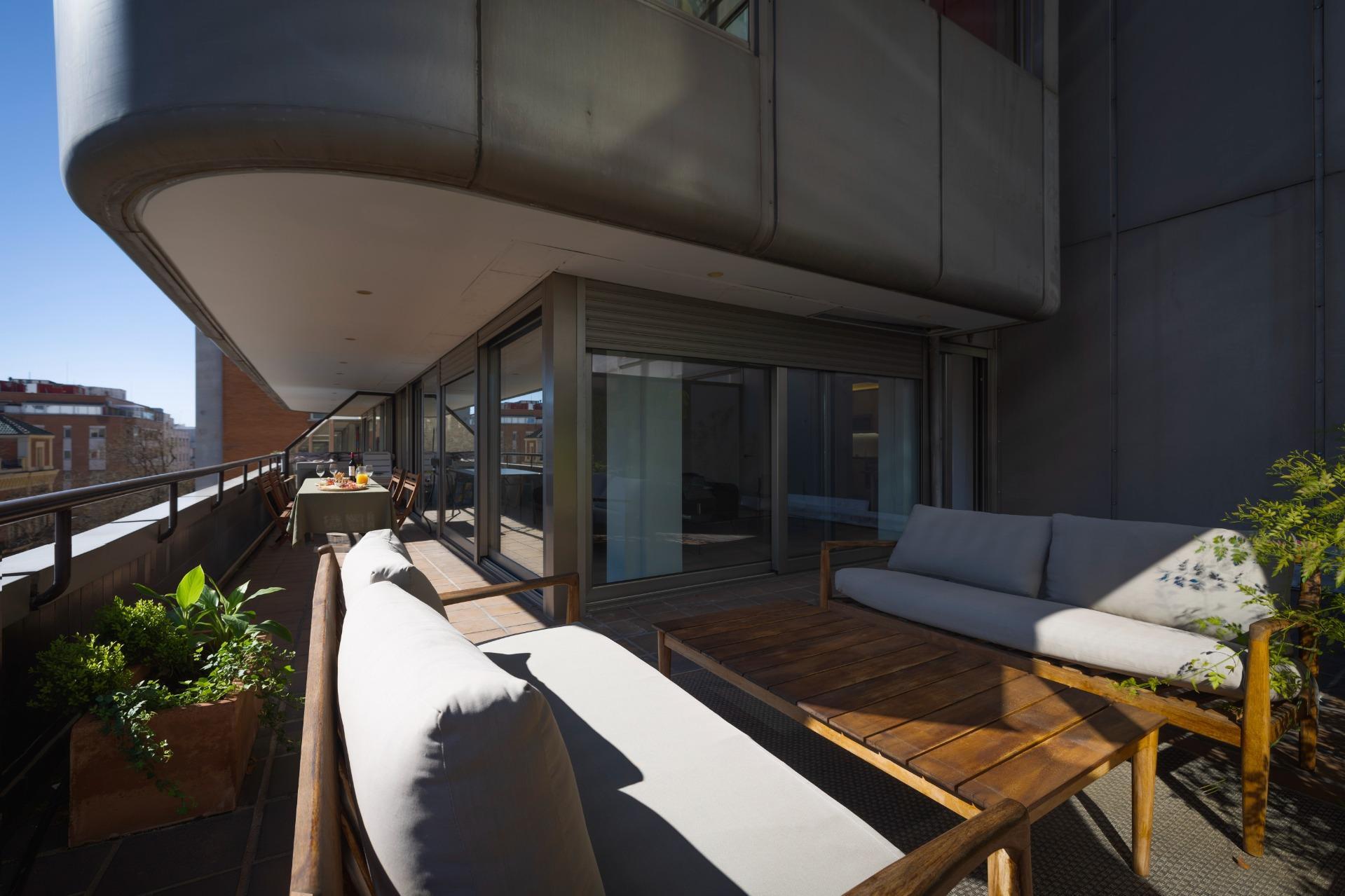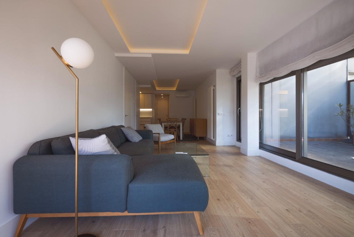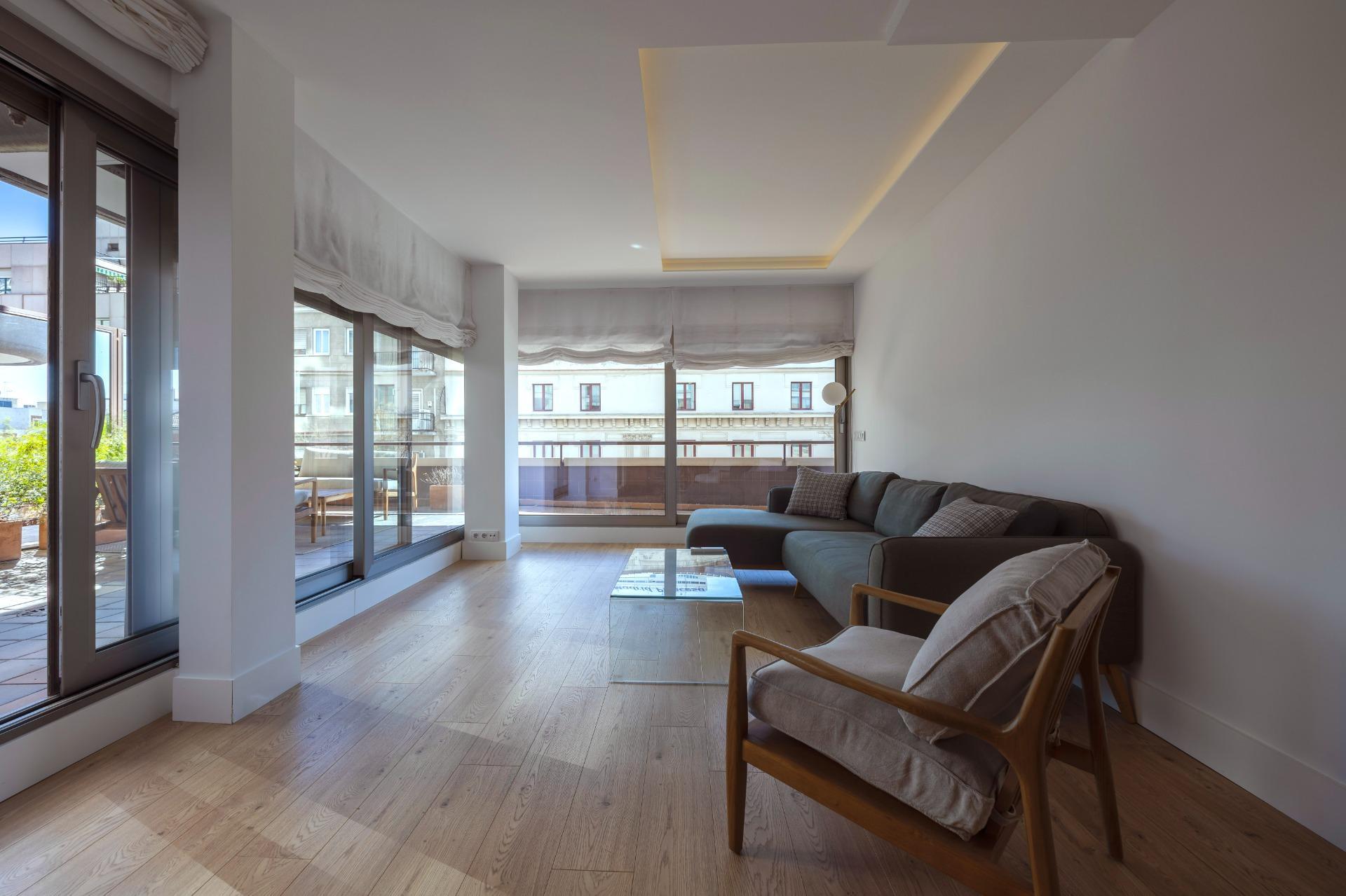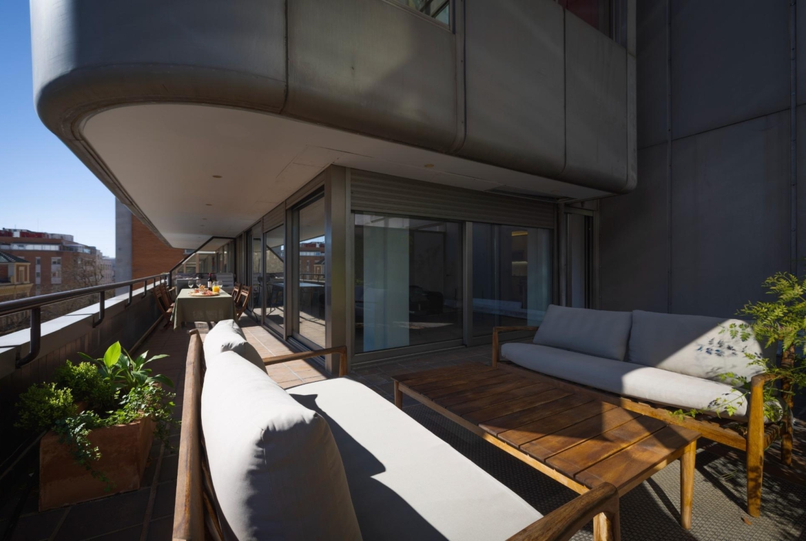 Destaca por su orientación sur y su diseño contemporáneo que maximiza la luz natural gracias a sus amplios ventanales, todos con acceso a su amplia y acogedora terraza, difícil de encontrar en Madrid centro.