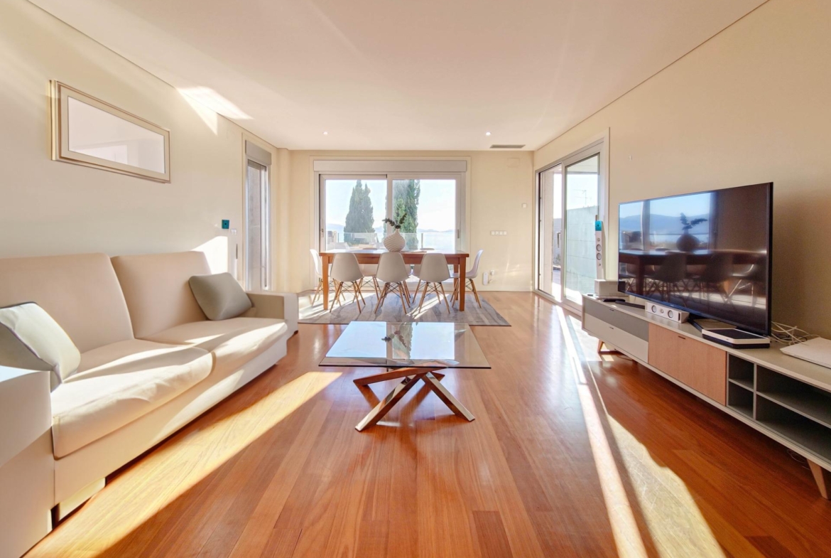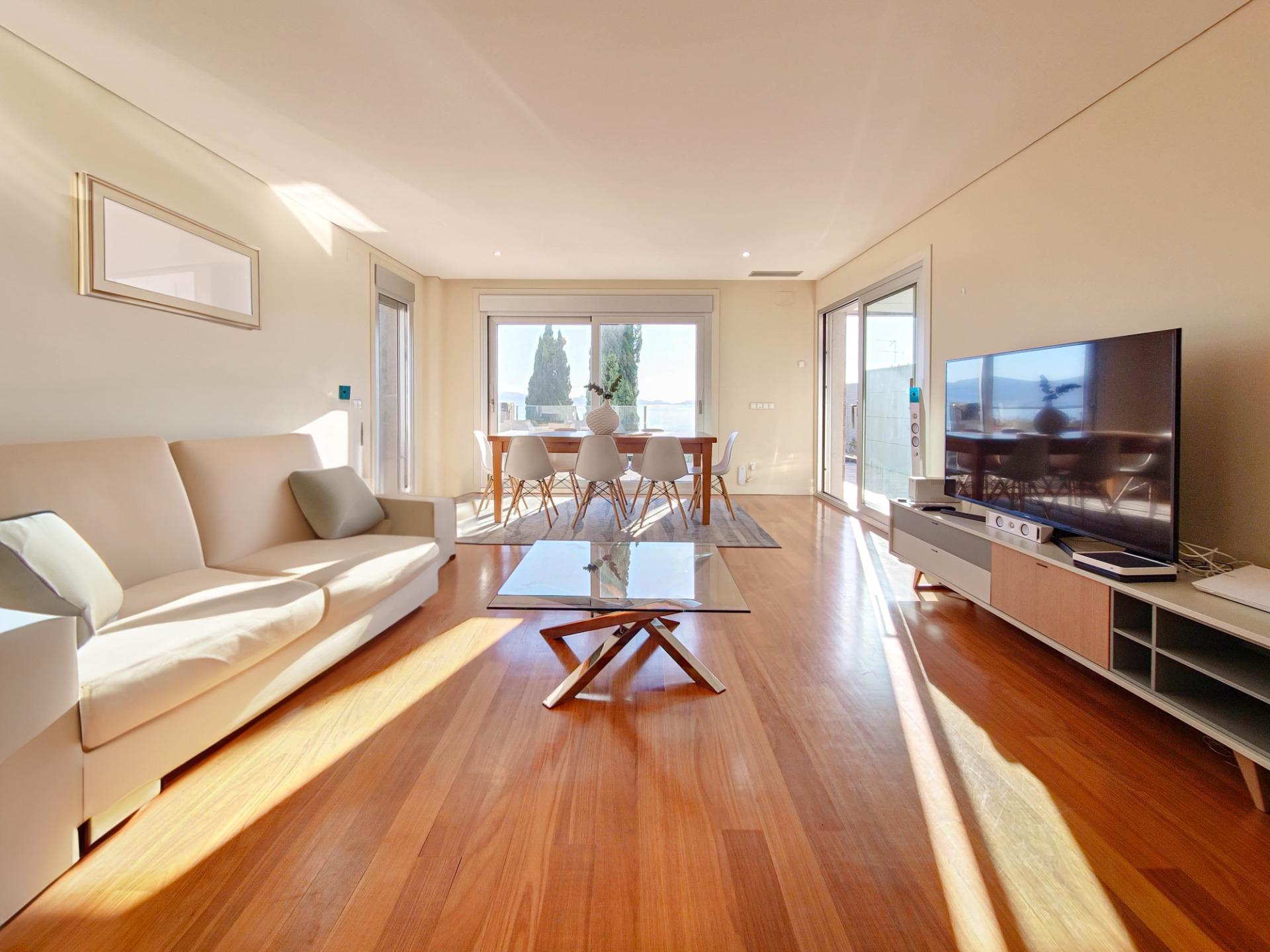 Imagina despertar cada día con vistas panorámicas al mar desde tu habitación principal, donde un balcón privado se convierte en tu rincón personal para contemplar las islas cercanas. Las amplias ventanas inundan el salón comedor de luz natural, conectando el espacio con una terraza que invita a las barbacoas y cenas al aire libre, todo con el telón de fondo del océano.