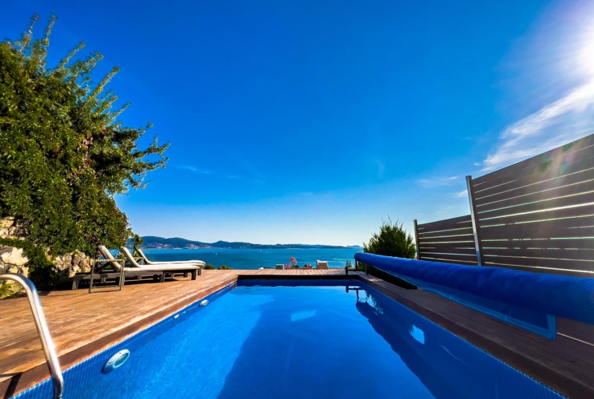 Sumérgete en el oasis exterior, donde una piscina climatizada te espera en la cima del jardín. Con suelos de madera, tumbonas y una mesa principal para seis comensales, este espacio se convierte en tu paraíso personal para relajarte y disfrutar de las impresionantes vistas a la ría y sus islas.