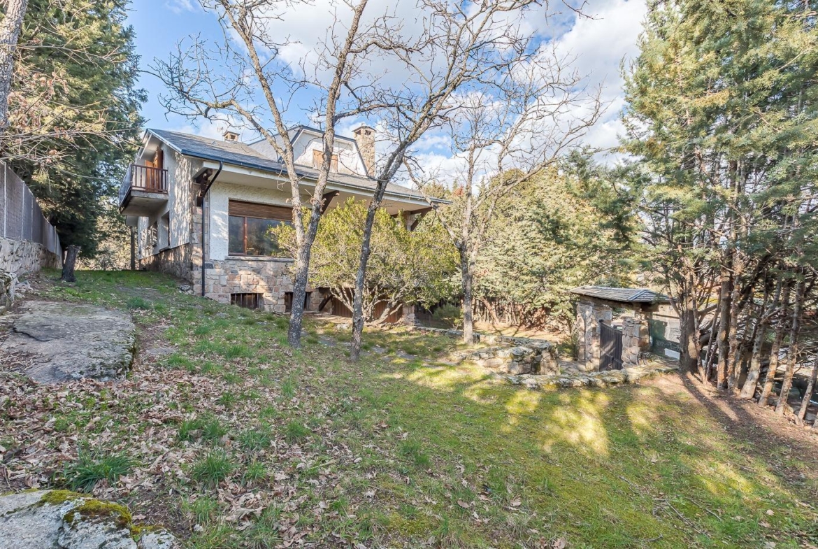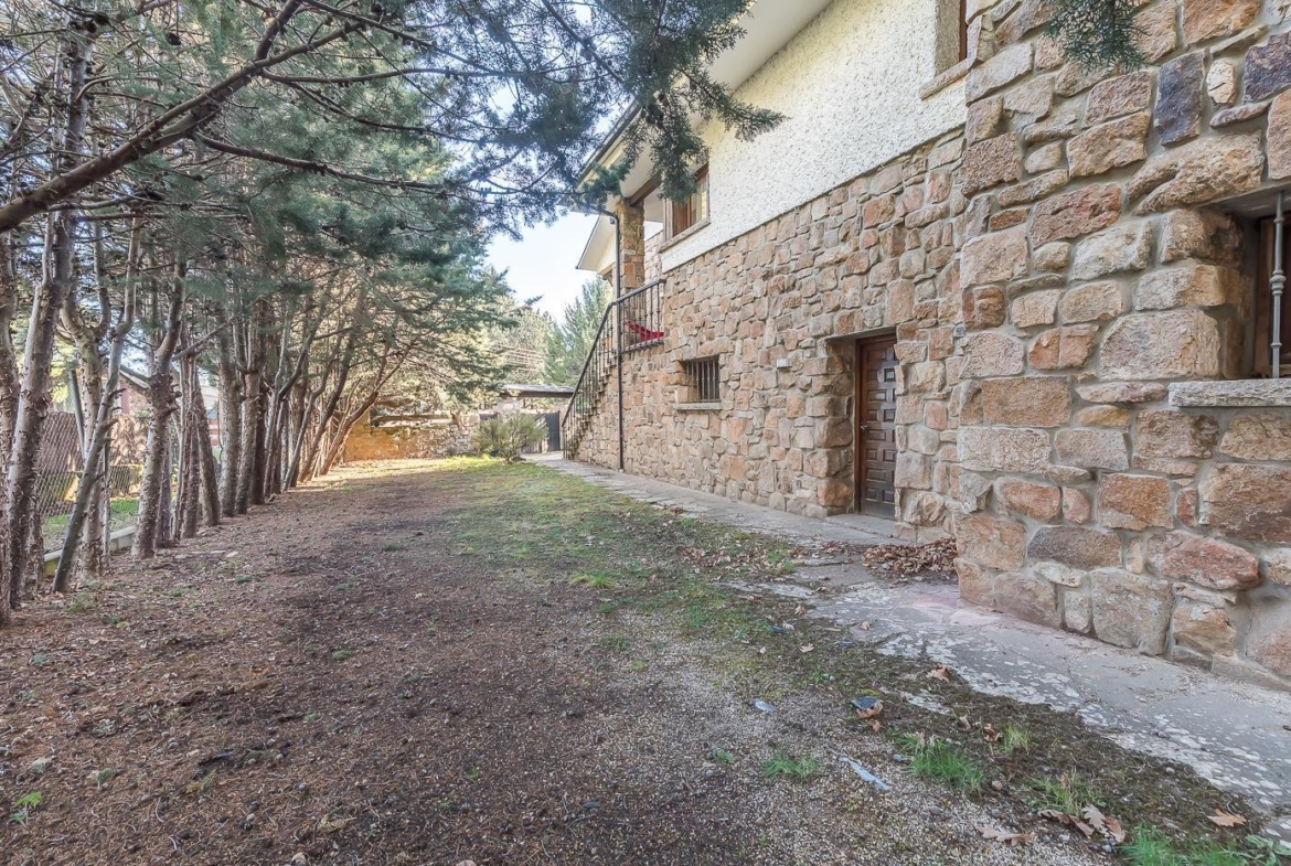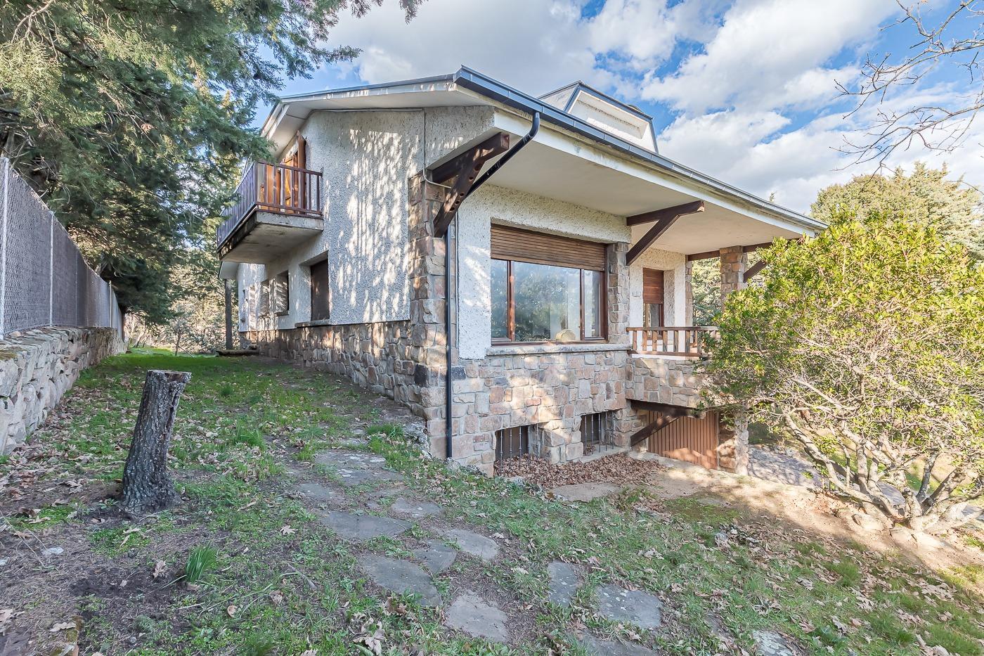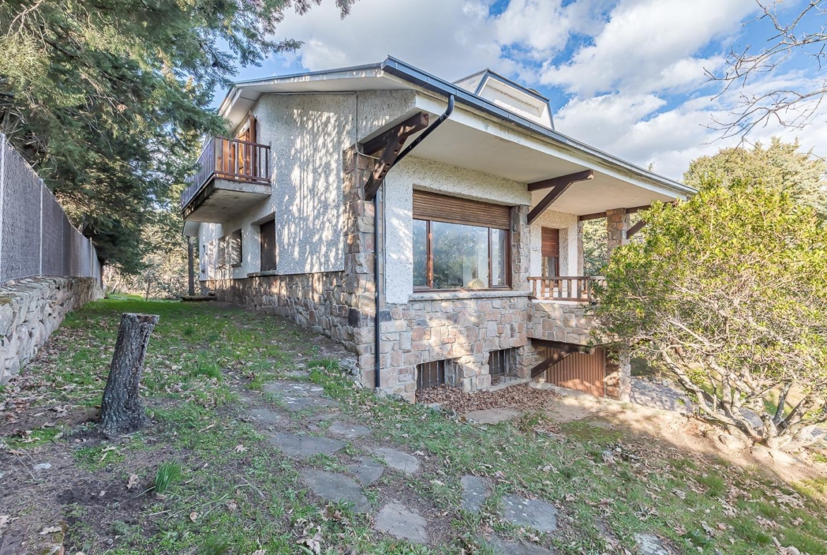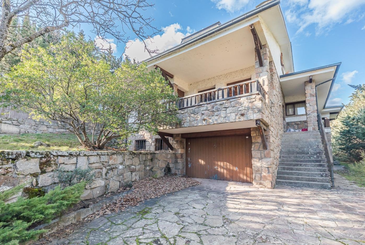 Esta casa unifamiliar se encuentra a la entrada del Pueblo de Navacerrada al lado de su embalse en una parcela individual de 1.326 metros, en su fachada esta la entrada al garaje y una terraza, por el lateral suben unas escaleras hacia la entrada principal por la que entramos a un recibidor desde el que de frente accedemos a un salón comedor con chimenea, acceso a la terraza y acceso también a la amplia cocina con despensa y una habitación secundaria con un baño, este a su vez se le puede dar uso de baño de cortesía. Desde el recibidor tenemos de frente a la derecha otra puerta que separa las escaleras que dan acceso a la planta alta y baja en la que encontramos el garaje, la sala de calderas y un par de estancias de gran tamaño para hacer habitaciones, una bodega, taller, baño, despensa….