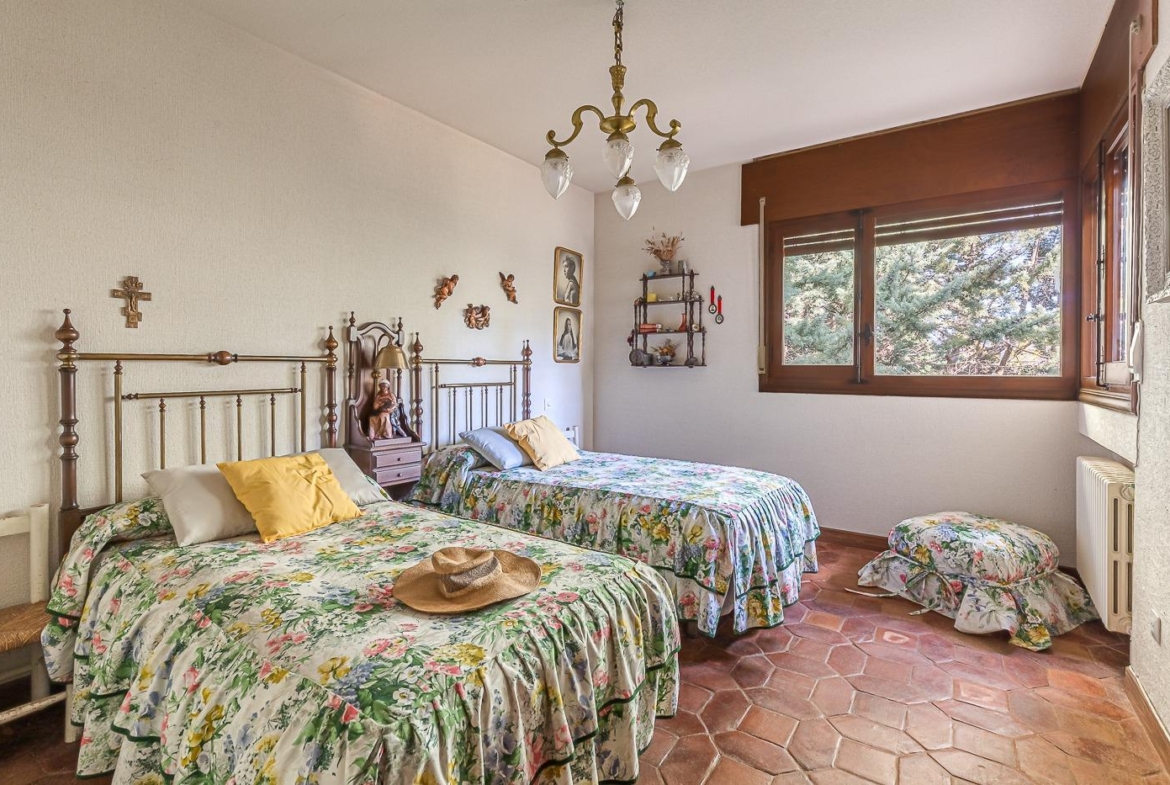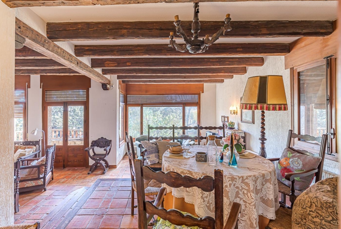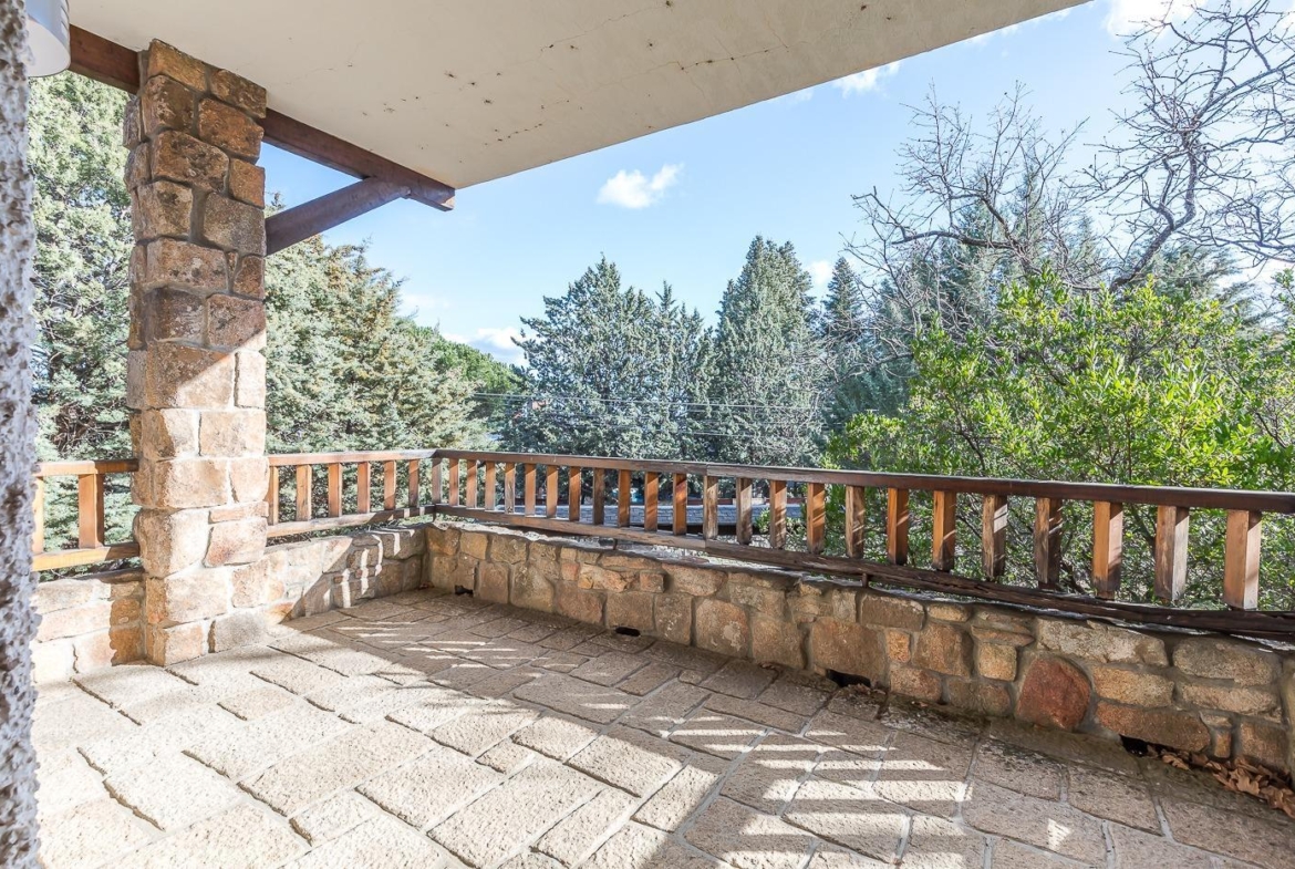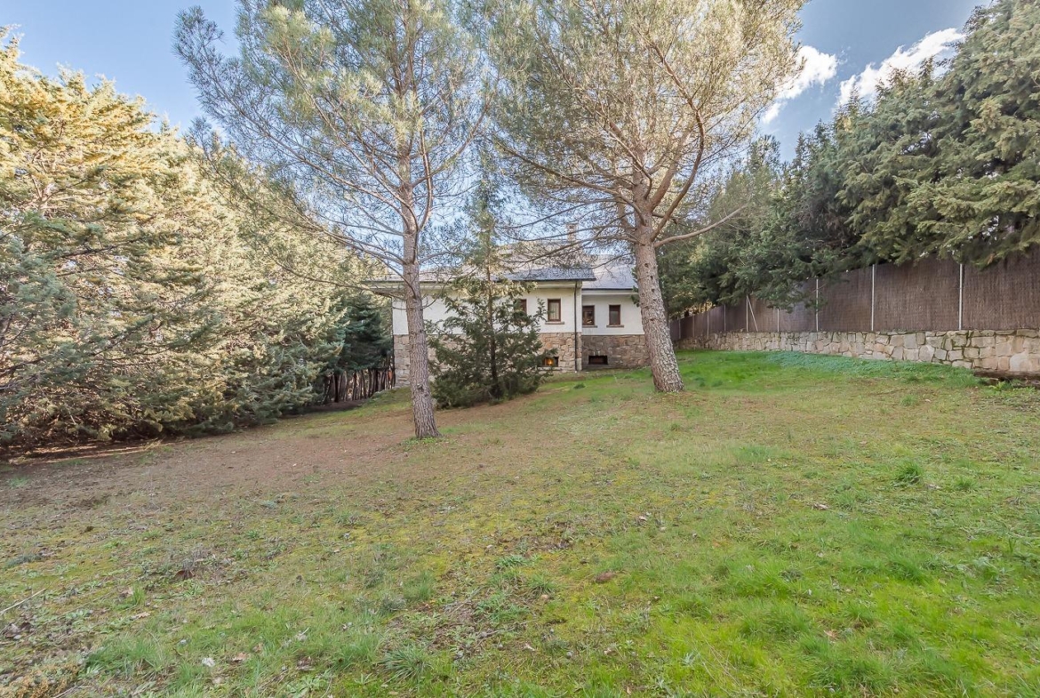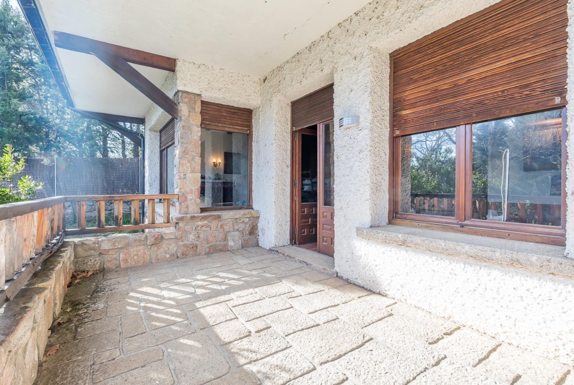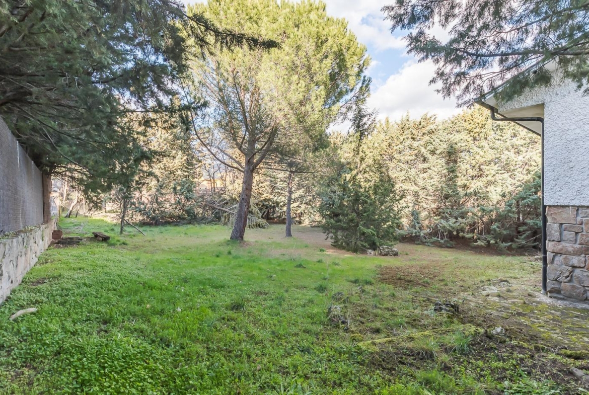 Esta casa unifamiliar se encuentra a la entrada del Pueblo de Navacerrada al lado de su embalse en una parcela individual de 1.326 metros, en su fachada esta la entrada al garaje y una terraza, por el lateral suben unas escaleras hacia la entrada principal por la que entramos a un recibidor desde el que de frente accedemos a un salón comedor con chimenea, acceso a la terraza y acceso también a la amplia cocina con despensa y una habitación secundaria con un baño, este a su vez se le puede dar uso de baño de cortesía. Desde el recibidor tenemos de frente a la derecha otra puerta que separa las escaleras que dan acceso a la planta alta y baja en la que encontramos el garaje, la sala de calderas y un par de estancias de gran tamaño para hacer habitaciones, una bodega, taller, baño, despensa….