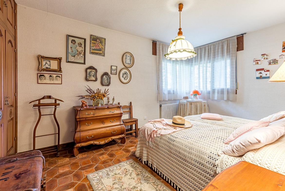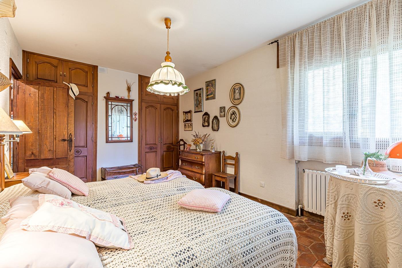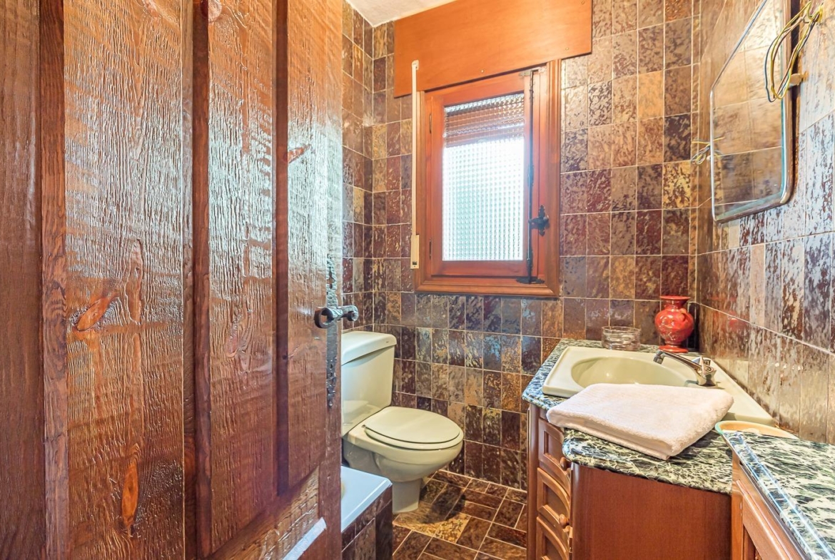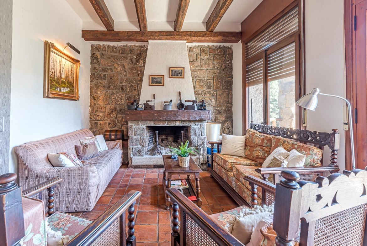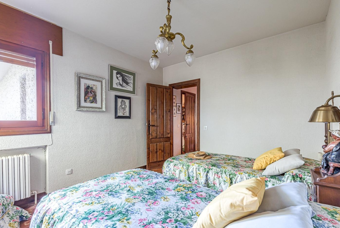 Esta casa unifamiliar se encuentra a la entrada del Pueblo de Navacerrada al lado de su embalse en una parcela individual de 1.326 metros, en su fachada esta la entrada al garaje y una terraza, por el lateral suben unas escaleras hacia la entrada principal por la que entramos a un recibidor desde el que de frente accedemos a un salón comedor con chimenea, acceso a la terraza y acceso también a la amplia cocina con despensa y una habitación secundaria con un baño, este a su vez se le puede dar uso de baño de cortesía. Desde el recibidor tenemos de frente a la derecha otra puerta que separa las escaleras que dan acceso a la planta alta y baja en la que encontramos el garaje, la sala de calderas y un par de estancias de gran tamaño para hacer habitaciones, una bodega, taller, baño, despensa….