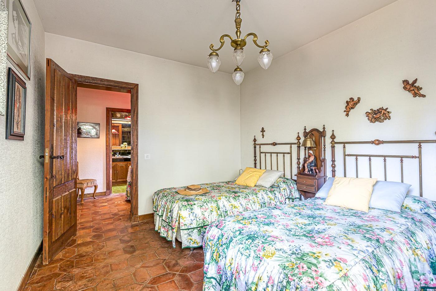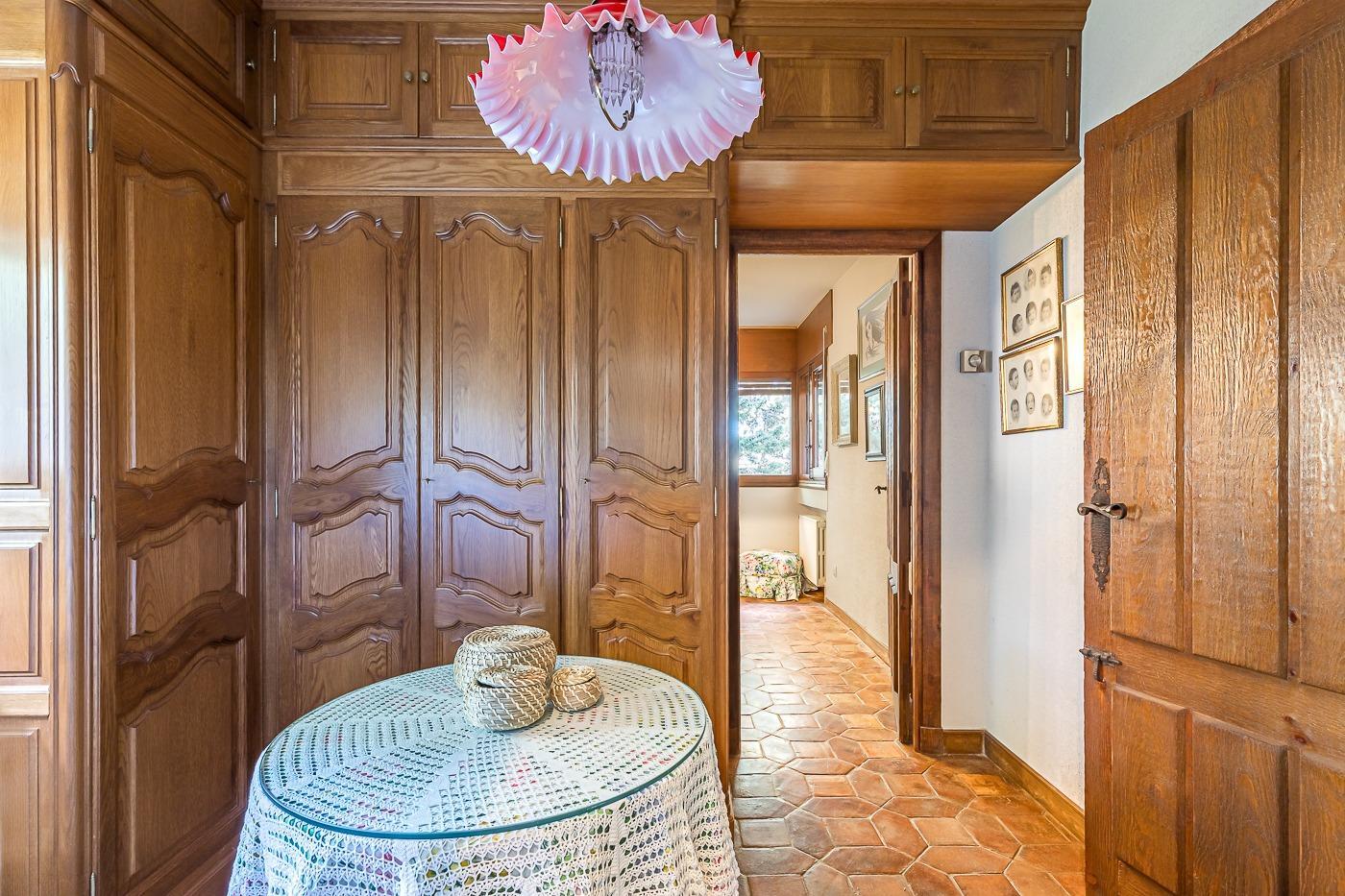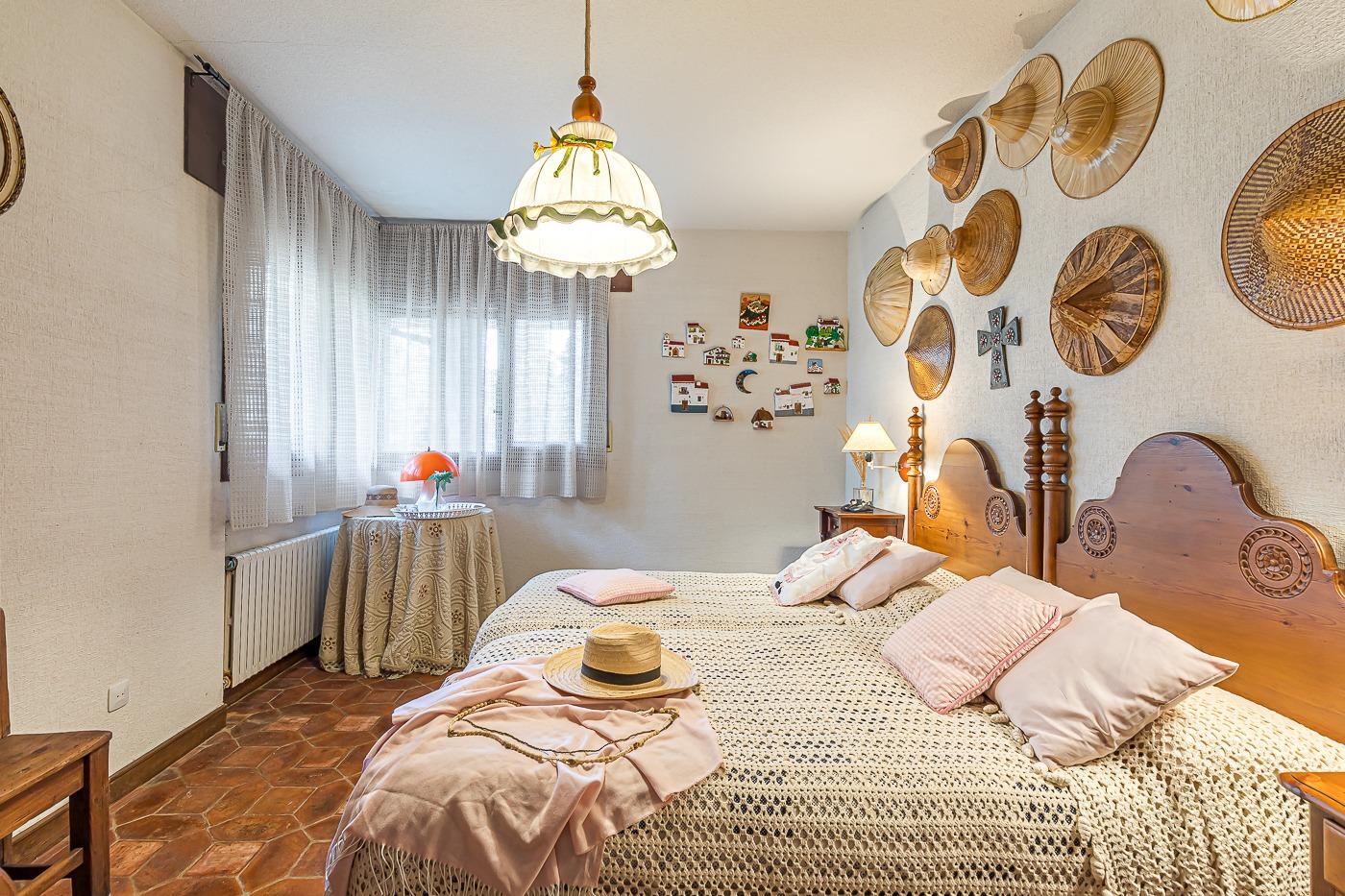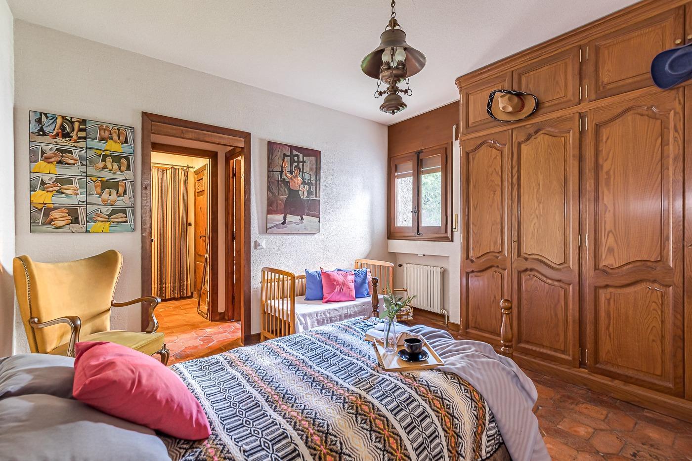 Desde el recibidor a mano derecha pasamos por un pasillo a tres habitaciones, al fondo de este está el principal con vestidor y baño en suite, a la derecha un dormitorio y un baño completo y a la izquierda el dormitorio que comunica con la cocina. Por la escalera subimos a la planta superior en la que hay una habitación con baño incluido y zona de estudio, un pequeño desván aprovechando la bajo cubierta y una sala de juegos con terraza con vistas al jardín.