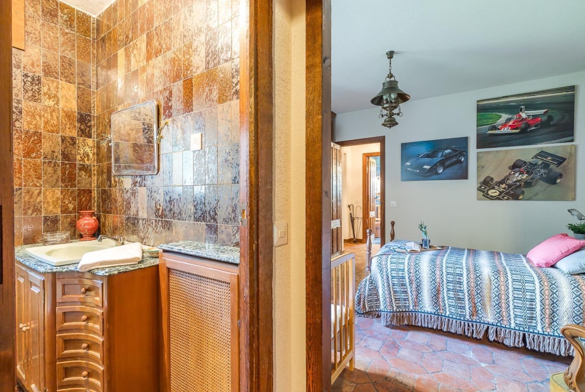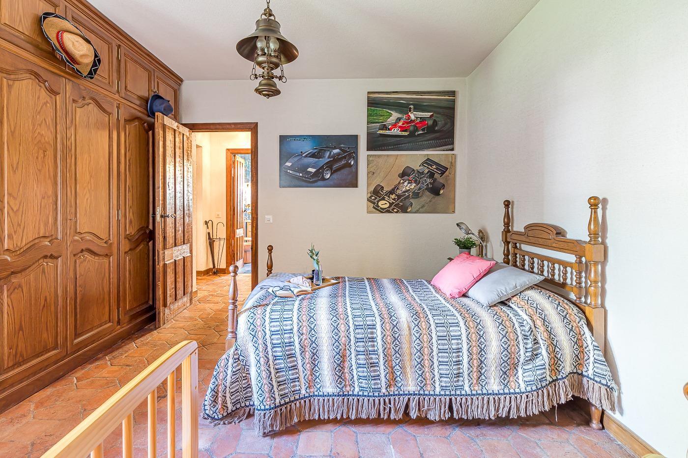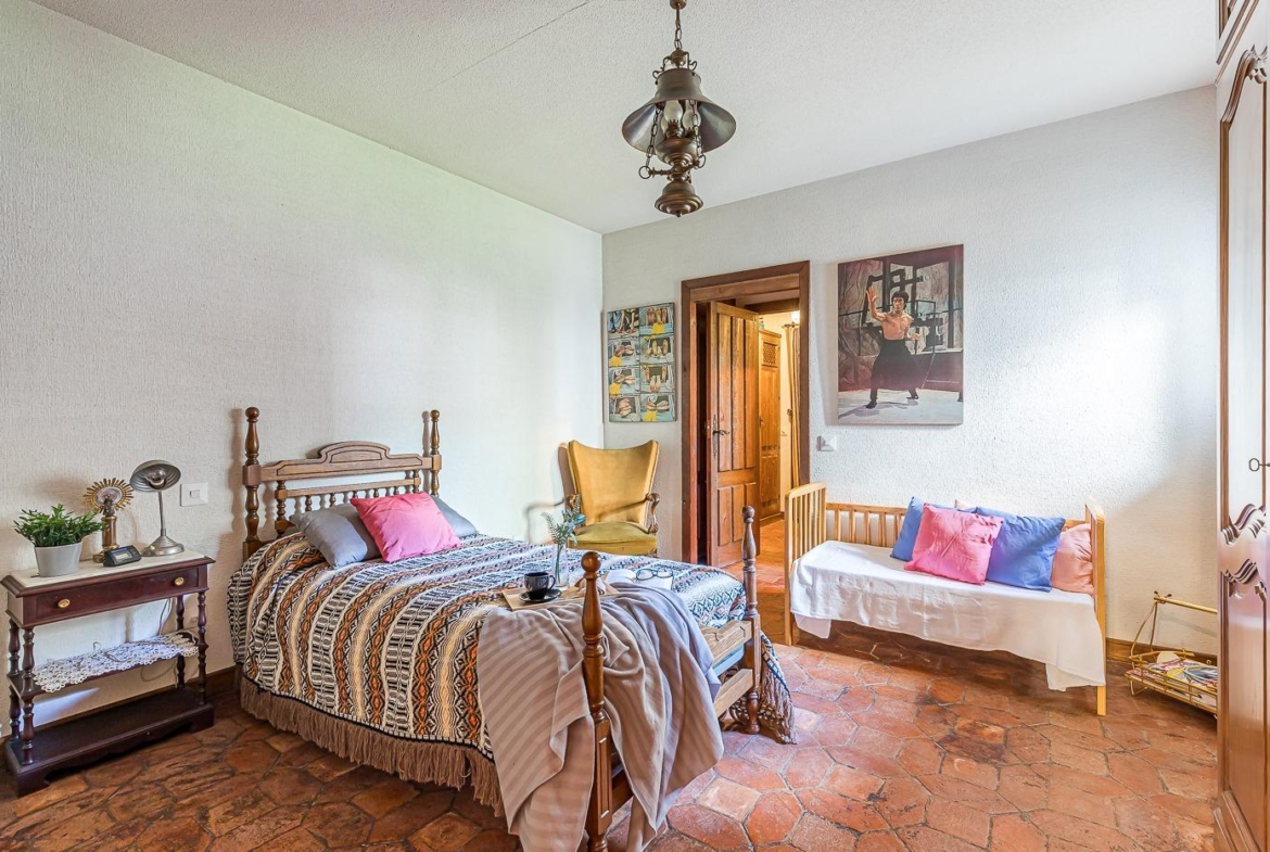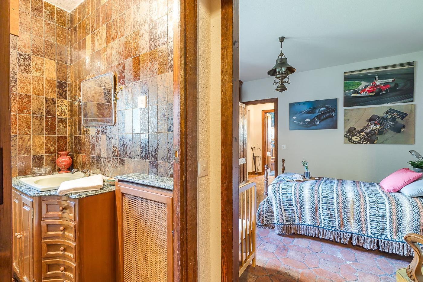 Desde el recibidor a mano derecha pasamos por un pasillo a tres habitaciones, al fondo de este está el principal con vestidor y baño en suite, a la derecha un dormitorio y un baño completo y a la izquierda el dormitorio que comunica con la cocina. Por la escalera subimos a la planta superior en la que hay una habitación con baño incluido y zona de estudio, un pequeño desván aprovechando la bajo cubierta y una sala de juegos con terraza con vistas al jardín.