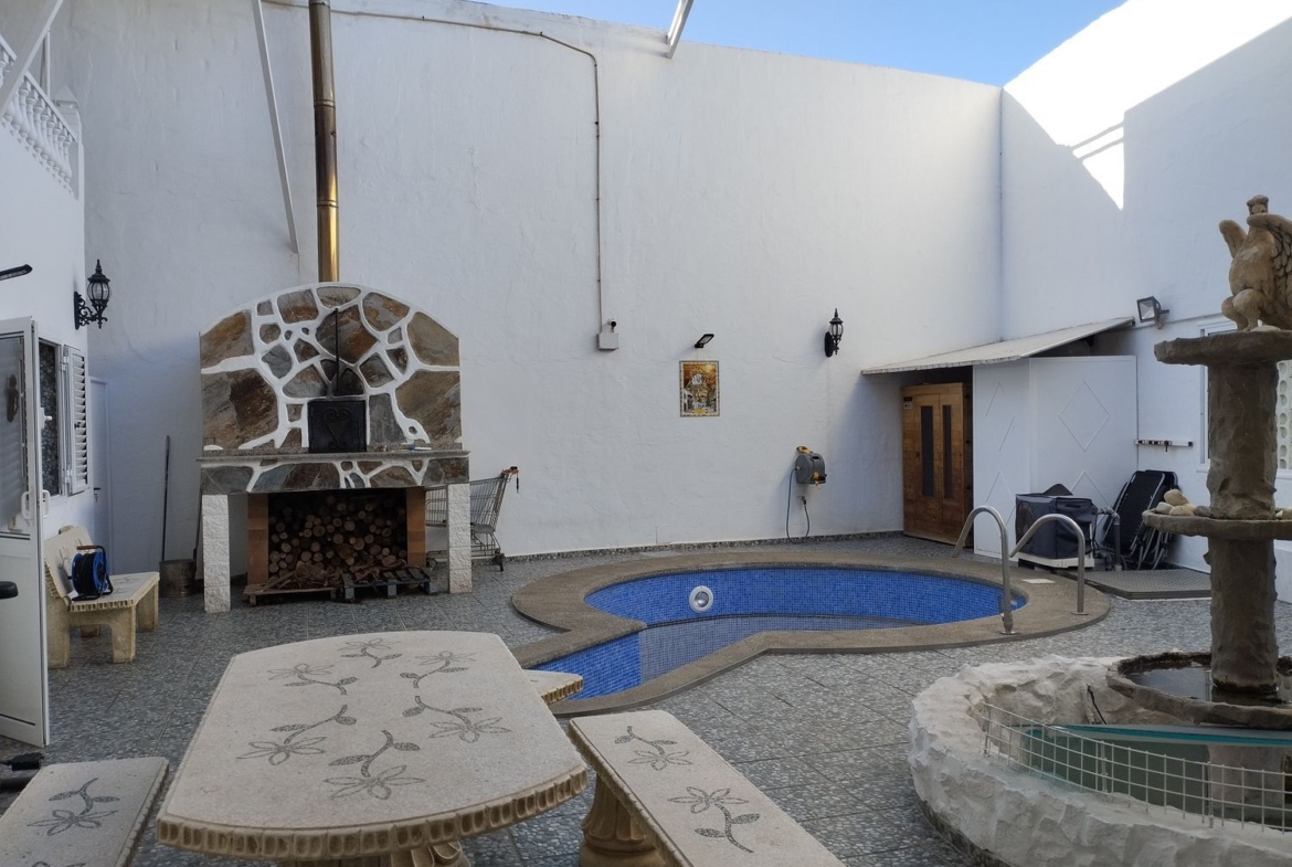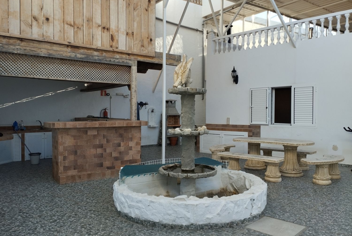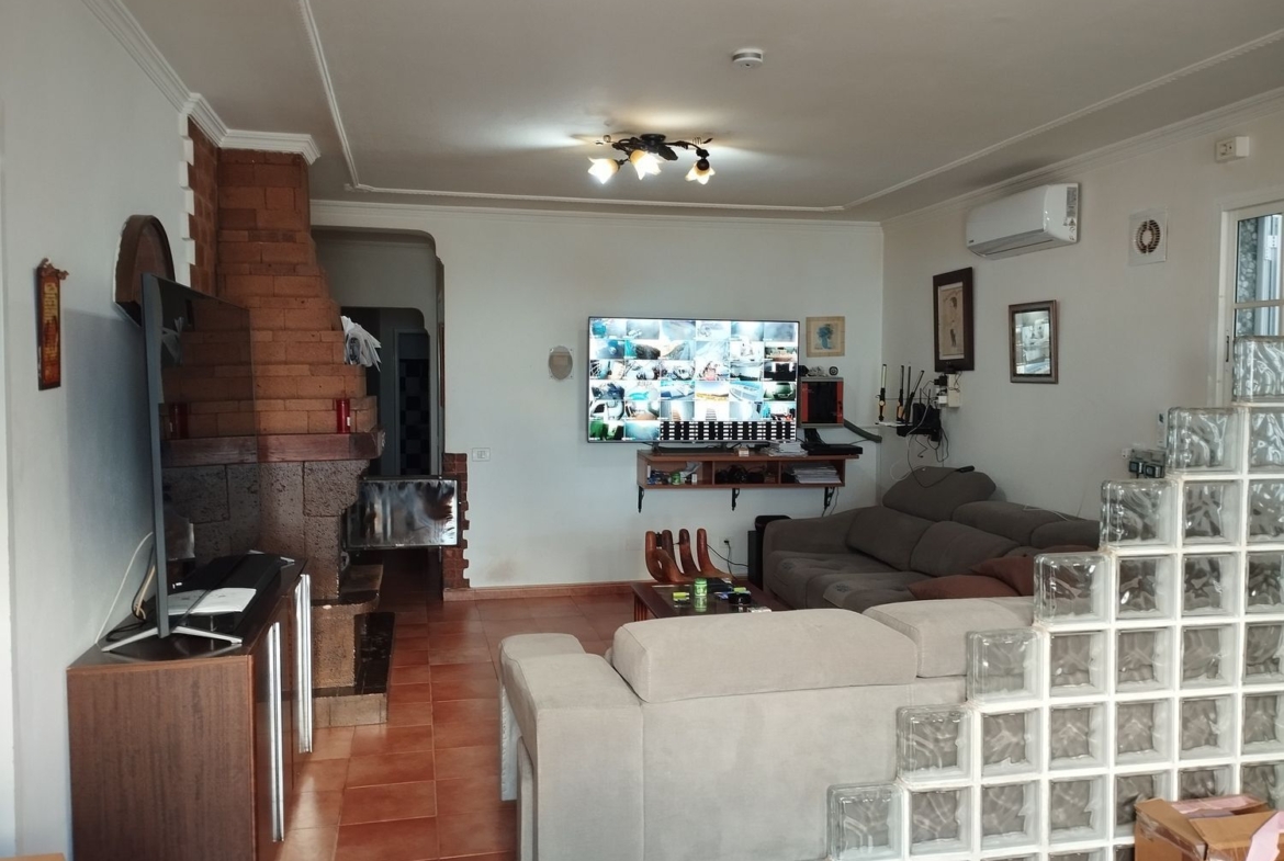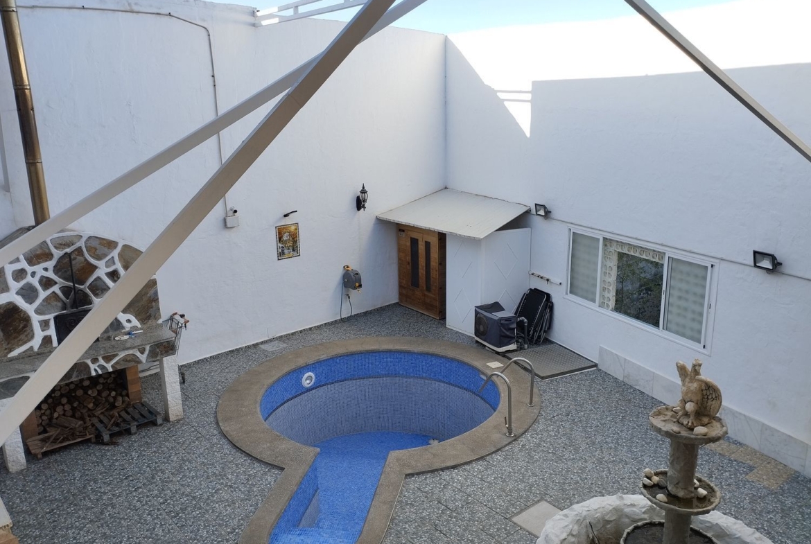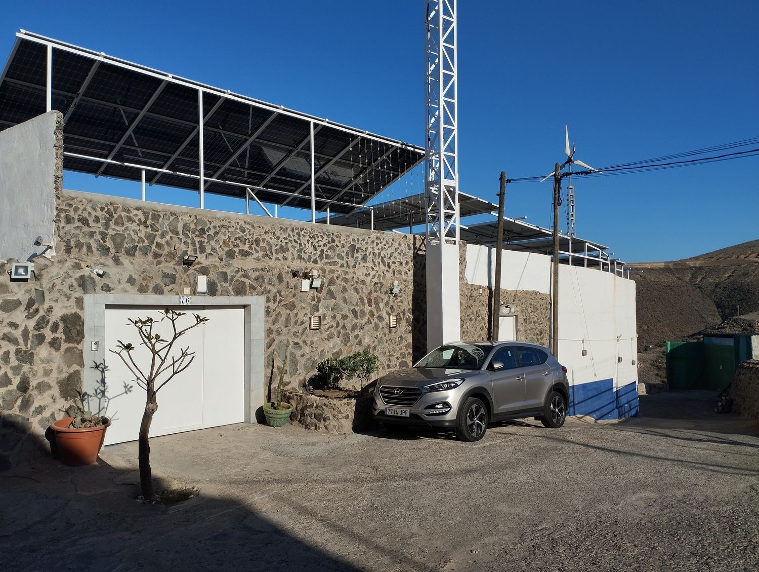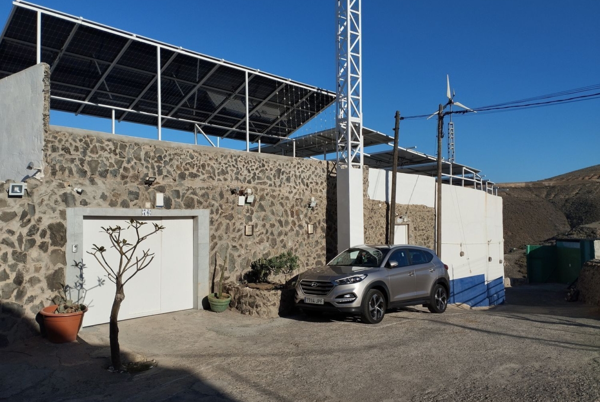 Espectacular finca con unas vistas maravillosas en la zona de Cardones, Arucas. Está compuesta por un chalet más una nave industrial y un trozo de terreno rústico. La vivienda está compuesta por tres dormitorios, dos baños, un aseo, salón, cocina y solana. Equipado con aire acondicionado y chimenea. Desde el salón salimos al patio donde nos encontramos con la zona de recreo, que dispone de barbacoa, fuente y piscina con bomba de calor. Toda la propiedad está videovigilada con 32 cámaras. A la vivienda se accede desde el garaje que tiene capacidad para dos coches y varias motos. Justo al lado de la vivienda tenemos una nave con despacho de unos 355 metros cuadrados aproximadamente con puerta de garaje. Instalado y en funcionamiento de aerogeneradores y placas solares para la producción y almacenamiento en baterías de litio de energía solar para la vivienda y la nave. Como suplemento a la misma, por si hiciera falta, dispone de un grupo electrógeno complementario en caso de mal tiempo.