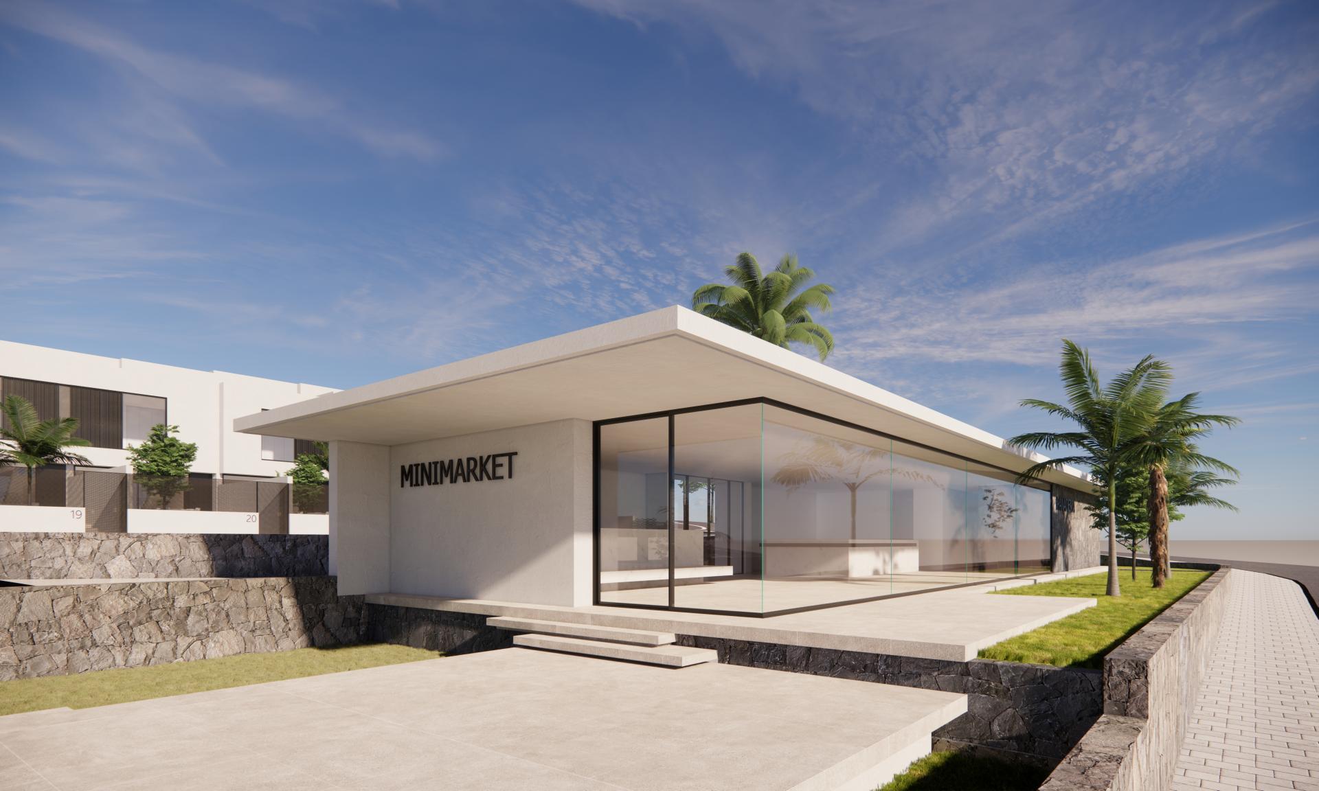 Zona comercial con panadería, cafetería, terraza al aire libre, minimarket y sala multiuso