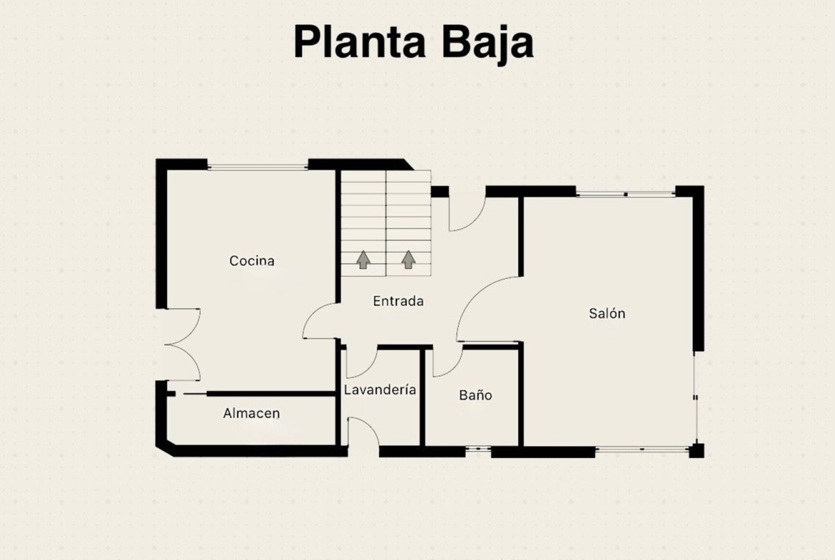 Planta baja: salón con acceso directo a la terraza, baño completo, lavandería y cocina con office y despensa, totalmente equipada, con salida a la zona exterior que rodea la casa.