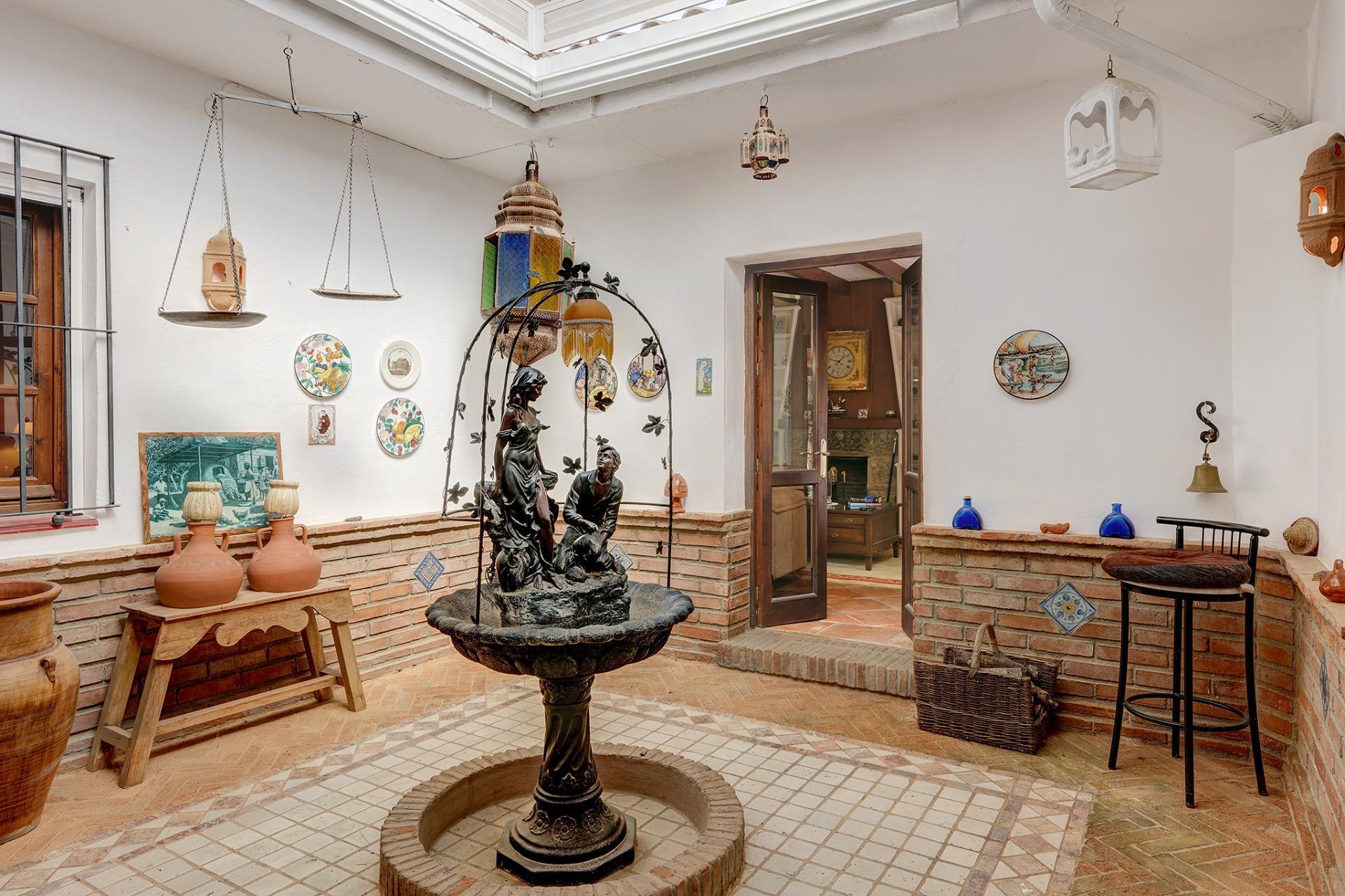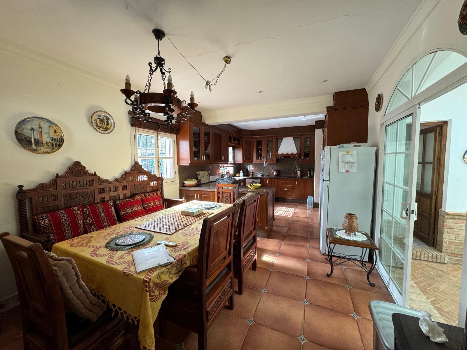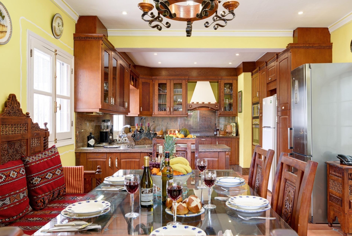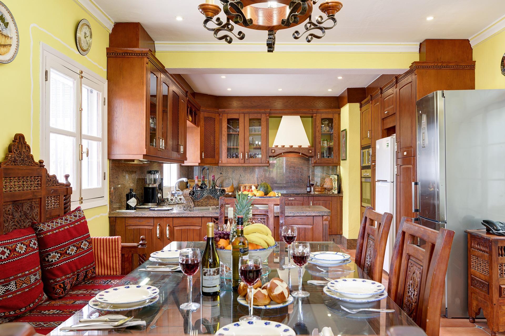 Una cocina muy amplia totalmente equipada y amueblada con acceso a un precioso patio andaluz con una fuente.