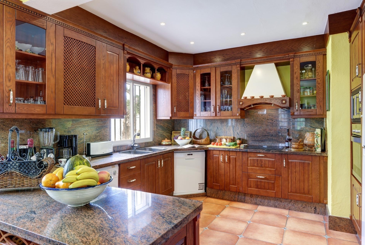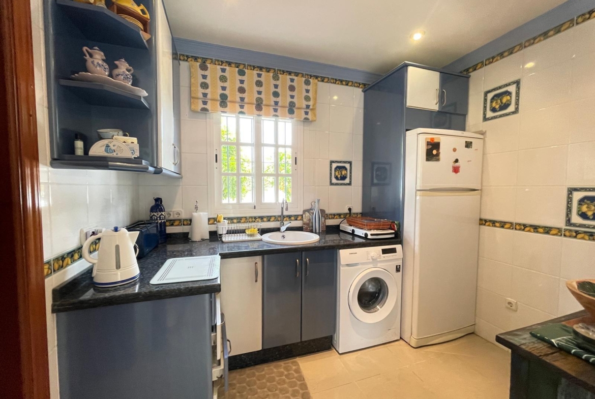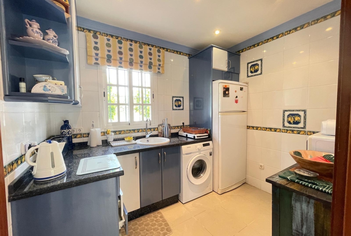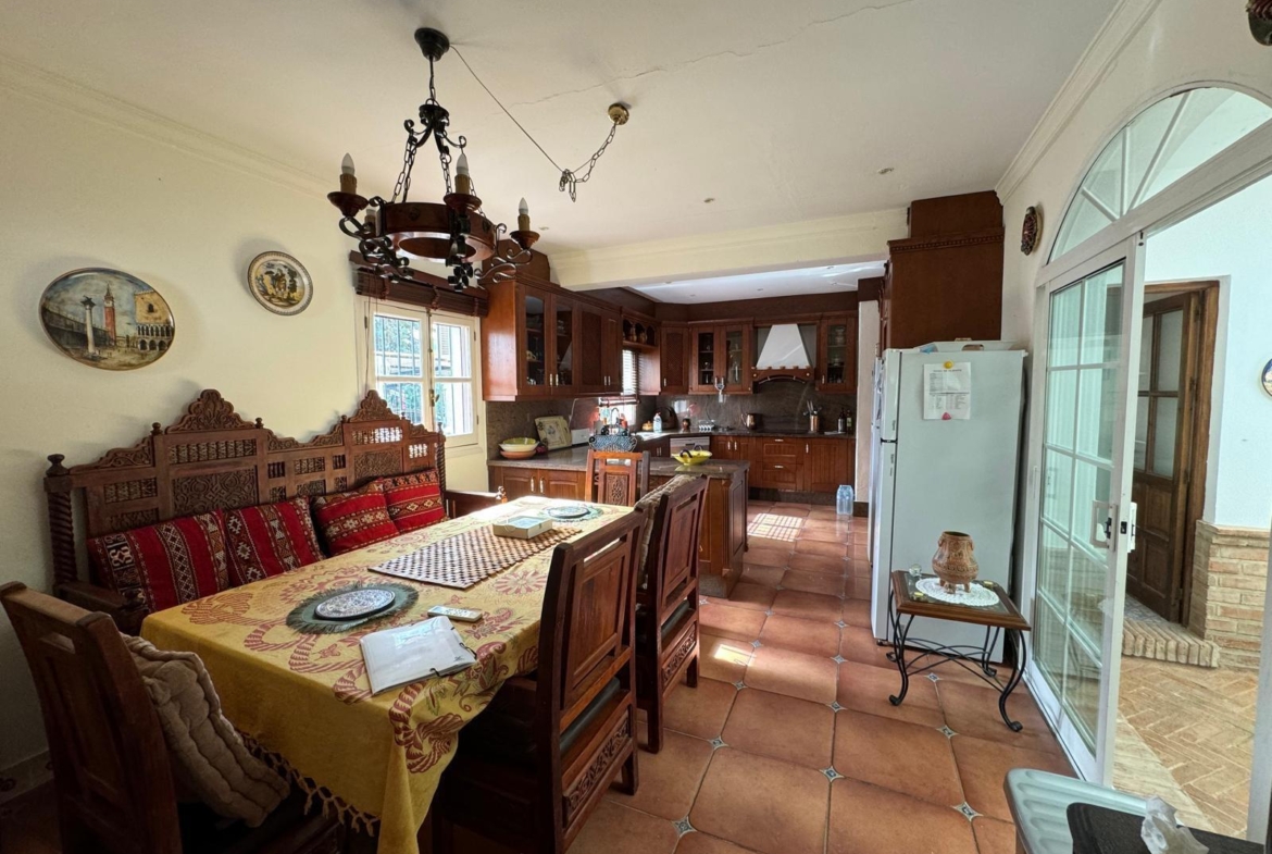 Una cocina muy amplia totalmente equipada y amueblada con acceso a un precioso patio andaluz con una fuente.