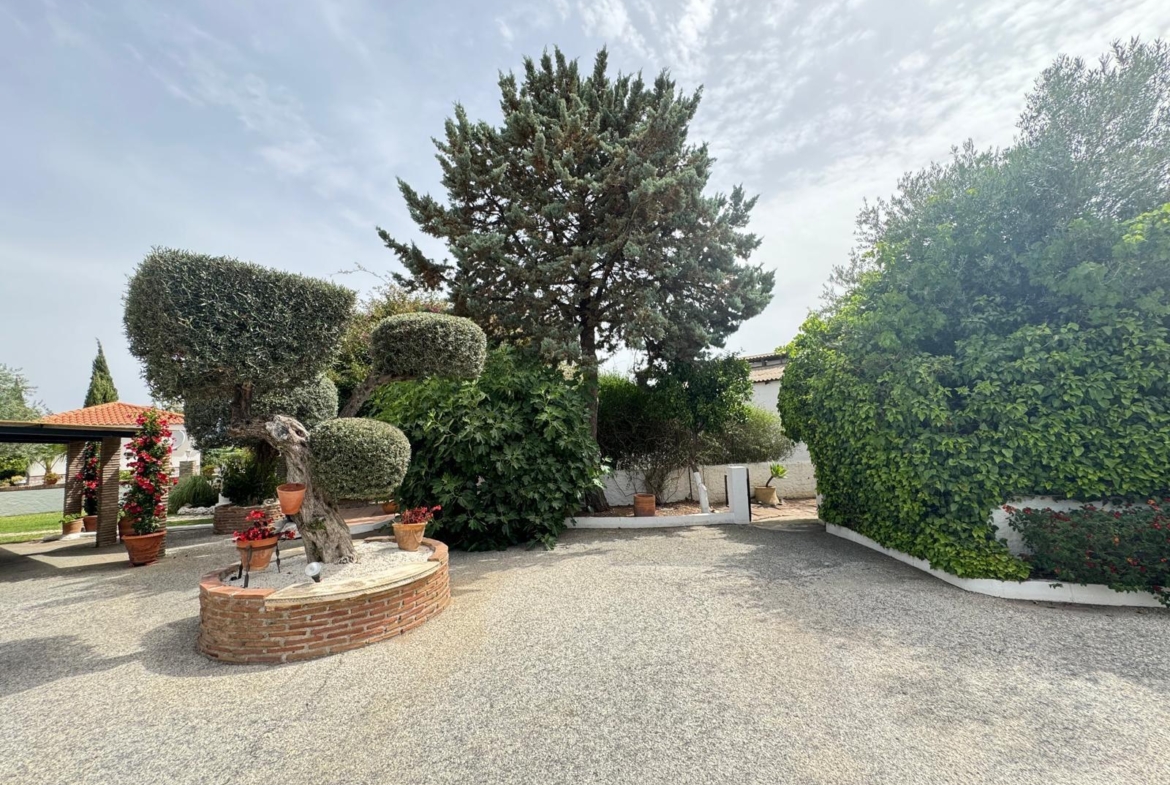 La entrada privada de la villa, adornada con un majestuoso paseo de palmeras, cipreses con amplias zonas verdes a ambos lados del acceso, y un amplio aparcamiento con capacidad para numerosos vehículos.
