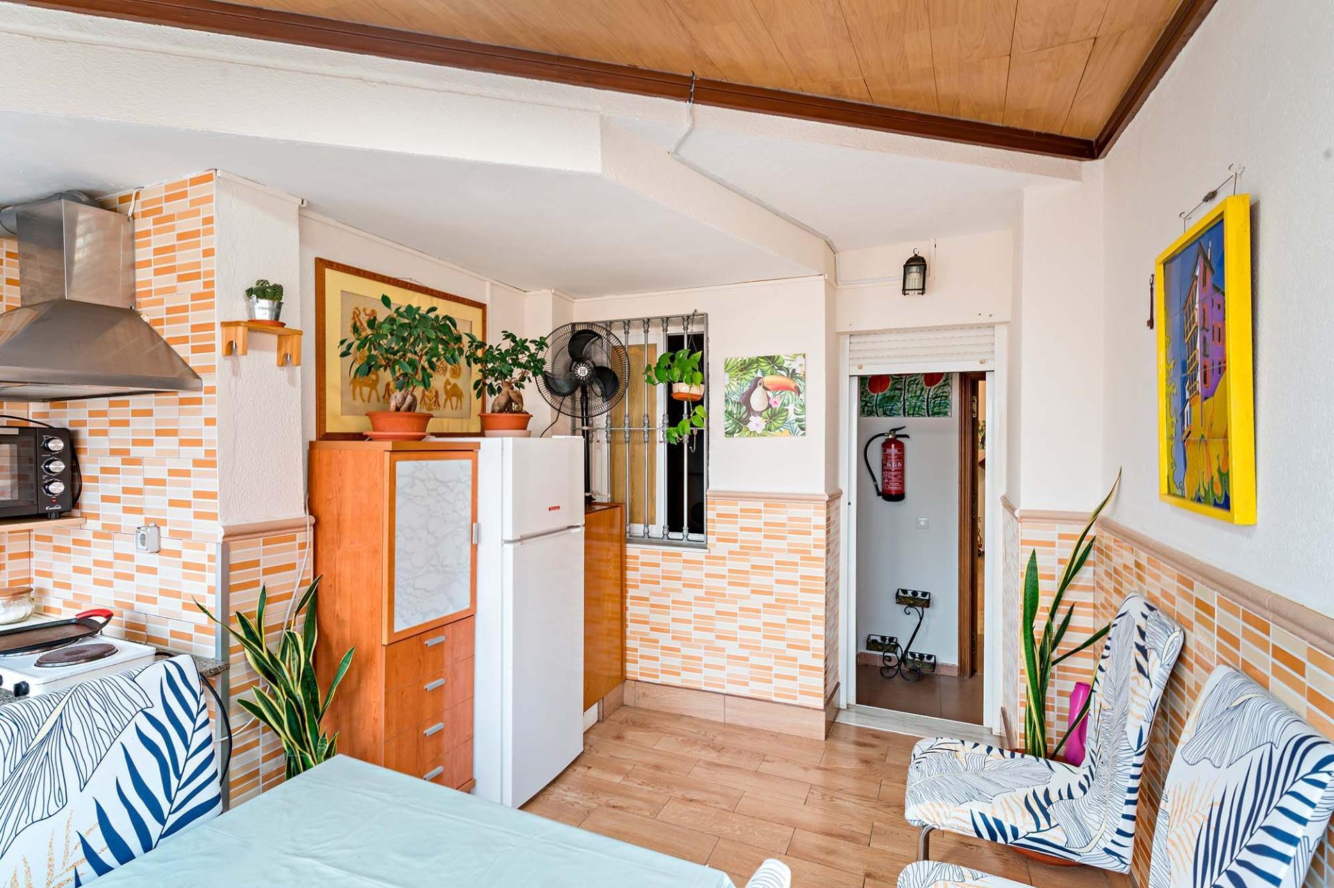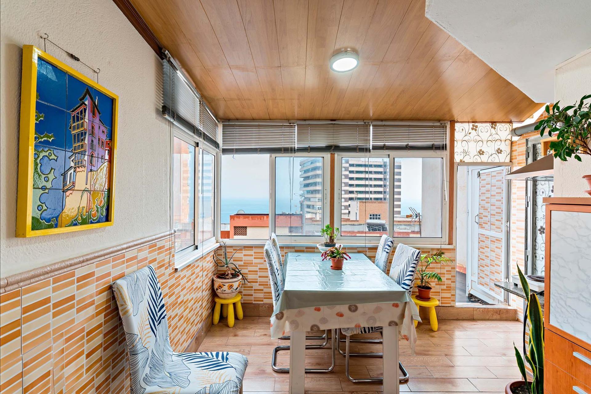 La terraza acristalada con vistas al mar, ideal para tener reuniones con amigos gracias a sus ventanales, . a sus ventanales, y dos trasteros, Ideal para tener el espacio de almacenaje que necesitamos. Y un espacio para hacer de comer.