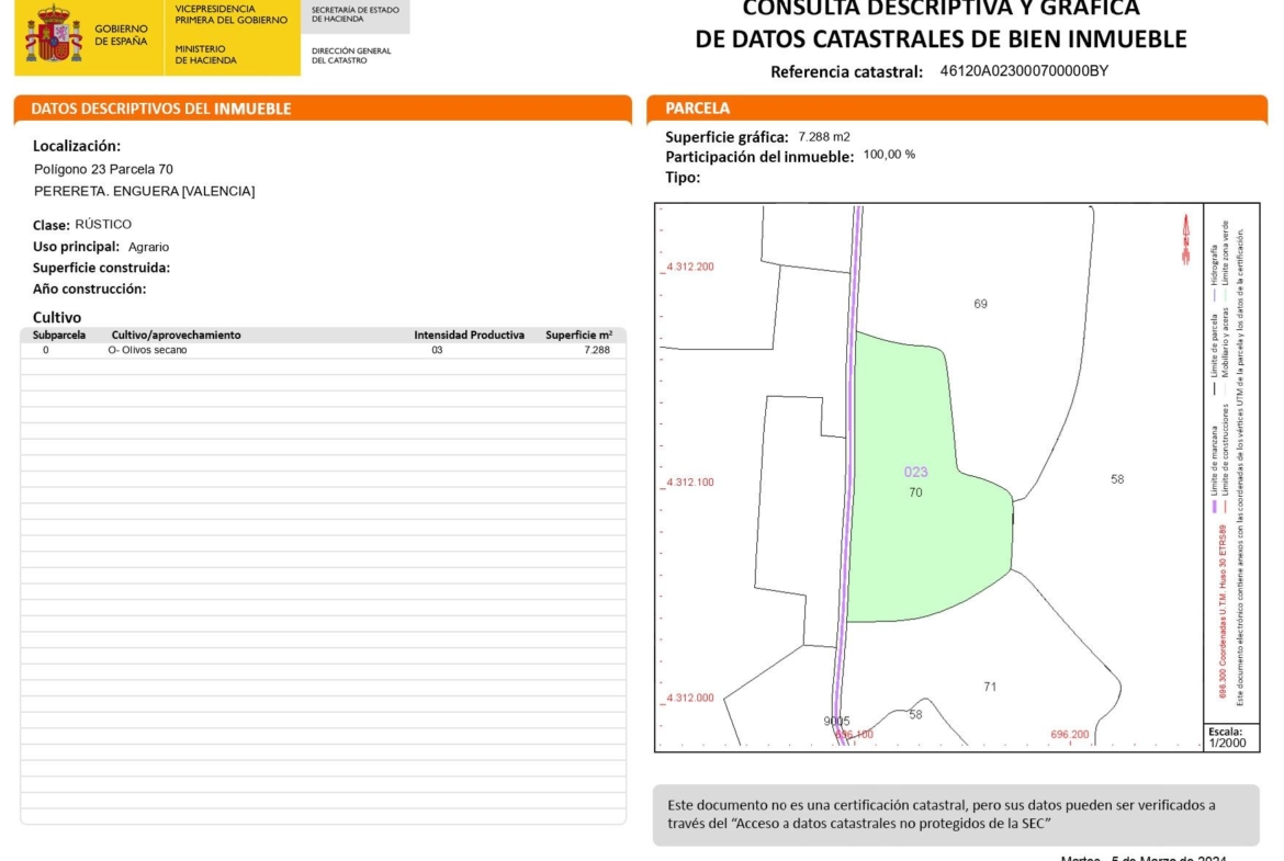Te ofrezco una oportunidad de ahorro. Sí, como lo estás leyendo, de ahorrar. ¿Por qué lo digo? Porque este terreno de más de 7.000 m2 está en producción de olivos. Así que, tal y como está el precio del aceite de oliva en la actualidad, si compras este terreno estás prácticamente ahorrado. Se encuentra en la localidad de Enguera, en la zona de la Perereta, a unos 8 kilómetros de la población y con un acceso sencillo. Únicamente los últimos 950 metros está sin asfaltar. Lo dicho, una oportunidad.