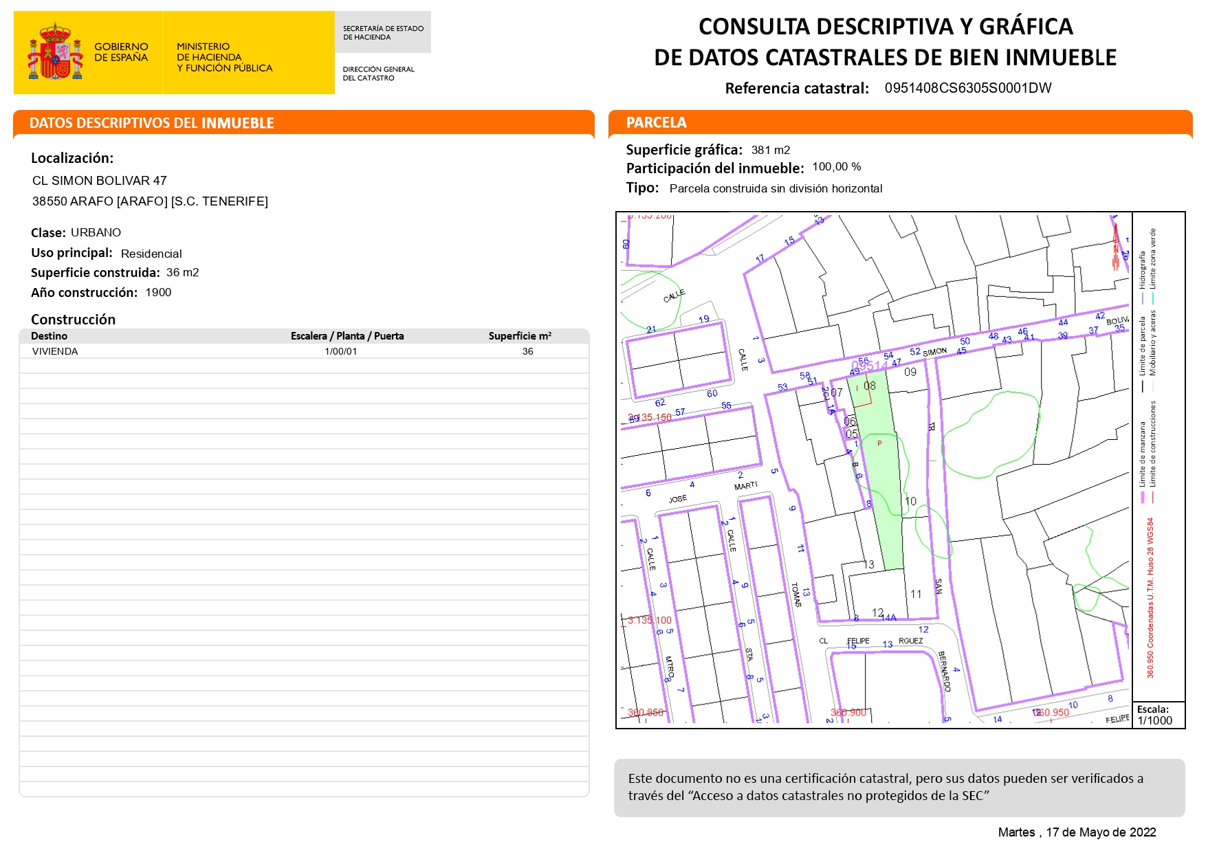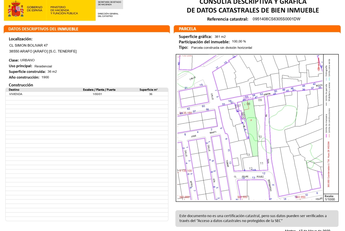 Se vende terreno totalmente urbano de 392 m2 en la Calle Simón Bolívar de Arafo que además cuenta con una edificación de 36 m2 según el catastro, actualmente la edificación carece de inmatriculación en el registro de la propiedad. En una zona tranquila y familiar donde podrás construir tu hogar y adaptarlo a ti. Llámame para verlo y te doy toda la información. No esperes más, es el momento de tener tu propia casa.