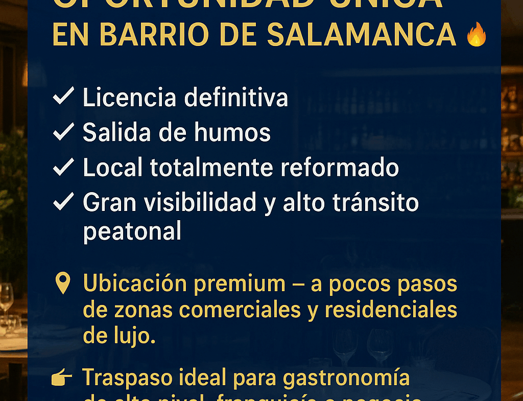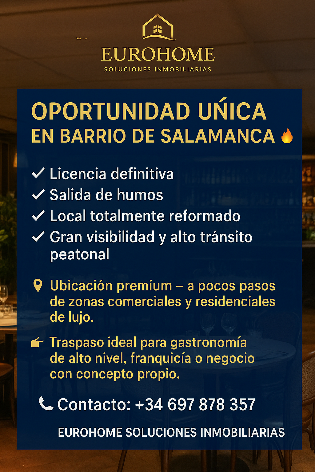 ¡¡¡En el corazón de Madrid, en la exclusiva y vibrante zona del barrio Salamanca, se presenta una oportunidad única de traspaso que no puedes dejar pasar. Este atractivo local, situado en una de las áreas más prestigiosas de la capital, cuenta con un ambiente sofisticado y acogedor, ideal para emprendedores que buscan establecer su negocio en un entorno que respira elegancia y éxito. La ubicación privilegiada asegura un flujo constante de clientes, gracias a la cercanía a boutiques de lujo, restaurantes de alta gama y diversas opciones de ocio que hacen de este barrio un destino ineludible para los amantes de la buena vida.