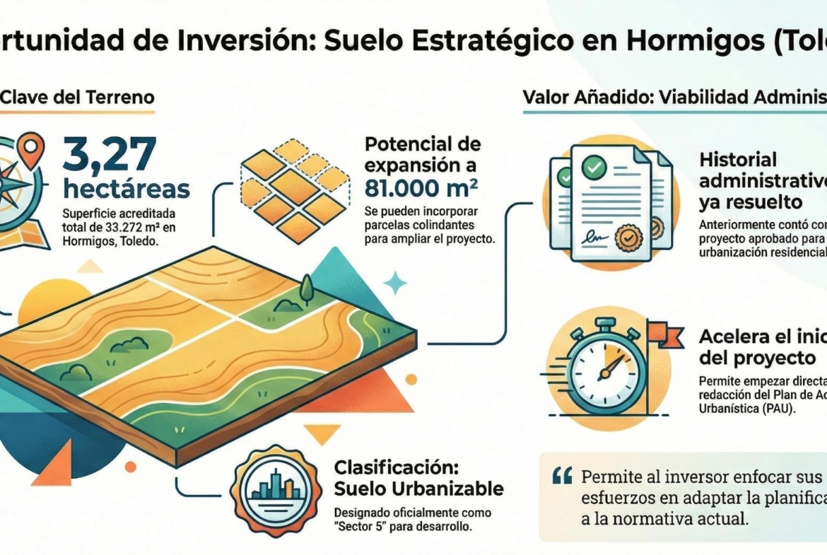 Esta venta representa la oportunidad de adquirir un suelo estratégicamente ubicado y con el historial administrativo resuelto, permitiendo a la nueva propiedad iniciar la redacción del Plan de Actuación Urbanística (PAU) ajustado a la normativa vigente de Castilla-La Mancha, maximizando la edificabilidad y el diseño.