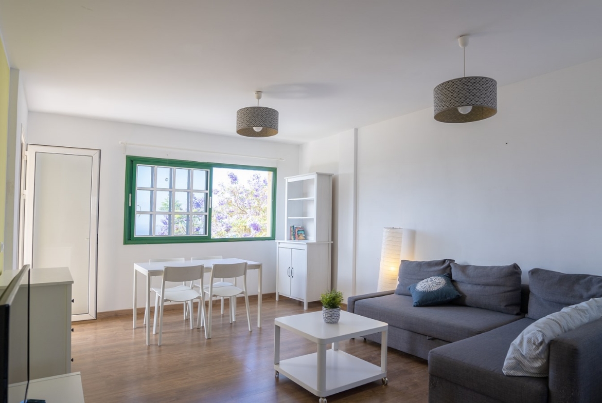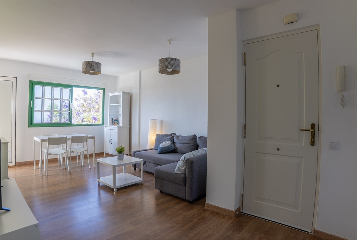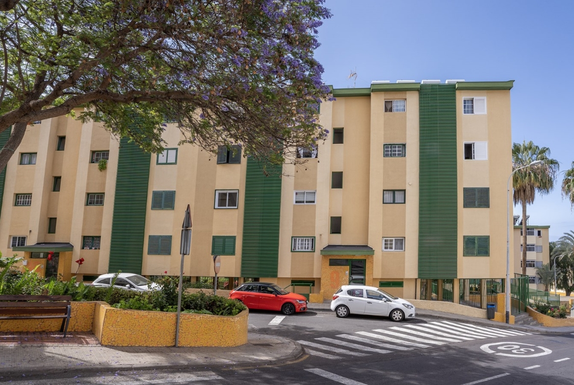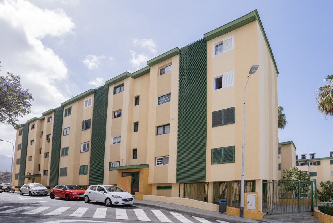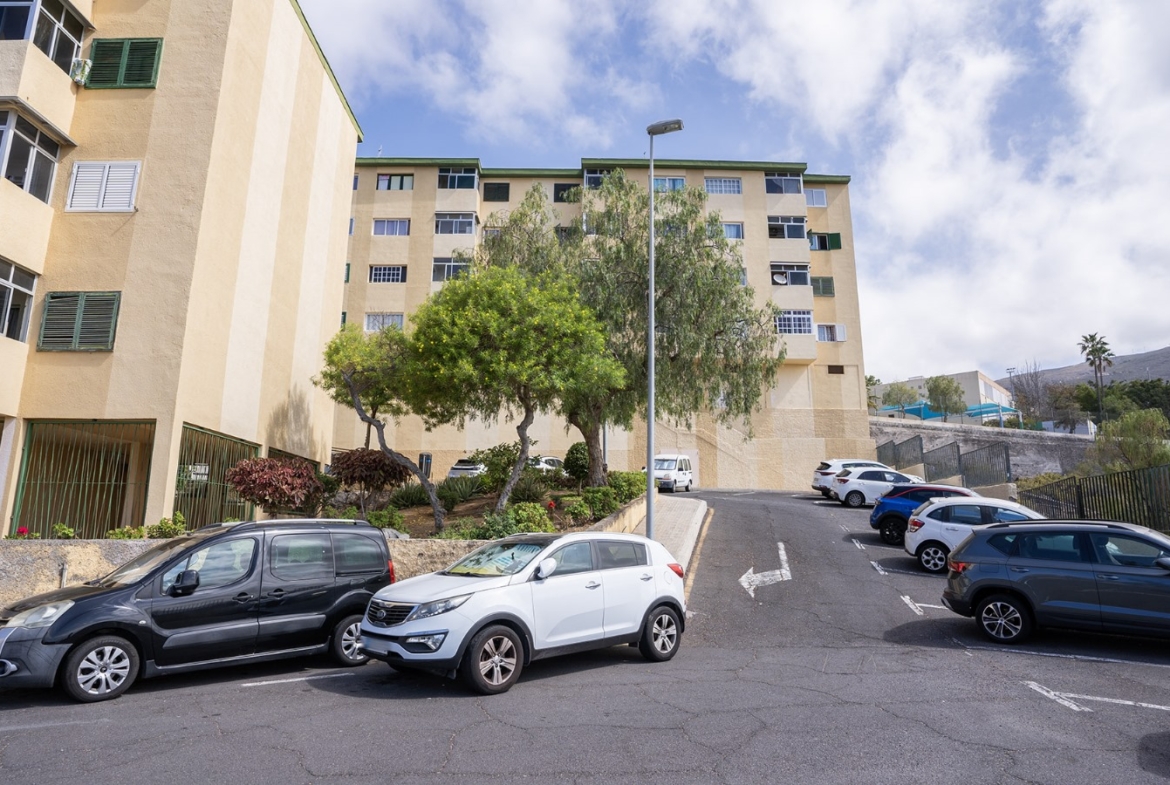 La vivienda se encuentra en un cuarto piso, y está distribuida en salón comedor con vistas despejadas hacia el mar y La Gomera, cocina independiente junto con una pequeño cuarto de lavandería. Luego a través del pasillo se encuentra la zona de noche, que cuenta con 3 habitaciones y un baño, dos de las habitaciones cuentan con vistas hacias el mar y una de ellas con vista hacia la calle interna de la urbanización adornada de altos árboles florales.