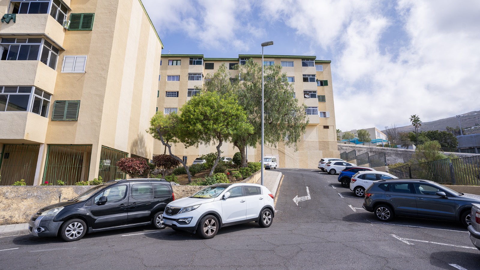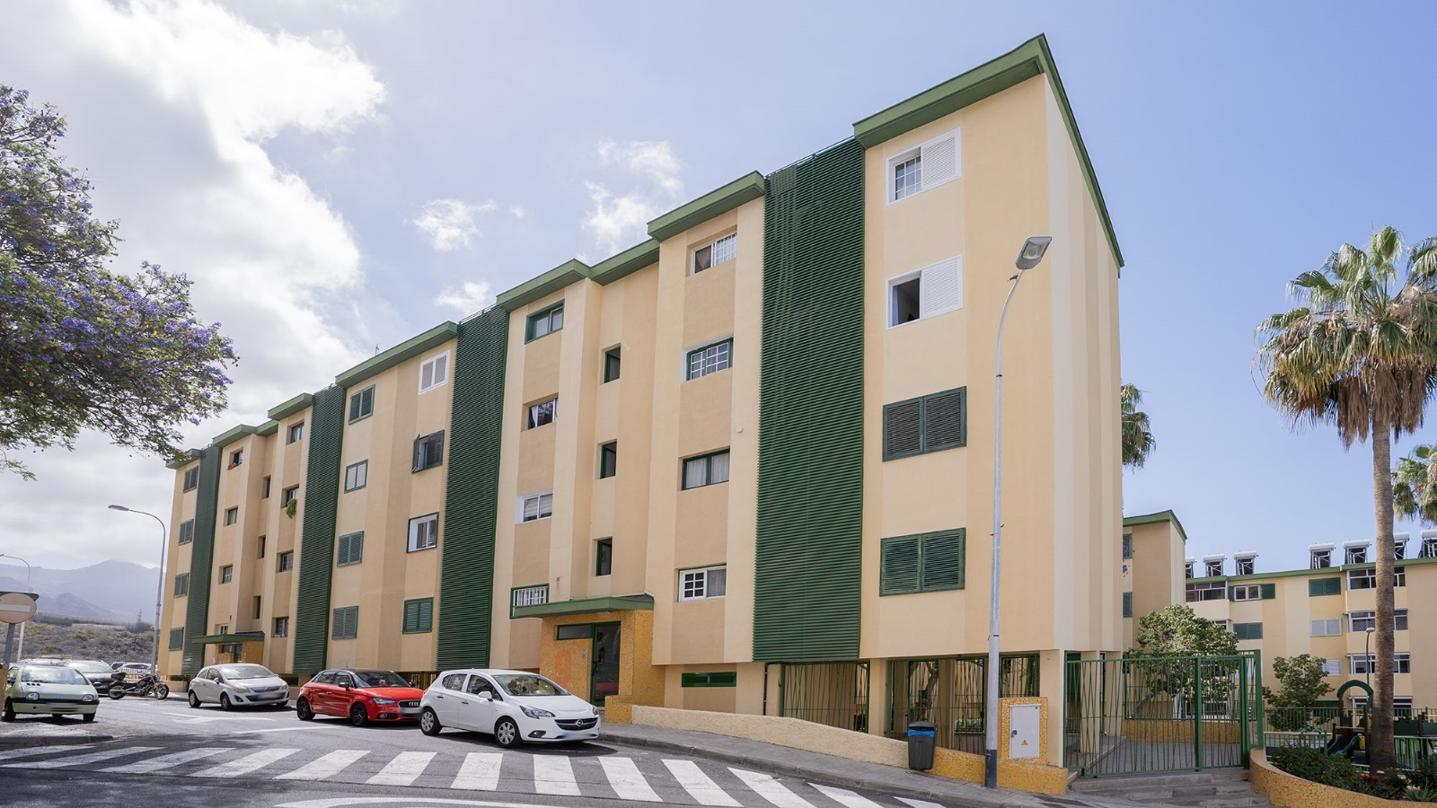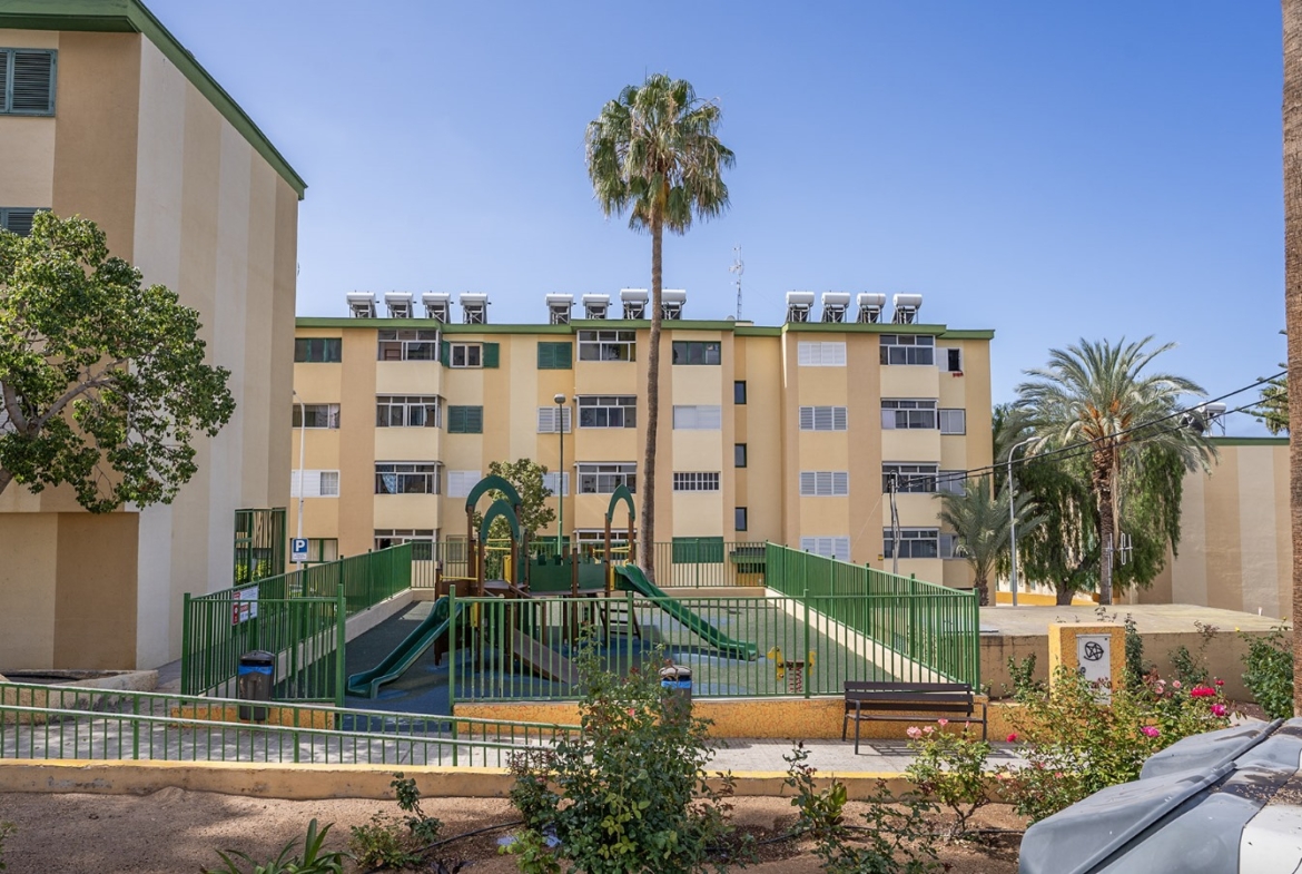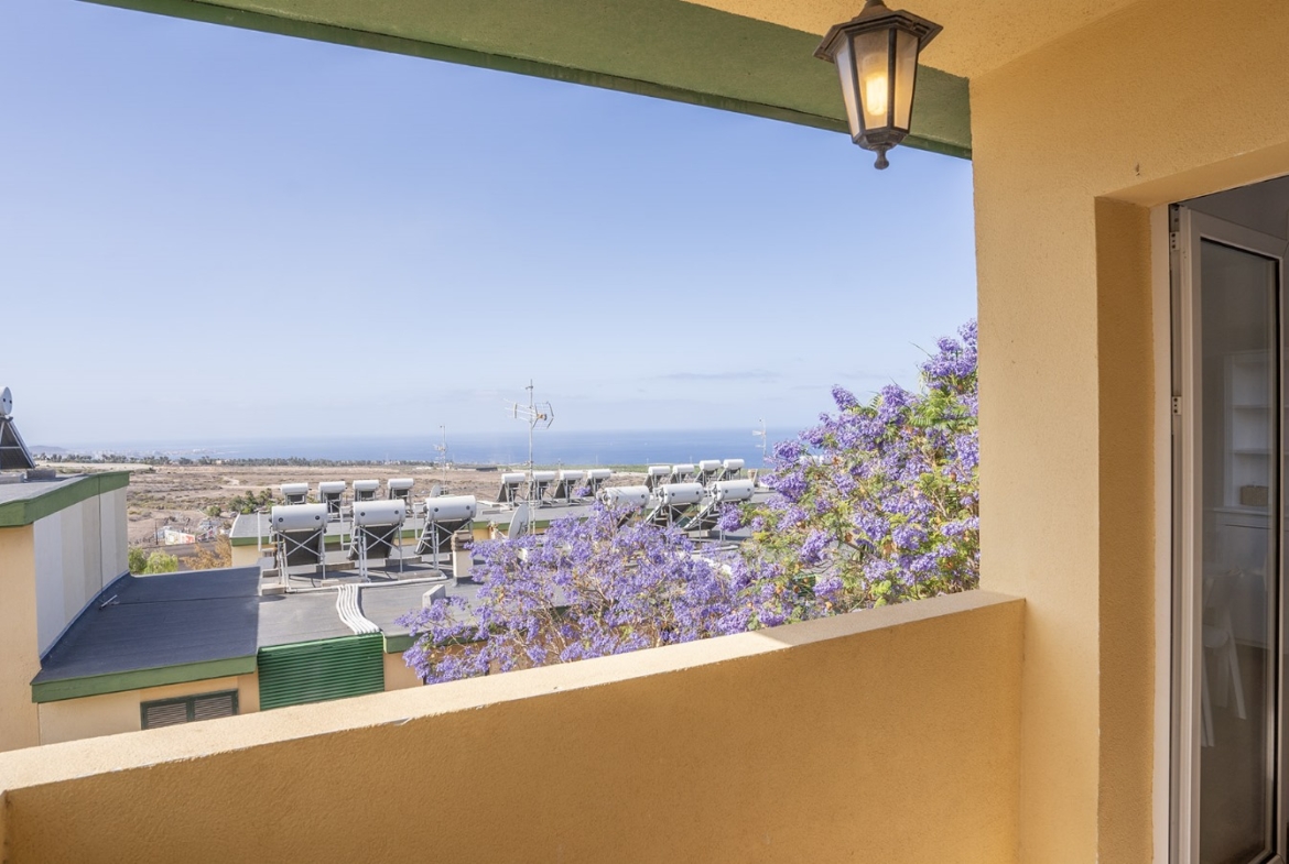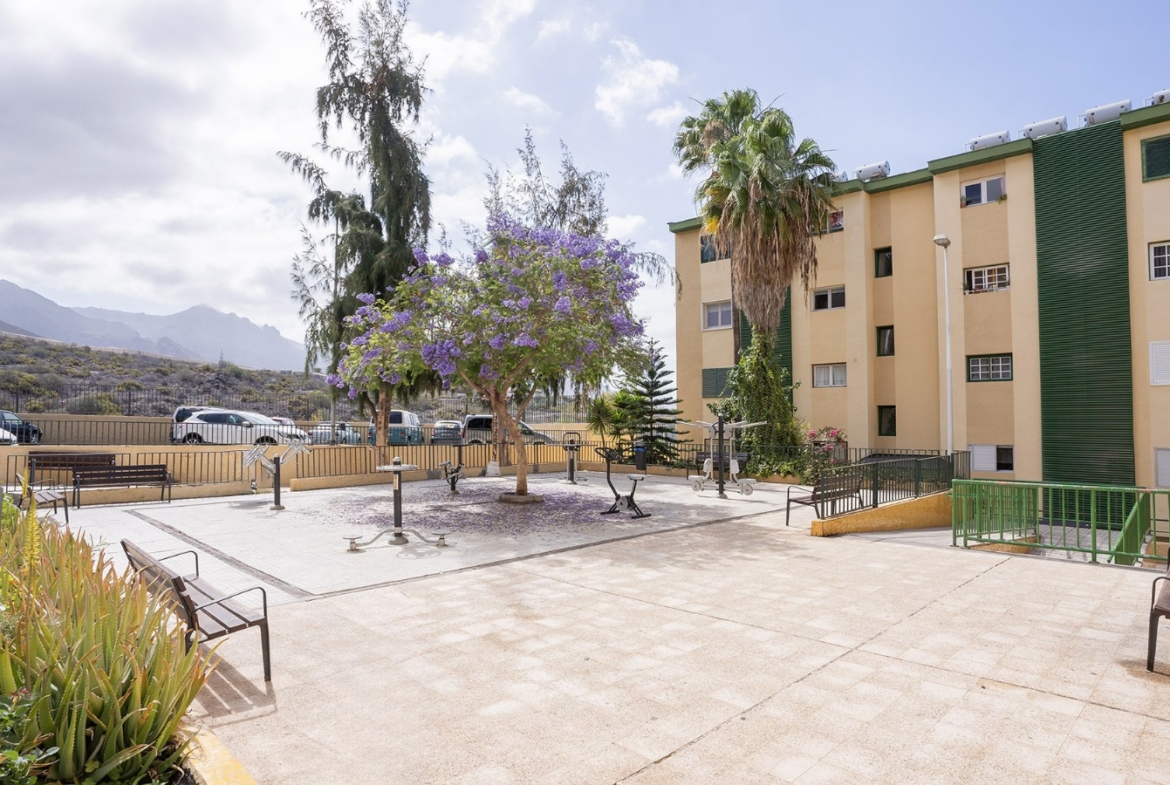 La vivienda se encuentra en un cuarto piso, y está distribuida en salón comedor con vistas despejadas hacia el mar y La Gomera, cocina independiente junto con una pequeño cuarto de lavandería. Luego a través del pasillo se encuentra la zona de noche, que cuenta con 3 habitaciones y un baño, dos de las habitaciones cuentan con vistas hacias el mar y una de ellas con vista hacia la calle interna de la urbanización adornada de altos árboles florales.