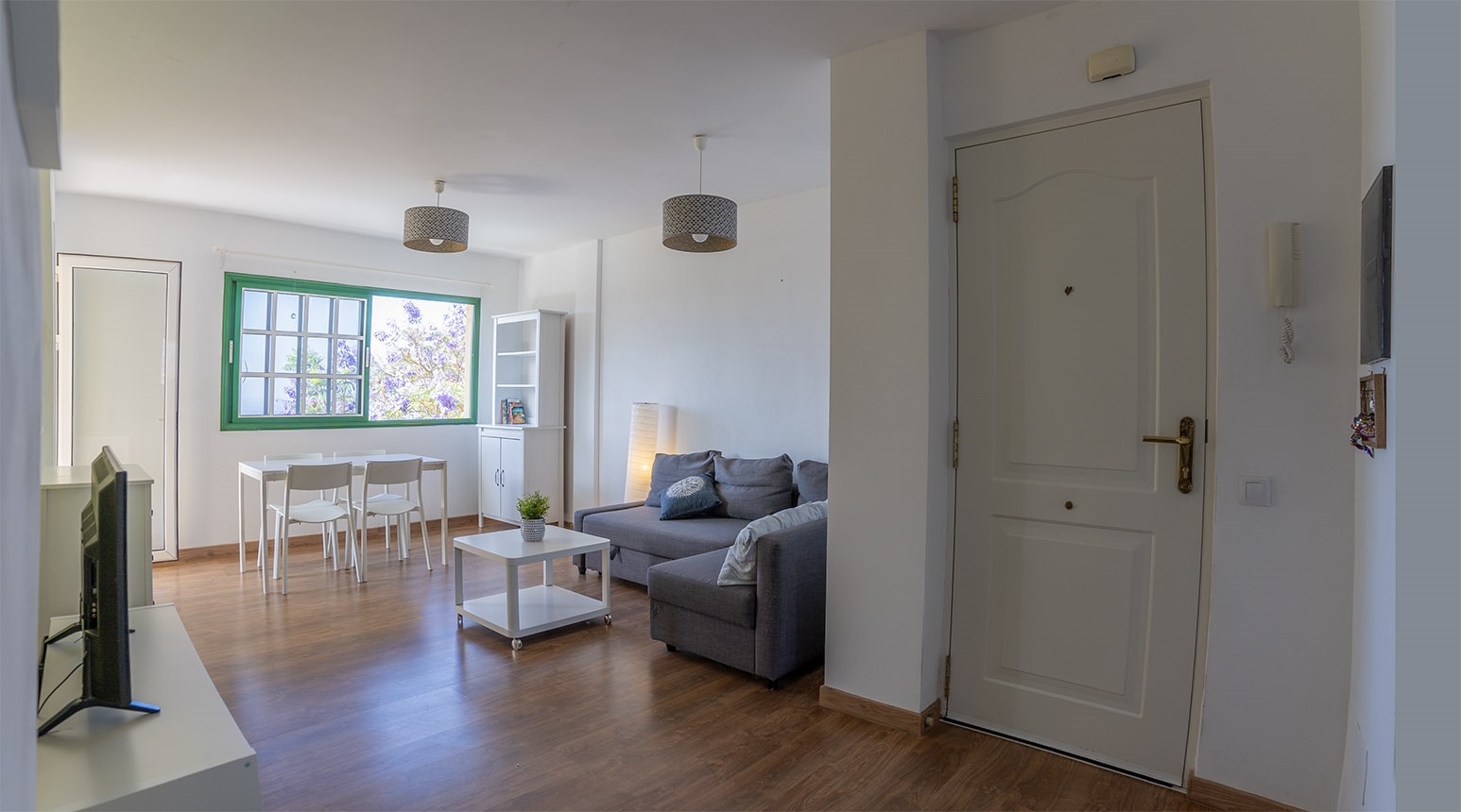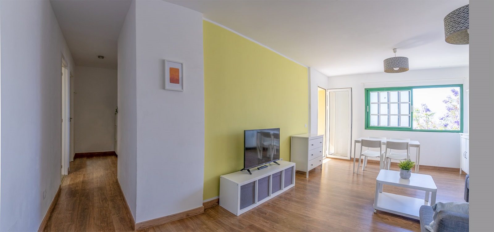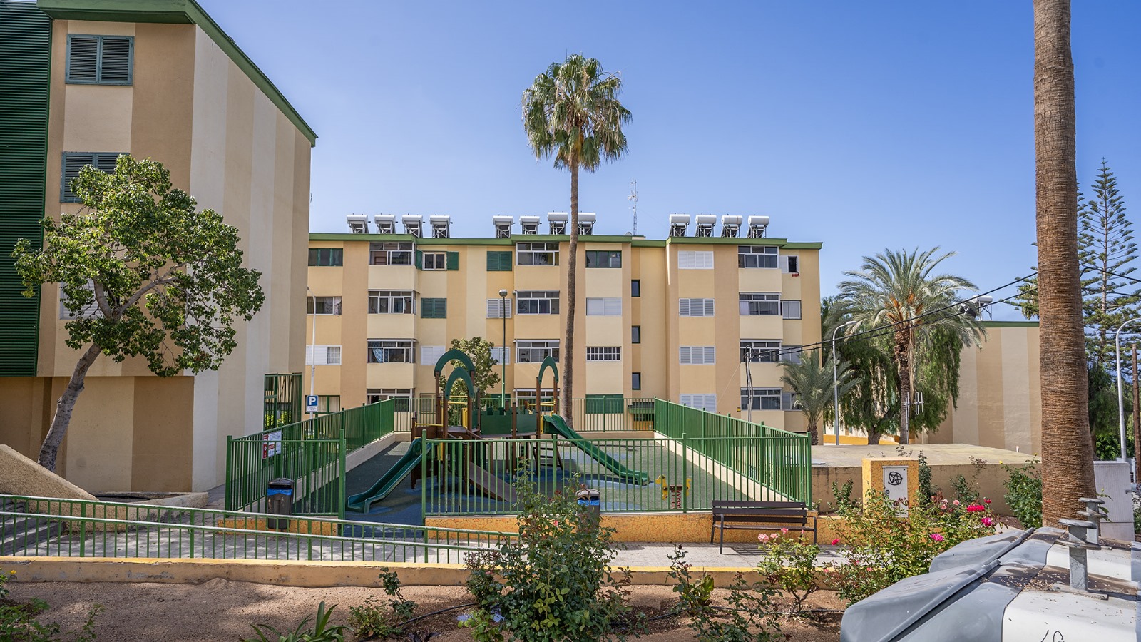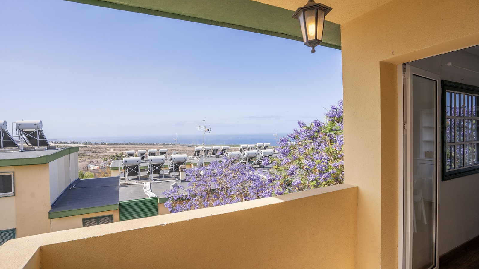 La vivienda se encuentra en un cuarto piso, y está distribuida en salón comedor con vistas despejadas hacia el mar y La Gomera, cocina independiente junto con una pequeño cuarto de lavandería. Luego a través del pasillo se encuentra la zona de noche, que cuenta con 3 habitaciones y un baño, dos de las habitaciones cuentan con vistas hacias el mar y una de ellas con vista hacia la calle interna de la urbanización adornada de altos árboles florales.