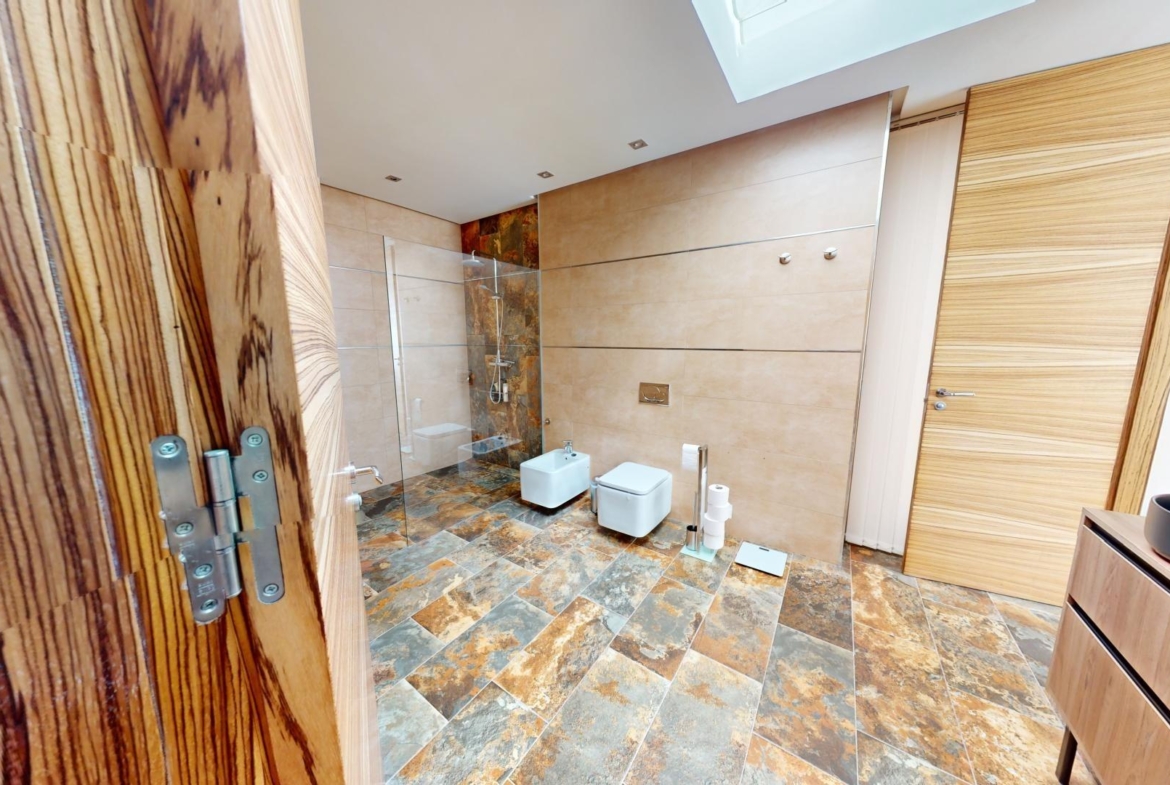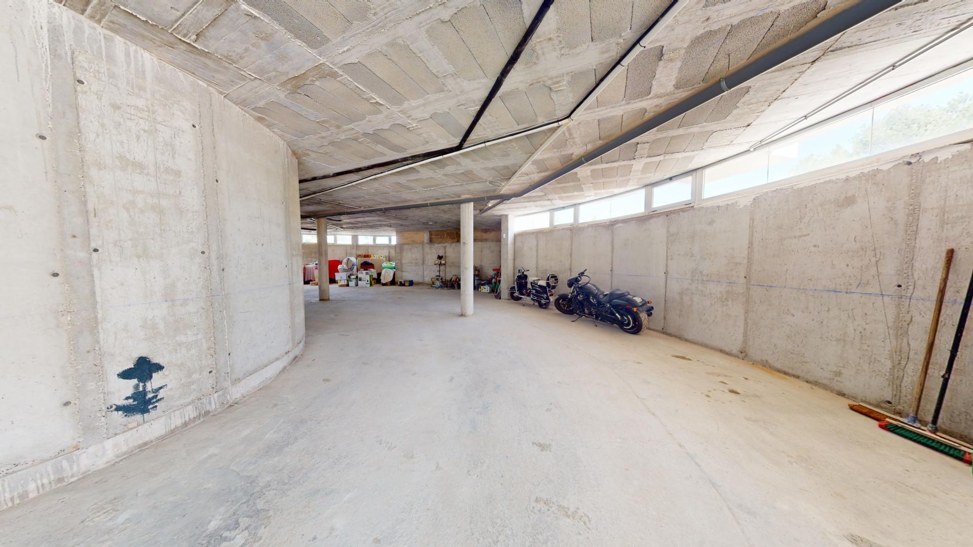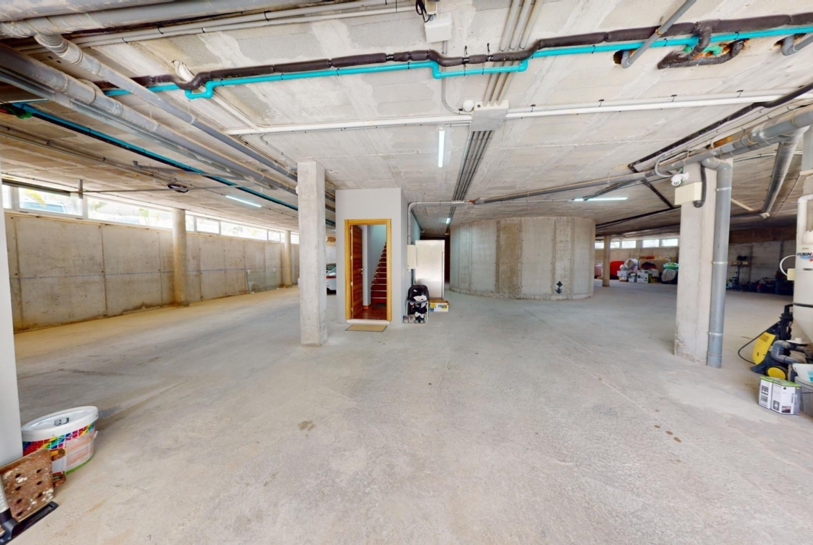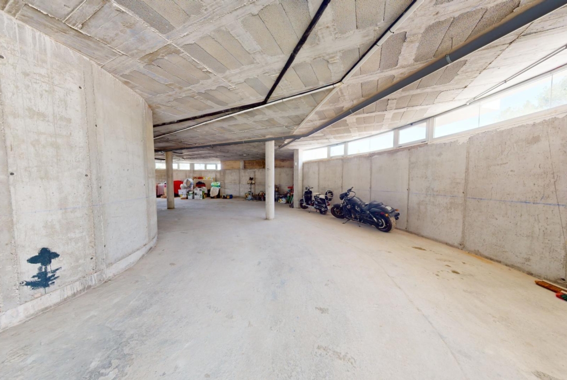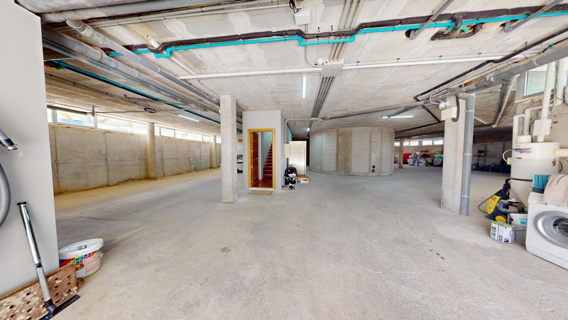 La primera planta cuenta con un gran dormitorio con baño en suite y acceso a una terraza, una sala de estar de 50 m² y una terraza en la azotea de 70 m². El sótano ofrece un área de 400 m², adecuada para un garaje para varios coches y almacenamiento.