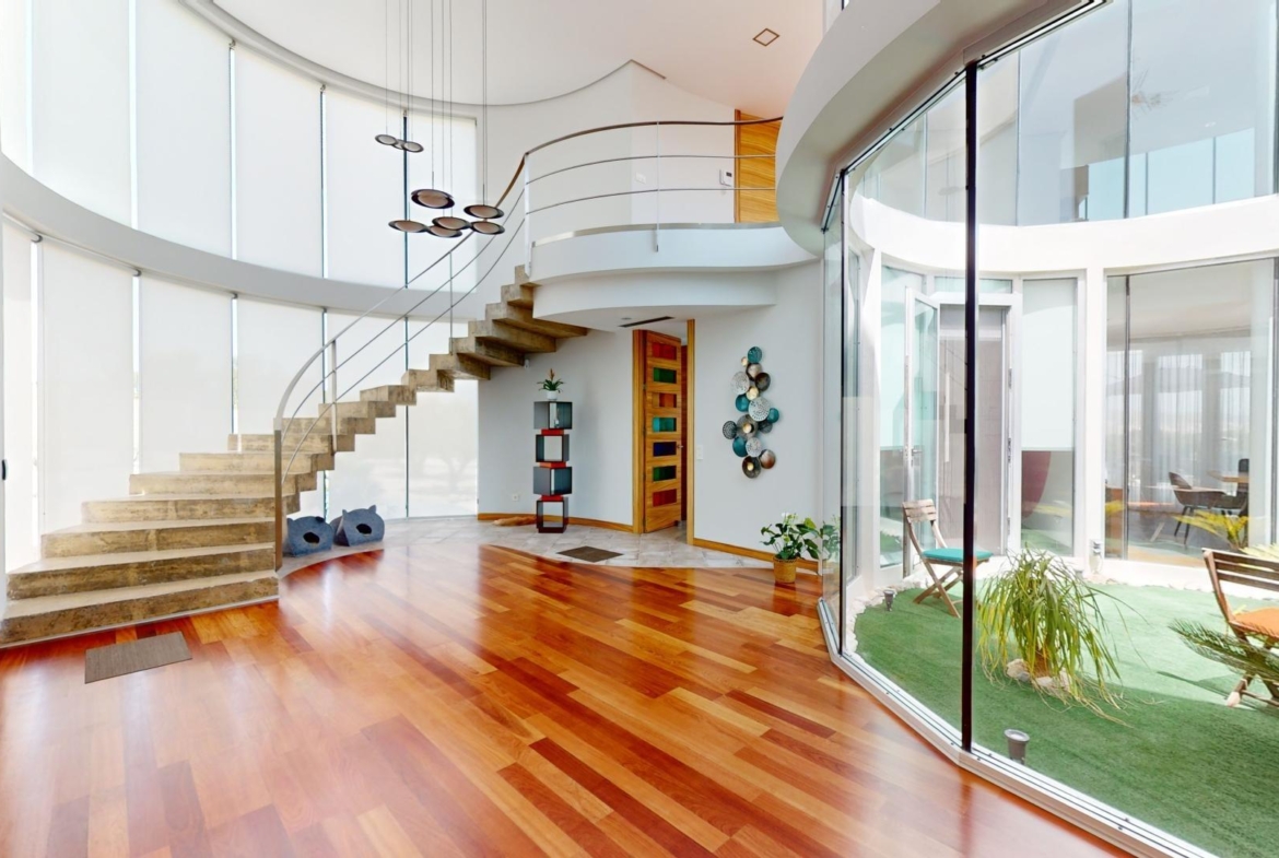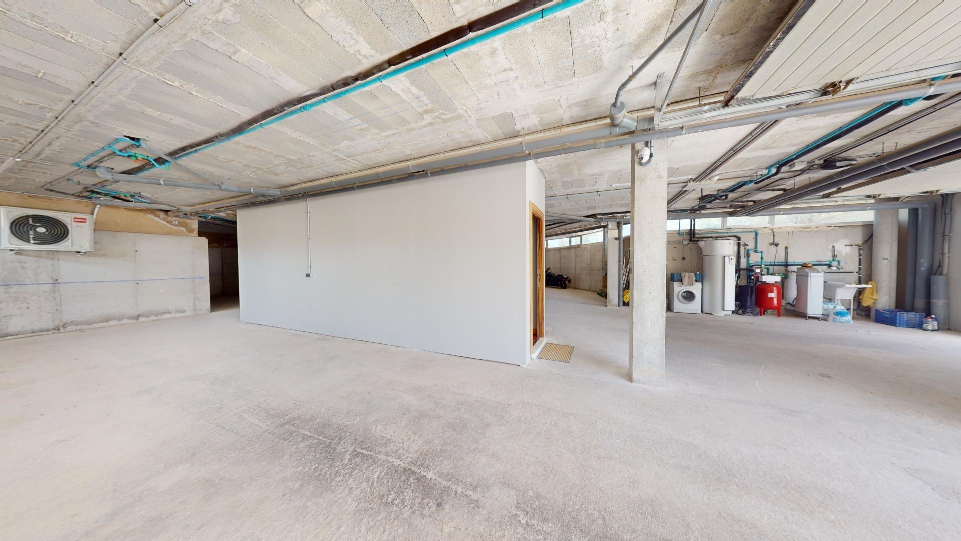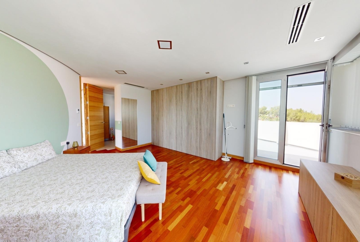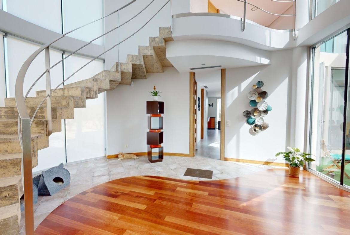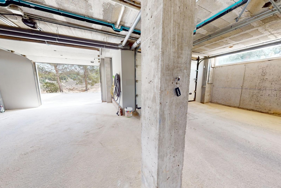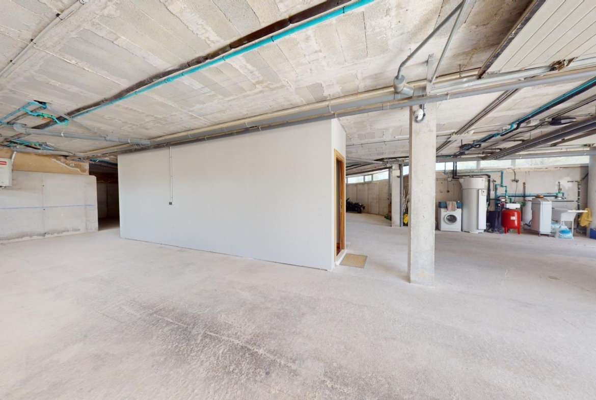 La primera planta cuenta con un gran dormitorio con baño en suite y acceso a una terraza, una sala de estar de 50 m² y una terraza en la azotea de 70 m². El sótano ofrece un área de 400 m², adecuada para un garaje para varios coches y almacenamiento.
