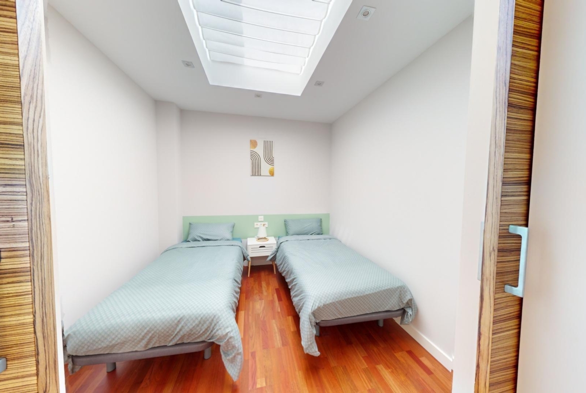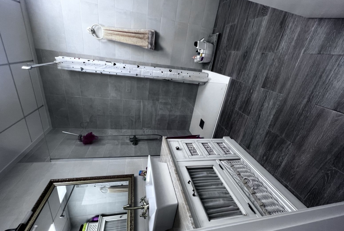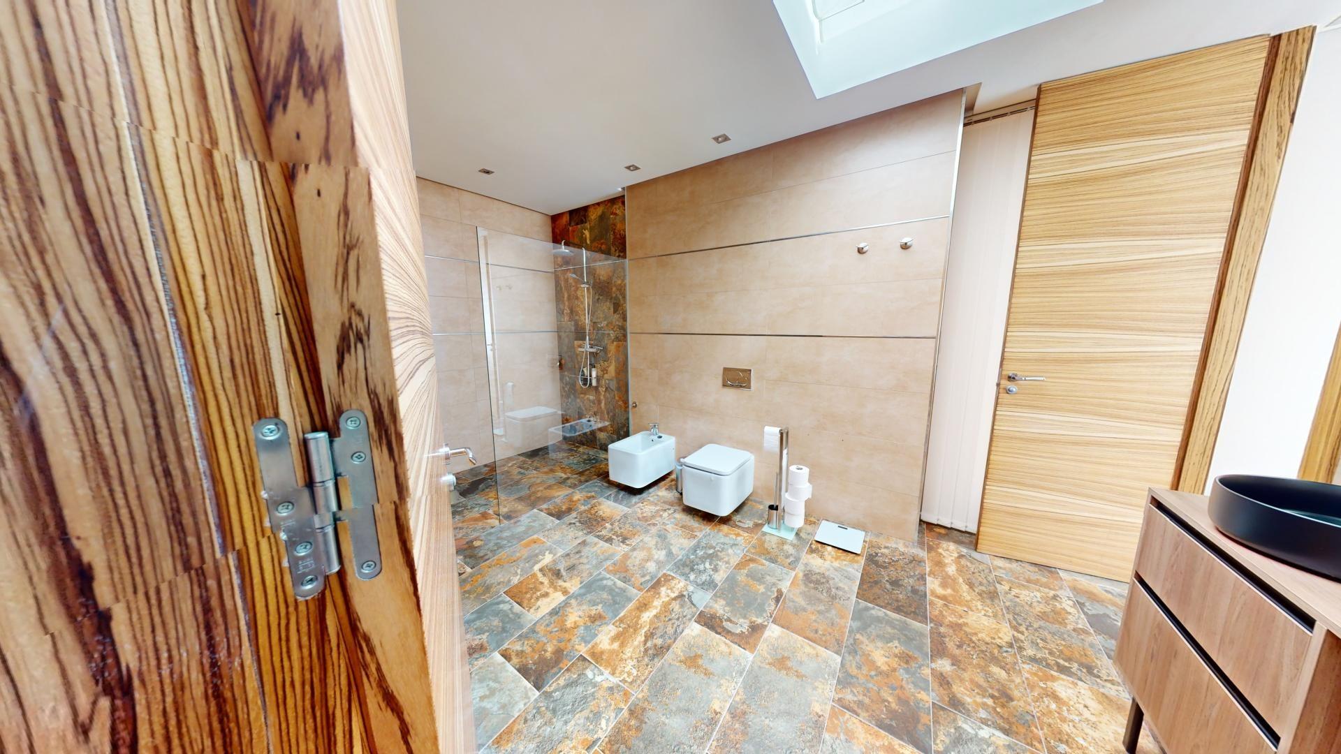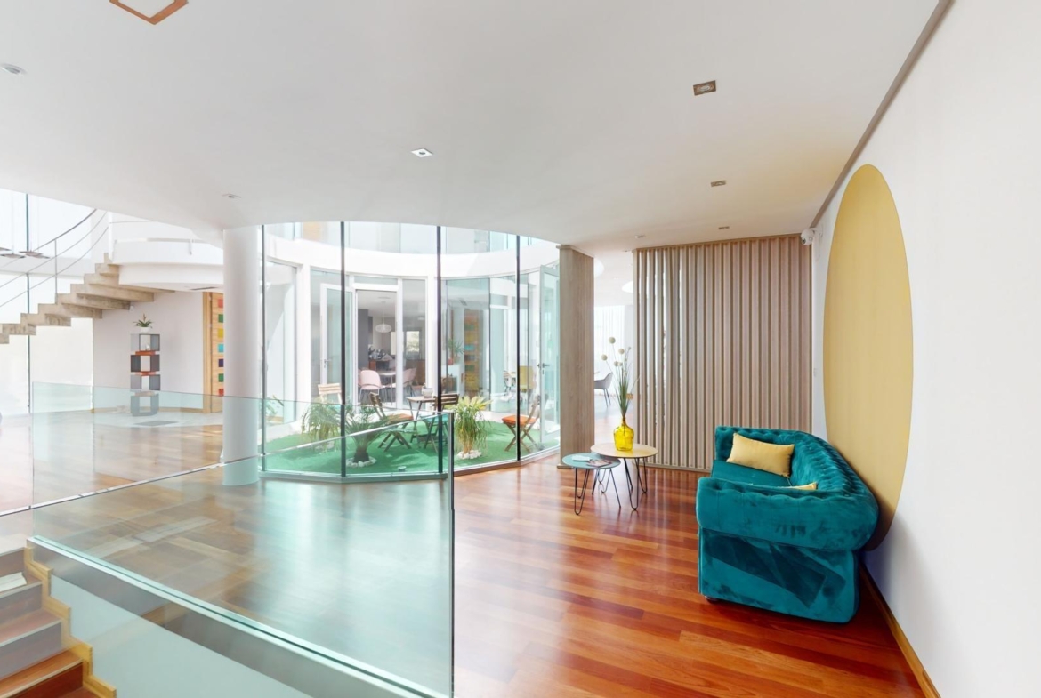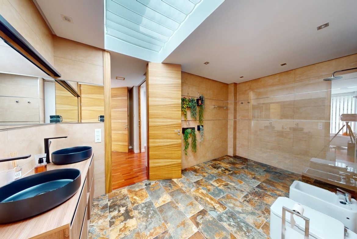 La primera planta cuenta con un gran dormitorio con baño en suite y acceso a una terraza, una sala de estar de 50 m² y una terraza en la azotea de 70 m². El sótano ofrece un área de 400 m², adecuada para un garaje para varios coches y almacenamiento.