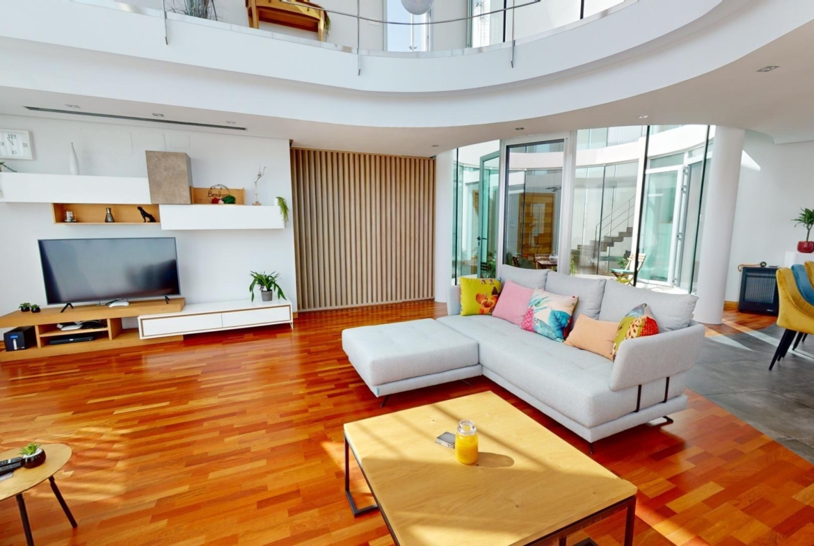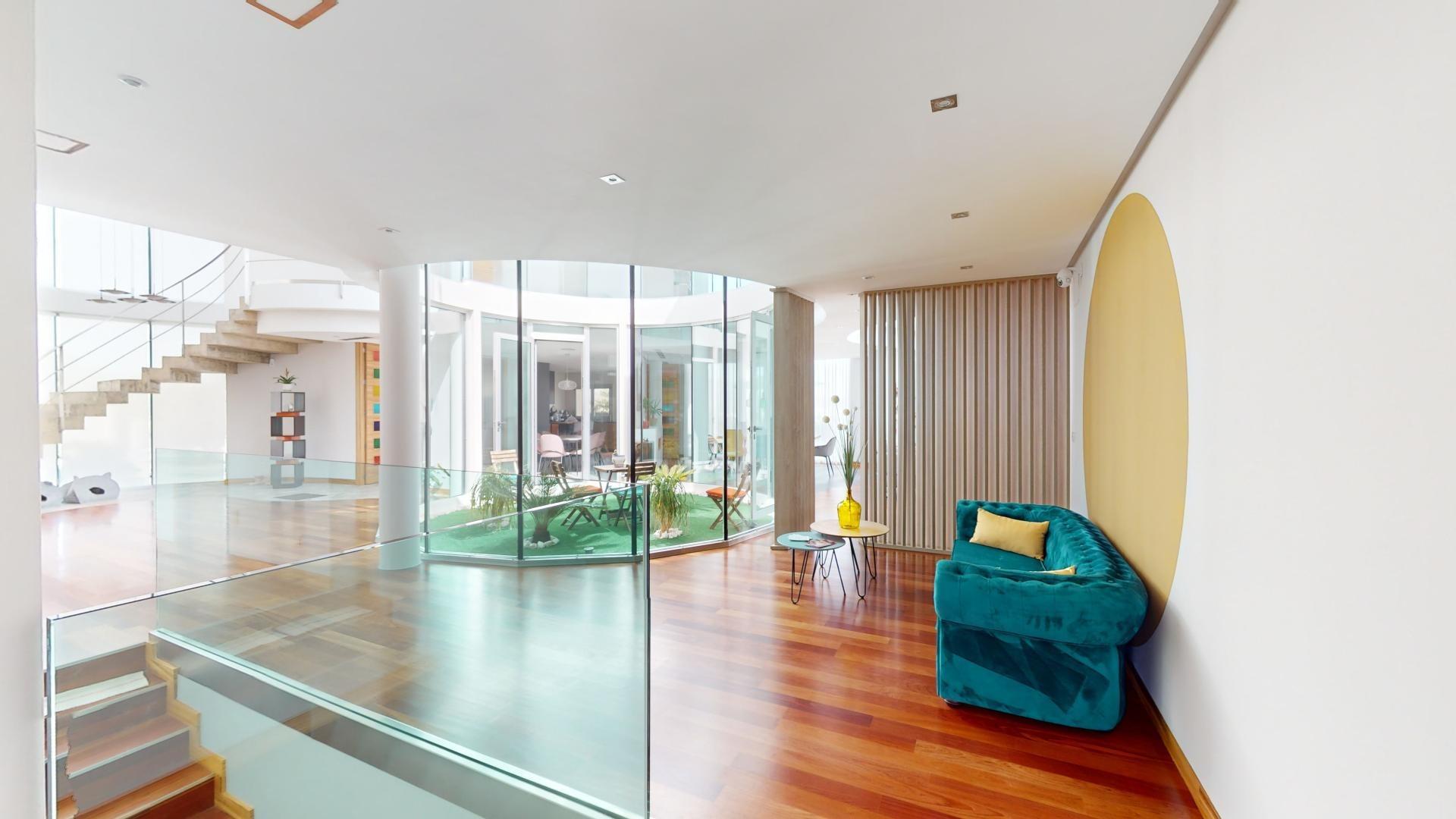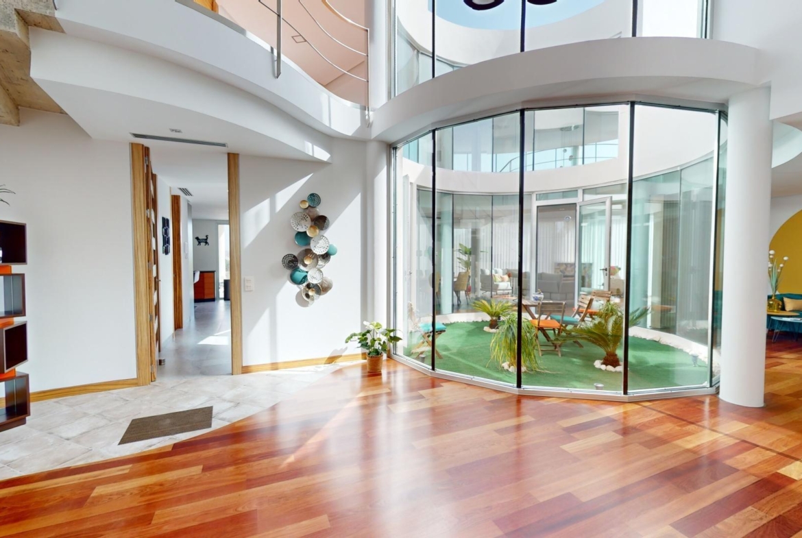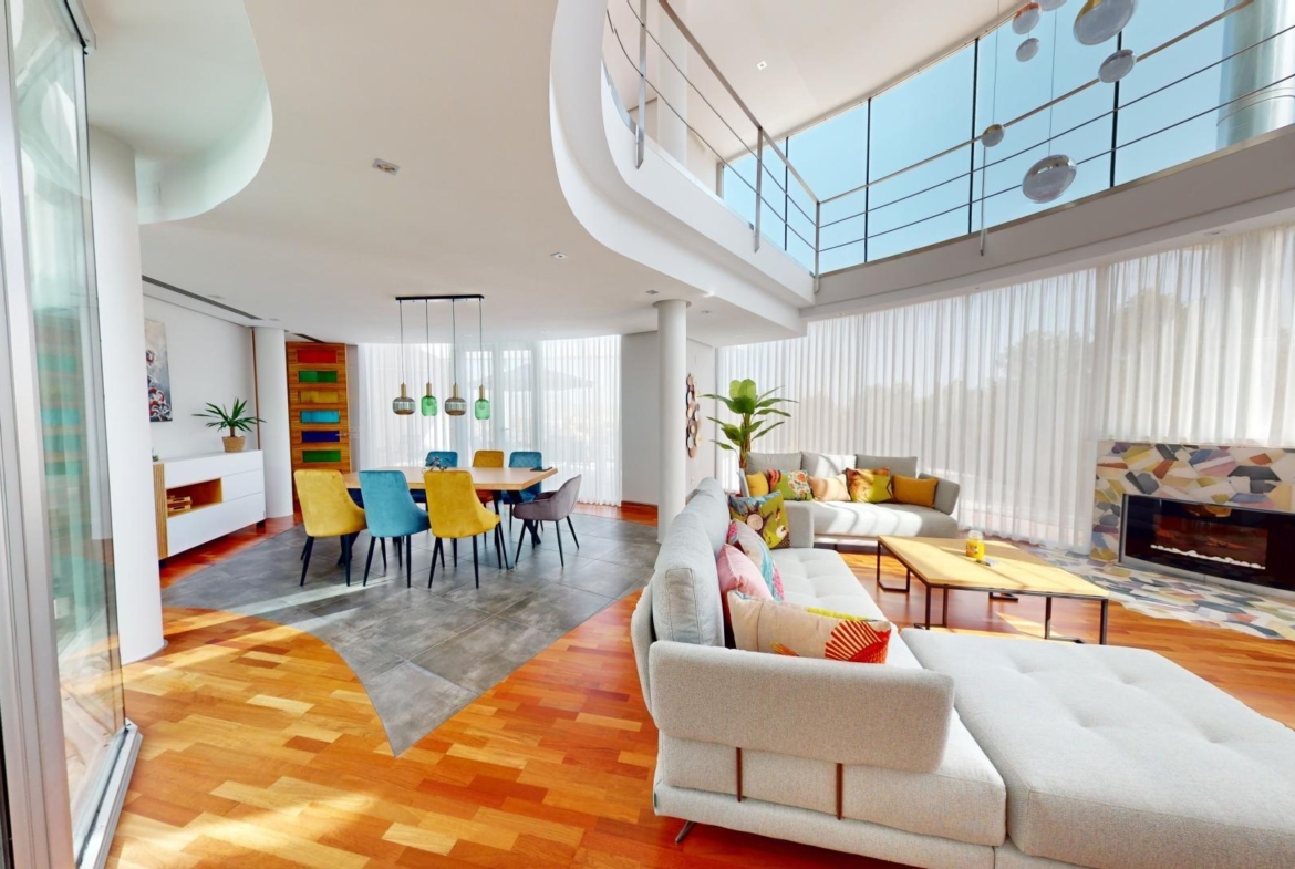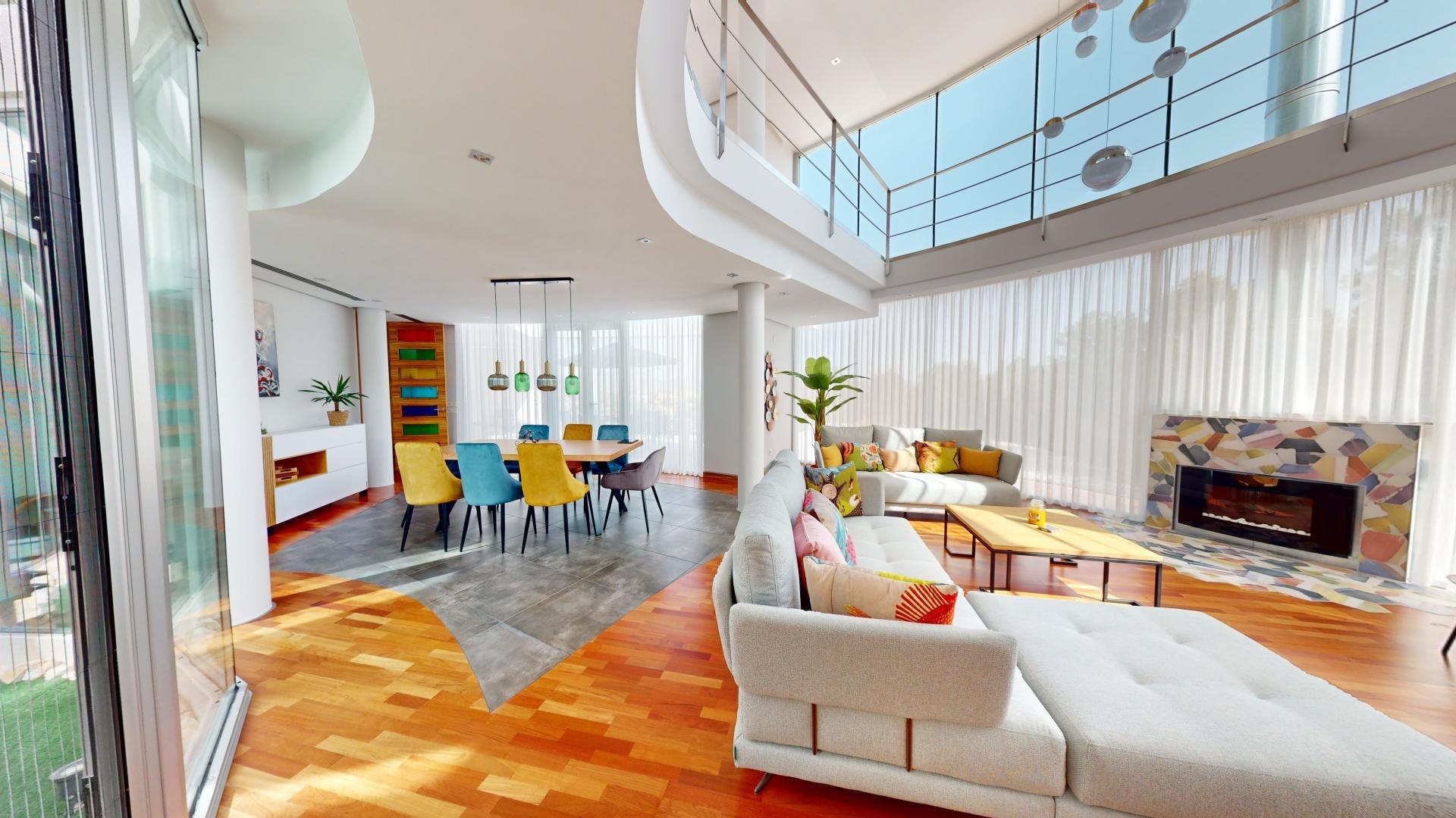 La sala de estar principal tiene 70 m², y hay dos salas de estar adicionales, cada una de 50 m². La cocina independiente está equipada con los últimos electrodomésticos. La villa también cuenta con una piscina de 85 m².