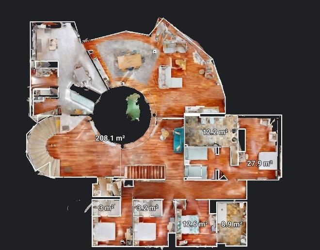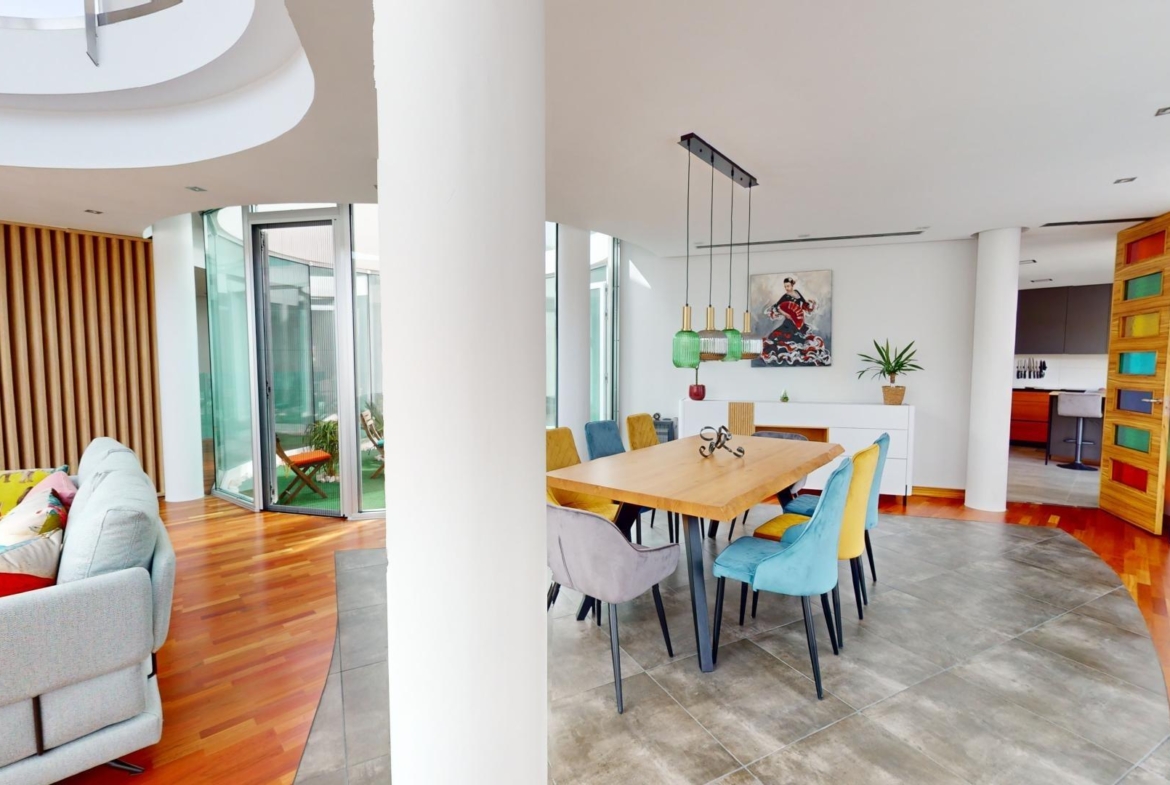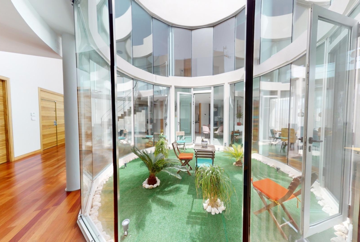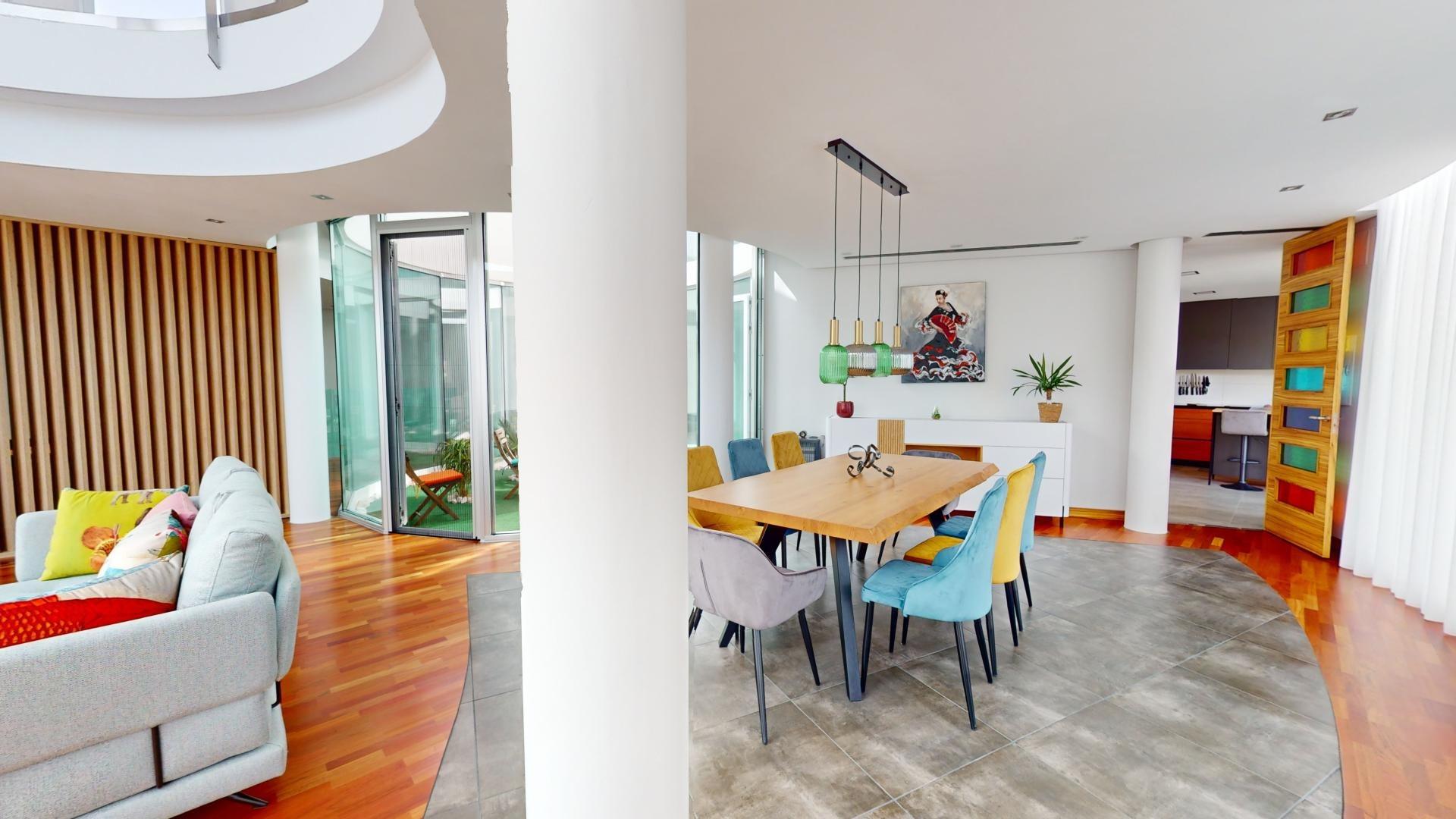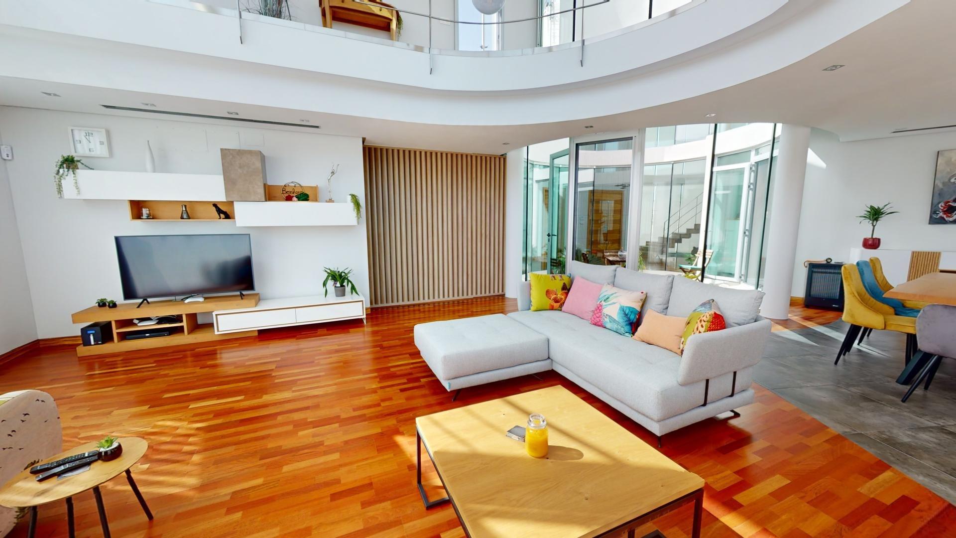 La sala de estar principal tiene 70 m², y hay dos salas de estar adicionales, cada una de 50 m². La cocina independiente está equipada con los últimos electrodomésticos. La villa también cuenta con una piscina de 85 m².
