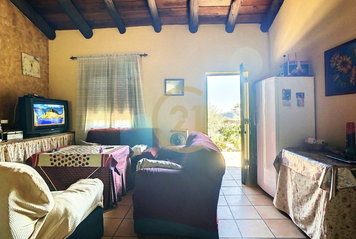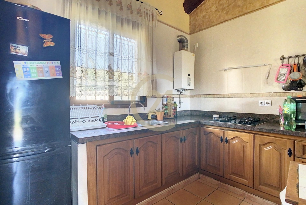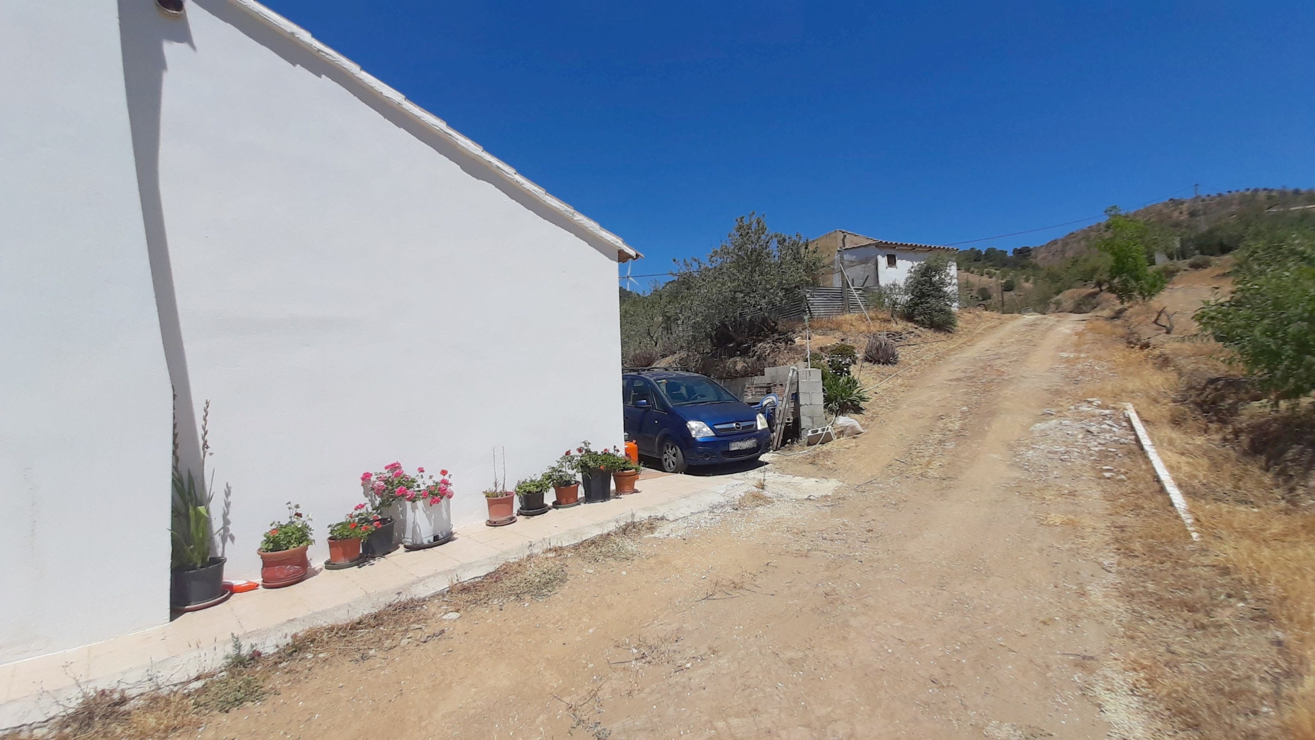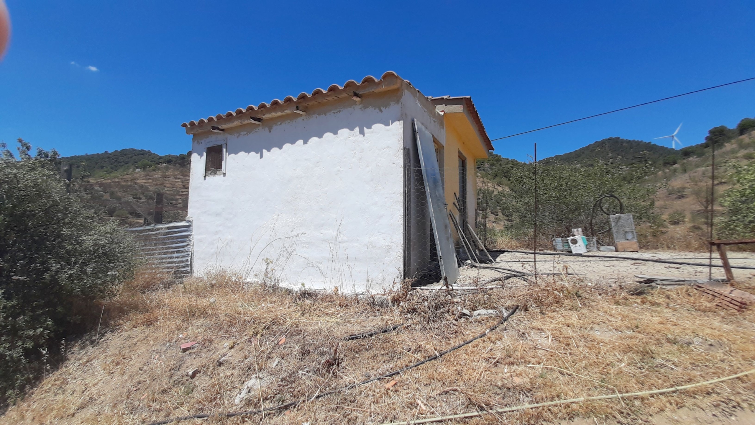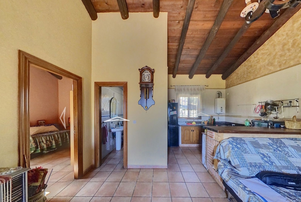 Además la finca dispone de un almacén de 21 m2 con anexo gallinero y espacio suficiente para estacionar varios vehículos. La electricidad es de la red y el agua es corriente, llega desde el pueblo. También tiene agua de pozo para los árboles y cuenta con un depósito de agua y una piscina de plástico abierta utilizada como depósito. Siempre hay agua para todas las necesitades.
