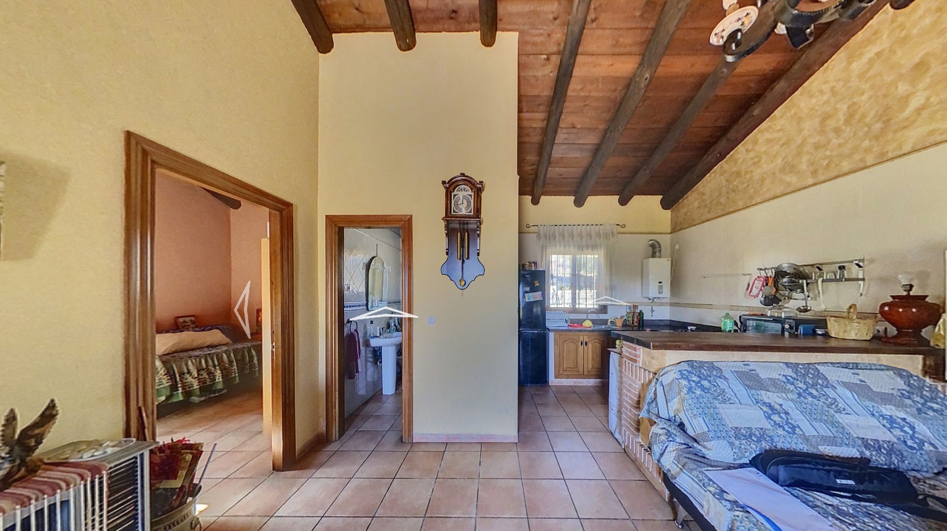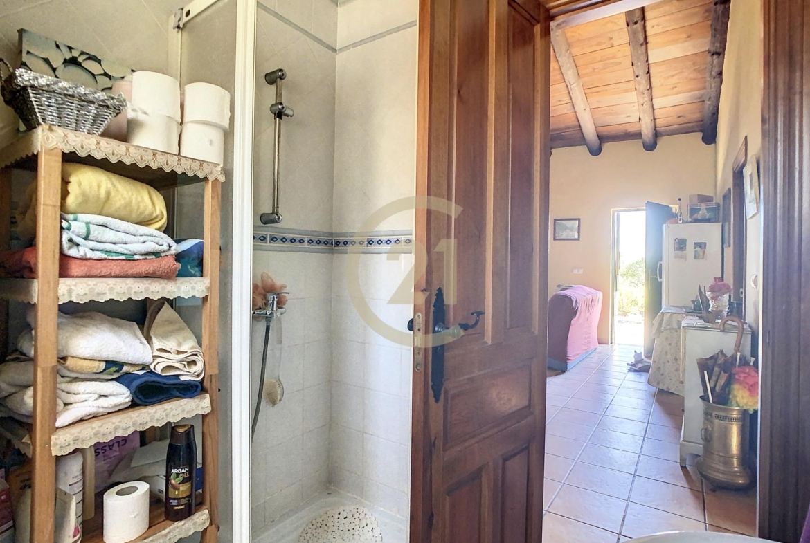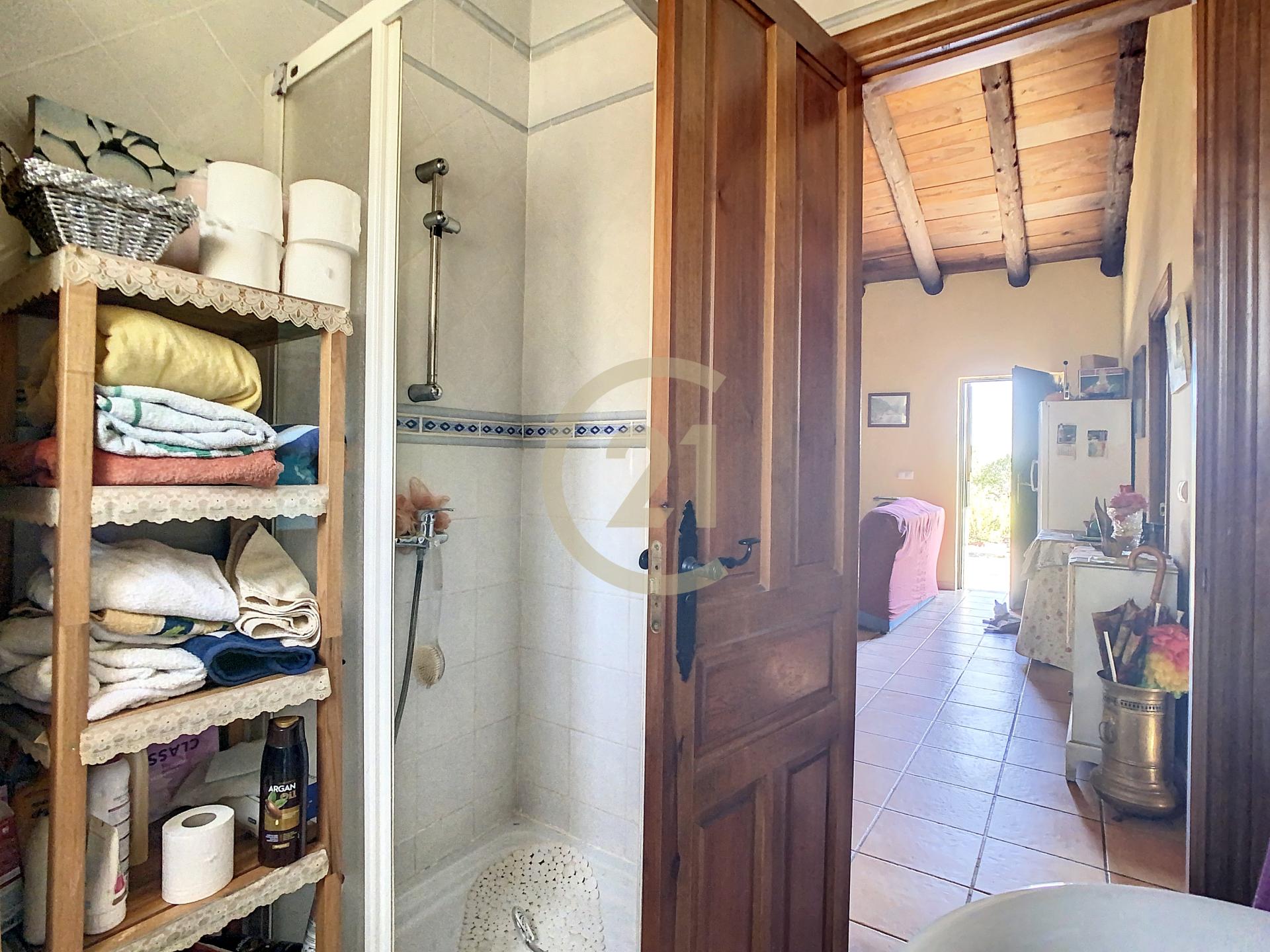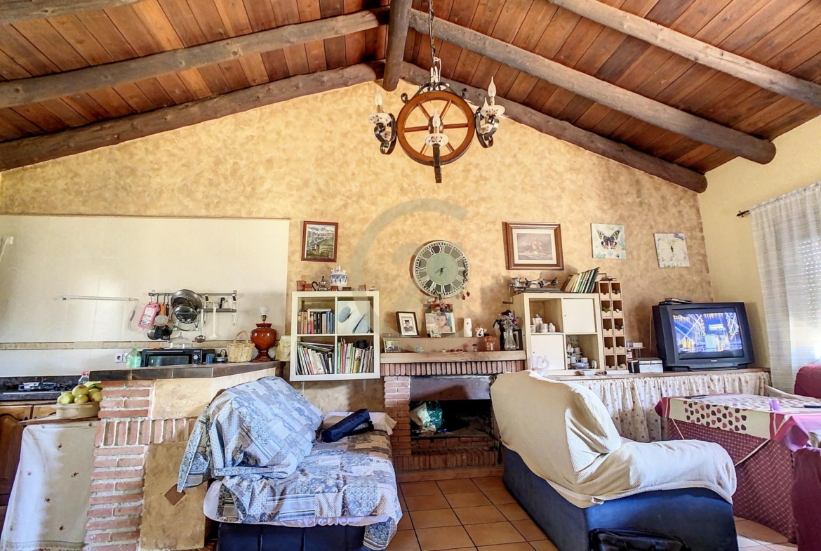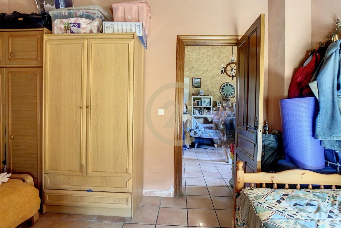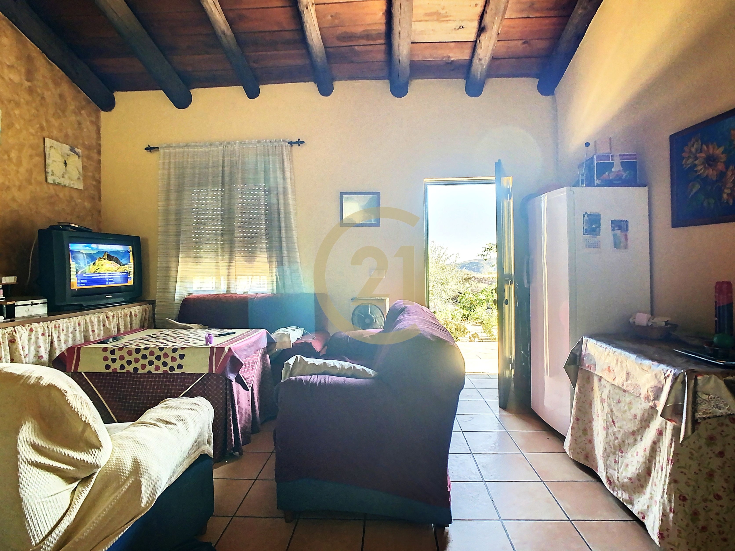 Además la finca dispone de un almacén de 21 m2 con anexo gallinero y espacio suficiente para estacionar varios vehículos. La electricidad es de la red y el agua es corriente, llega desde el pueblo. También tiene agua de pozo para los árboles y cuenta con un depósito de agua y una piscina de plástico abierta utilizada como depósito. Siempre hay agua para todas las necesitades.
